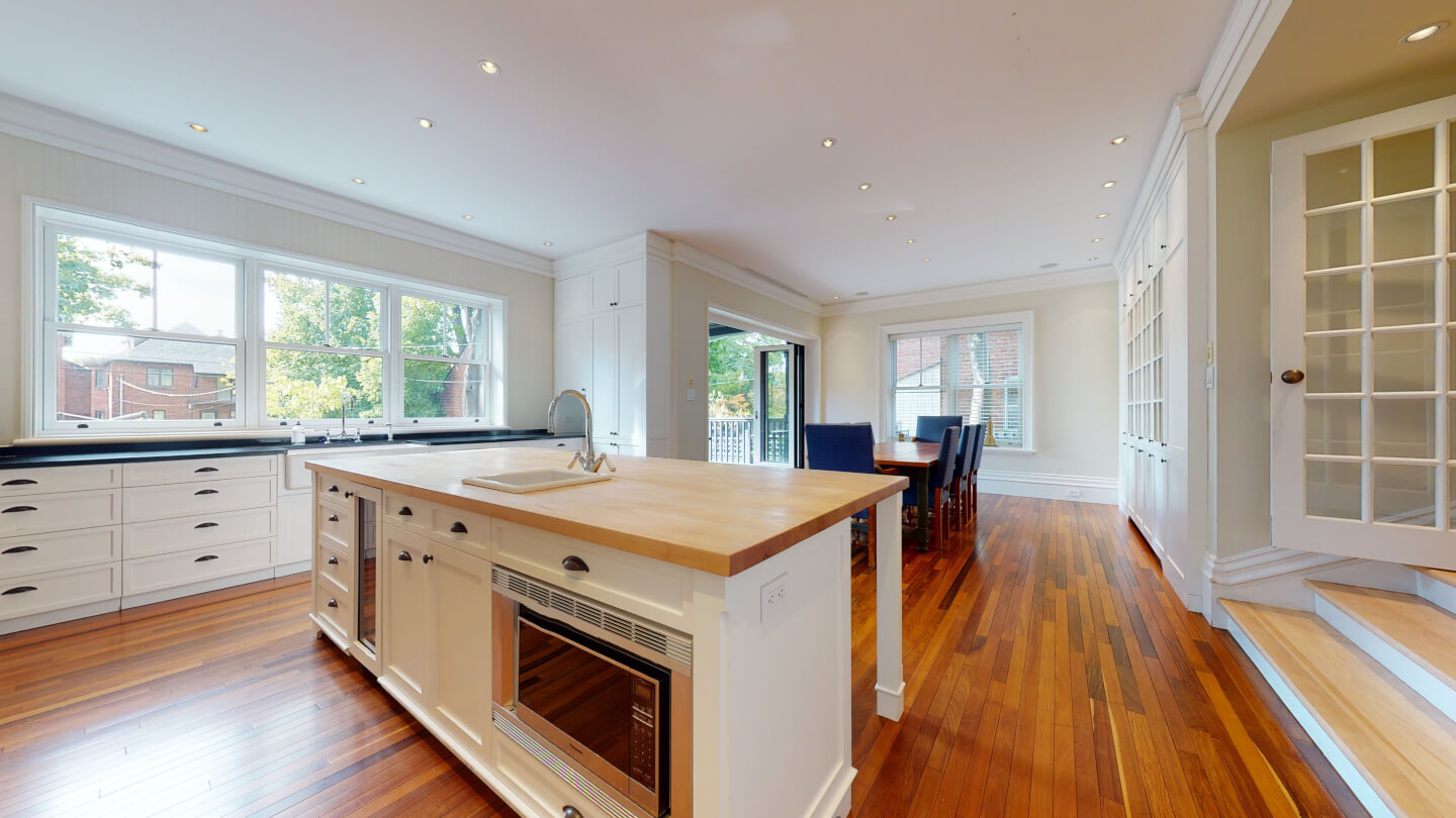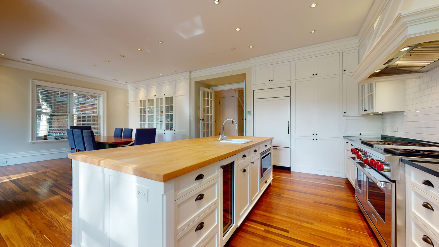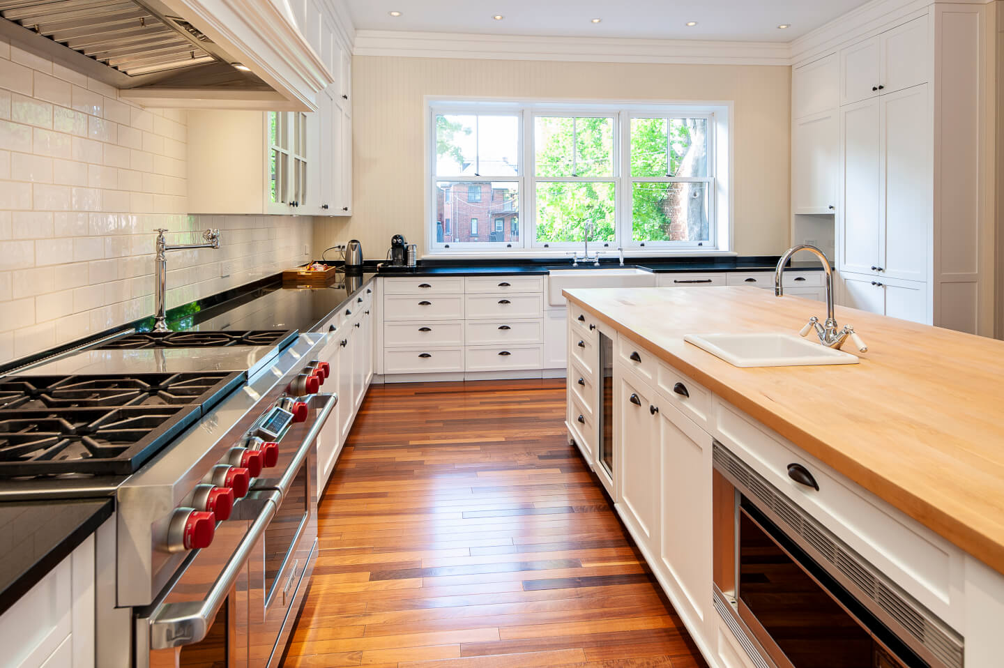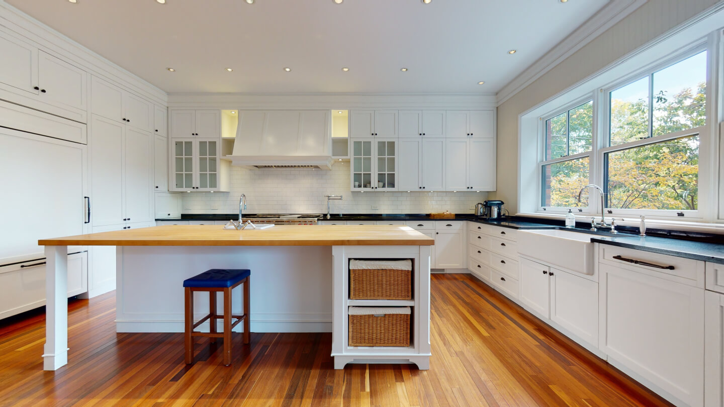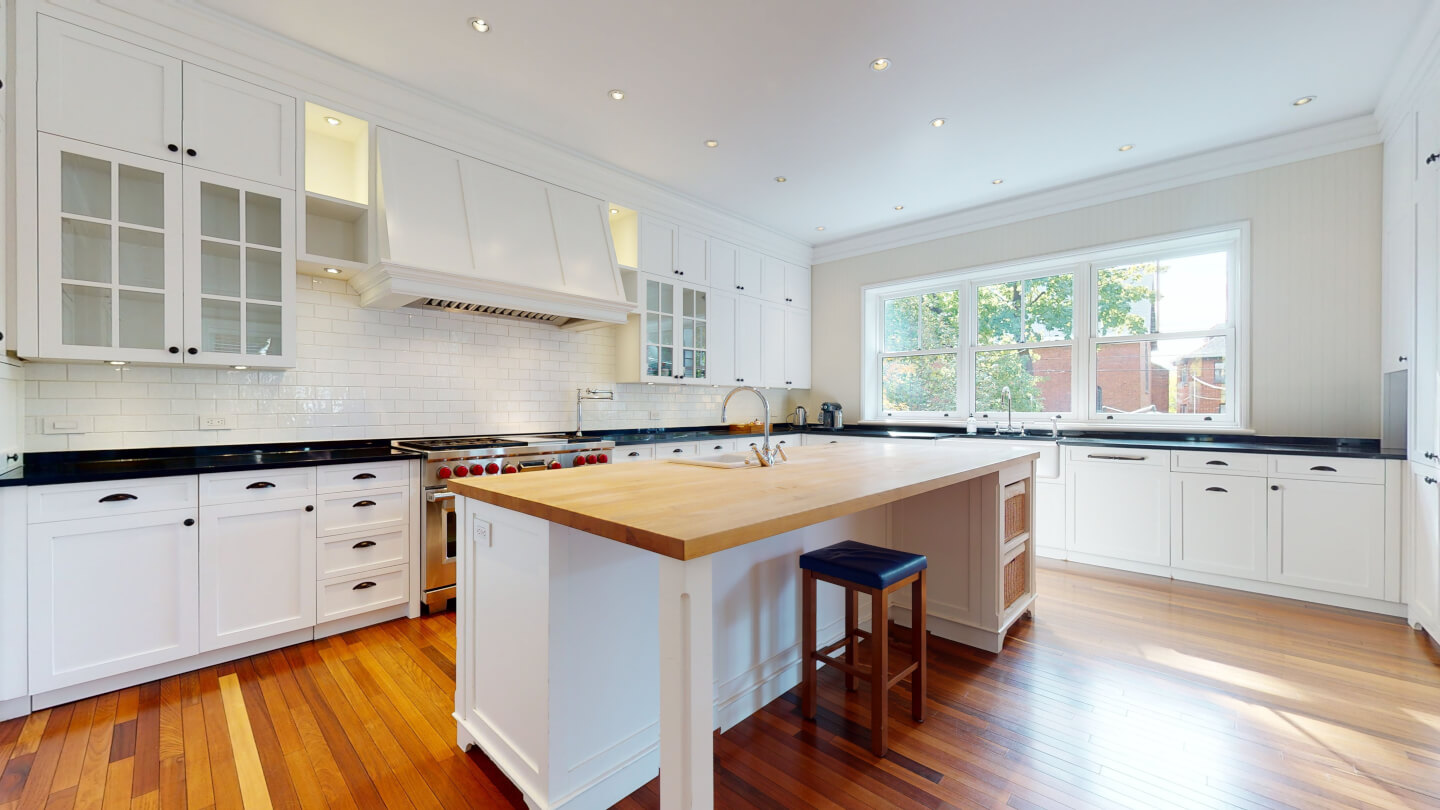 Immense cuisine haut de gamme, comptoir de granit et de bois, vue imprenable sur le jardin, la piscine, l’église et le presbytère