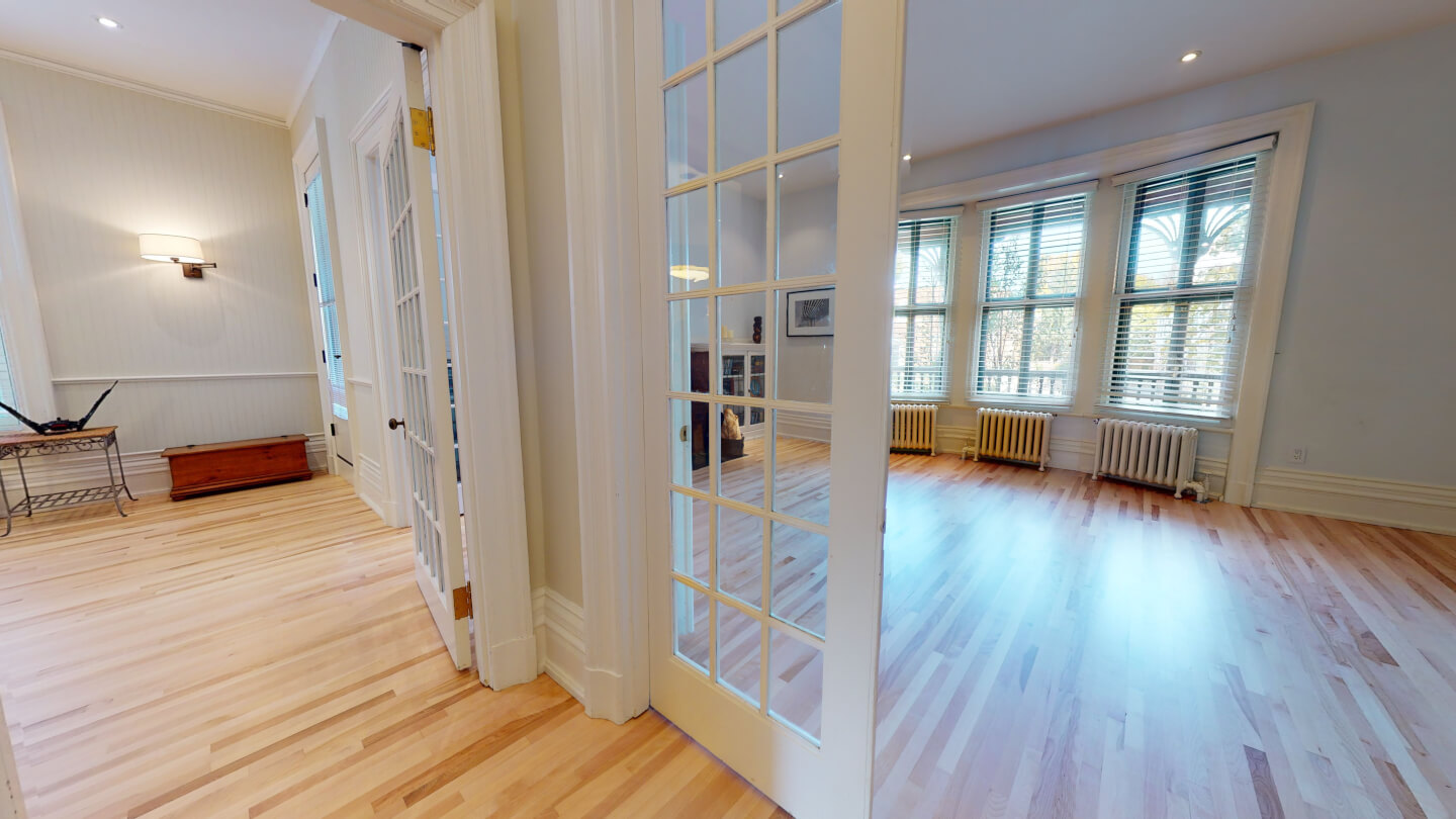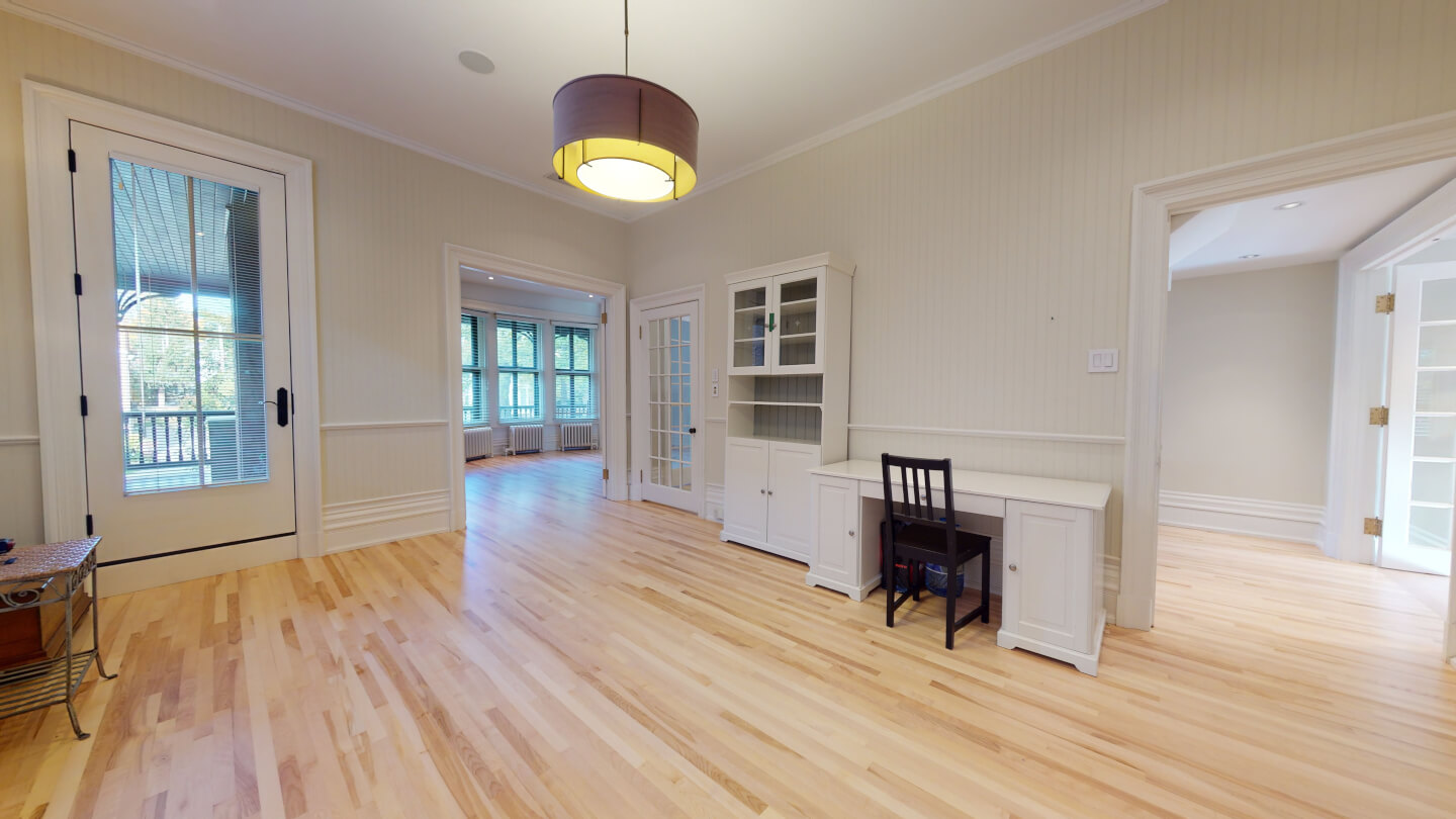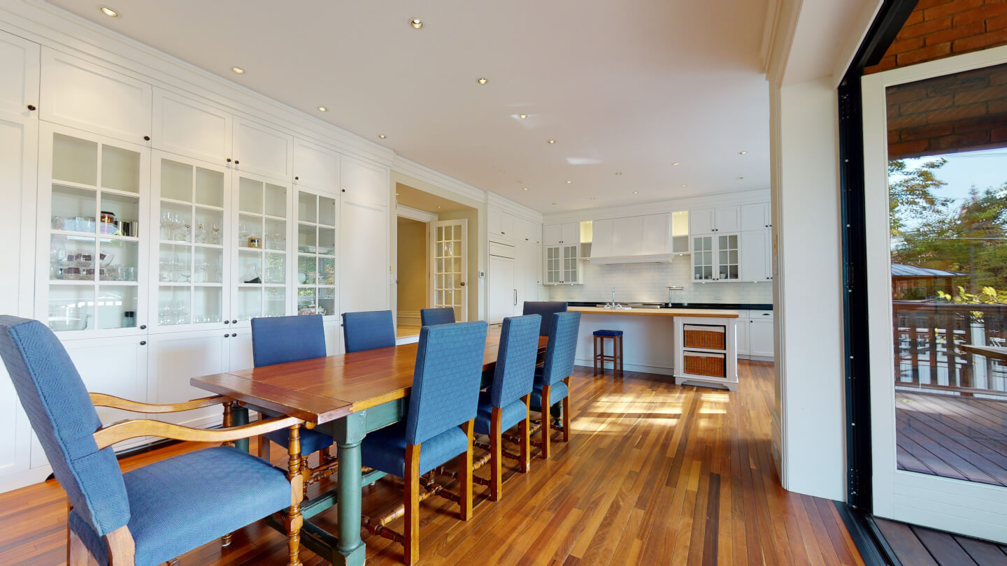 Salle de musique / salle à manger formelle, murs de lambris, accès à la véranda