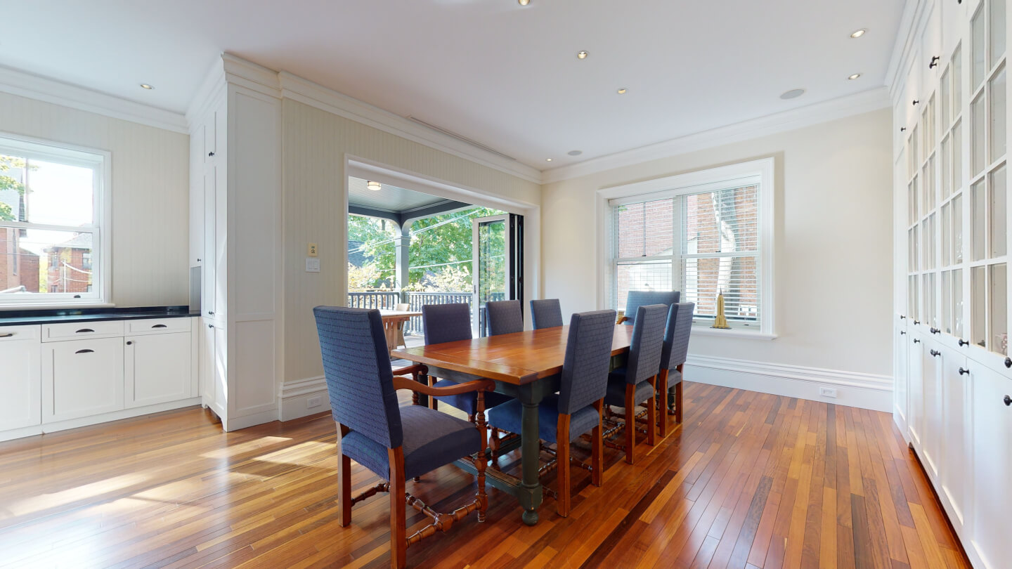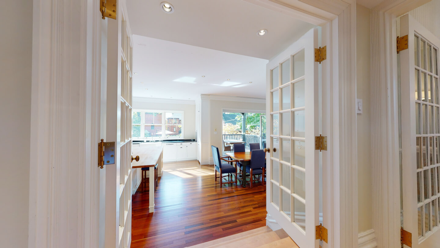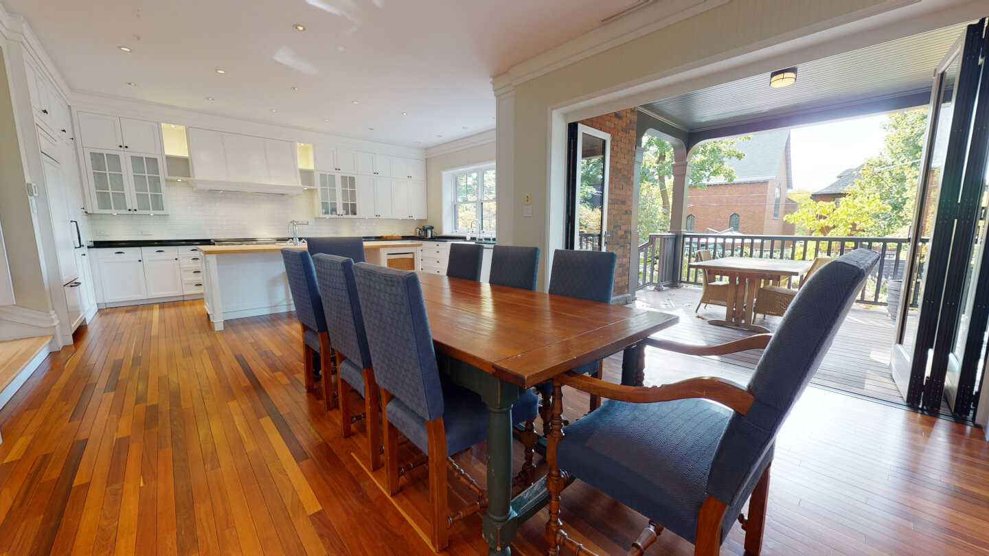 Salle de musique / salle à manger formelle, murs de lambris, accès à la véranda