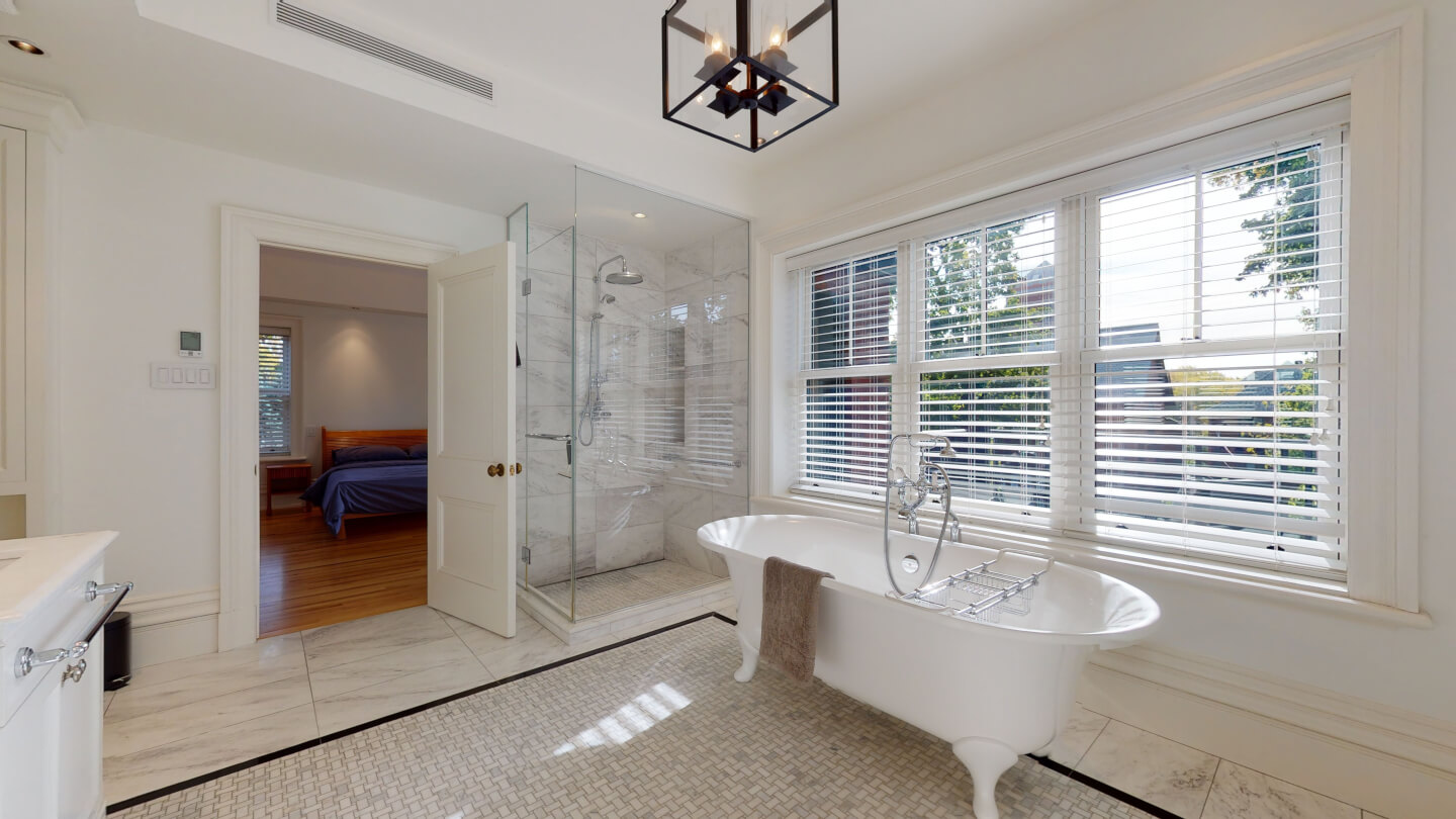 Chambre parentale, toit cathédrale de 15 pieds, immense salle de bains attenante (Ensuite) en marbre, lavabo double, douche séparée, planchers radiants, chambre /walk-in, terrasse en ipé