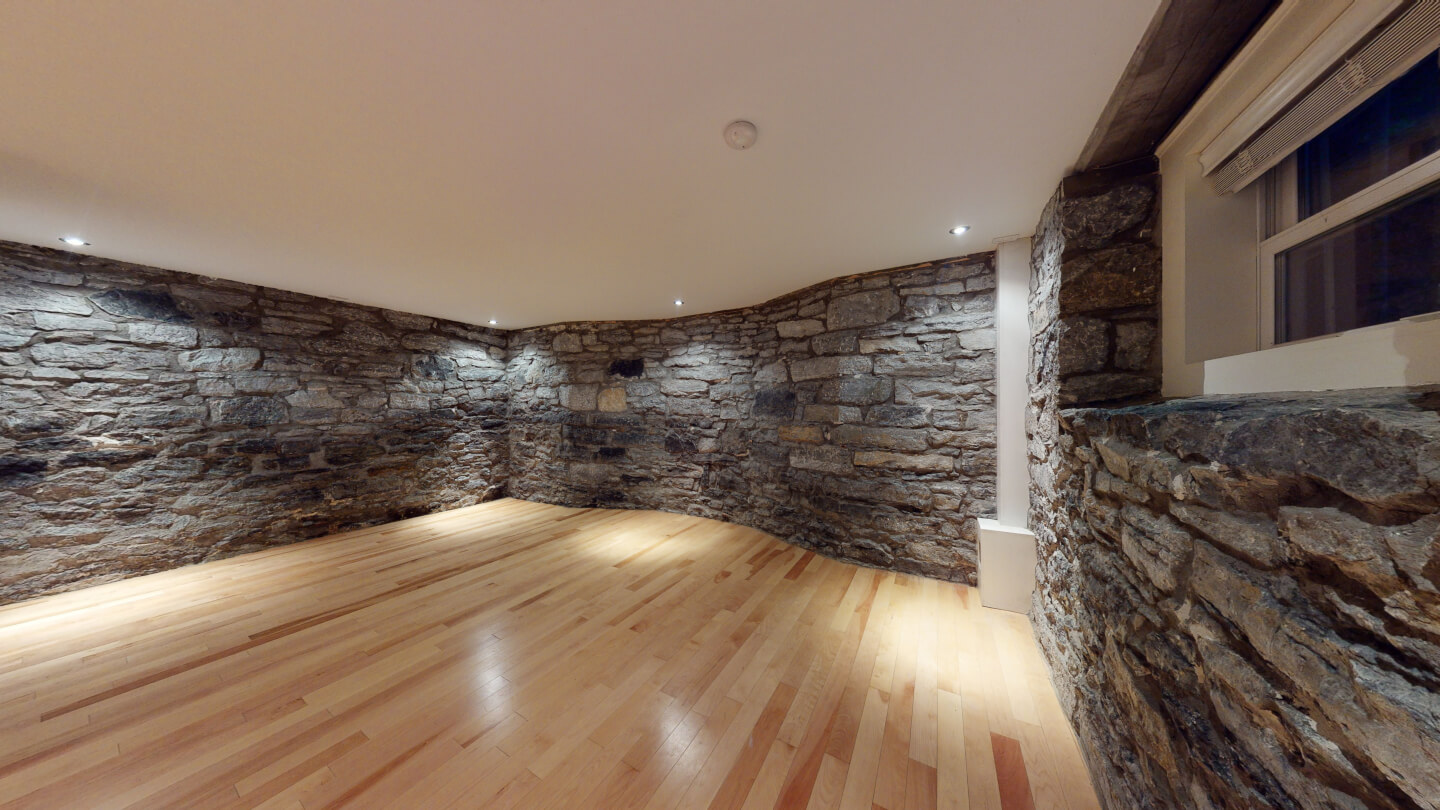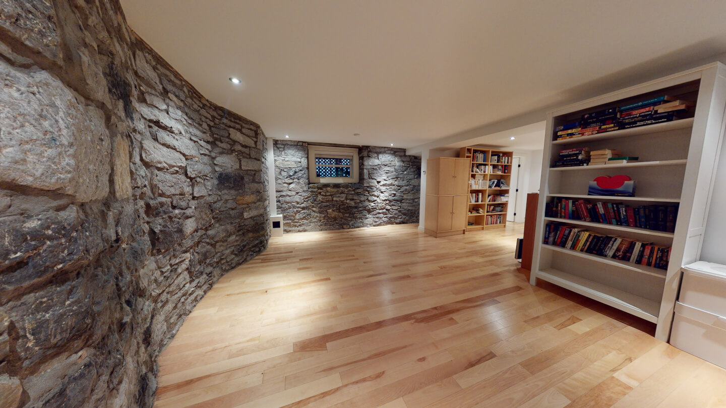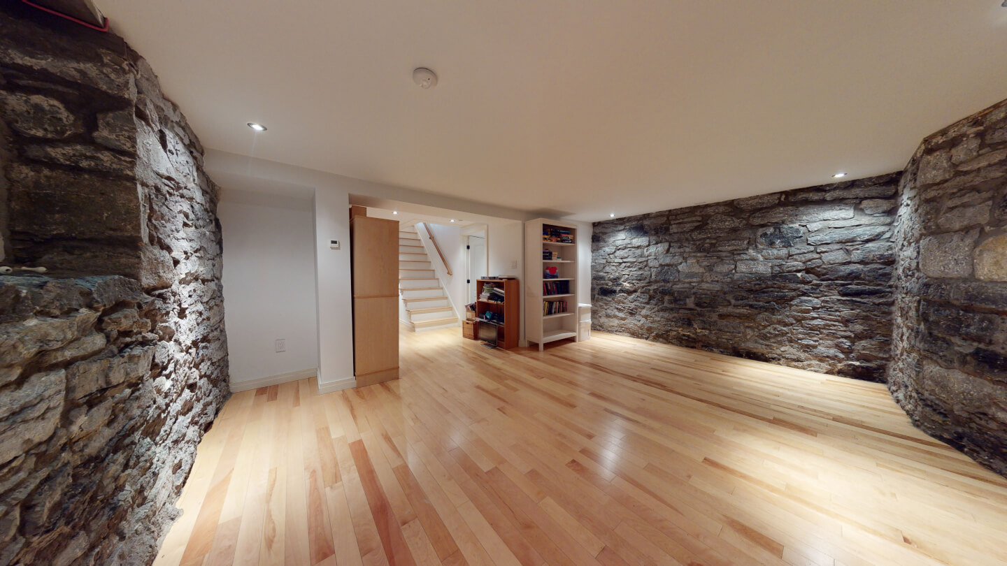 S-sol fini, avec plancher de bois Hauteur 7’ & 7’-7’’ Salle familiale, magnifique mur de pierre exposé 5ième CÀC, SDB Ensuite, planchers chauffant, walk-in/dressing + garde-robe Cave à vin Salle de lavage/2 salles mécaniques + rangement