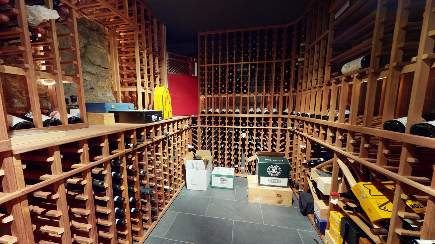 Sous-sol; laveuse, sécheuse, frigo, congélateur, rangements sur mesure de la cave à vin