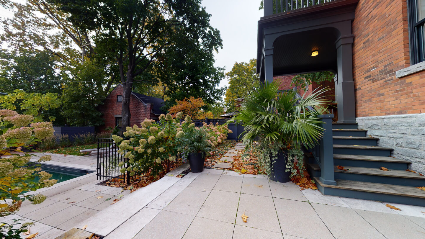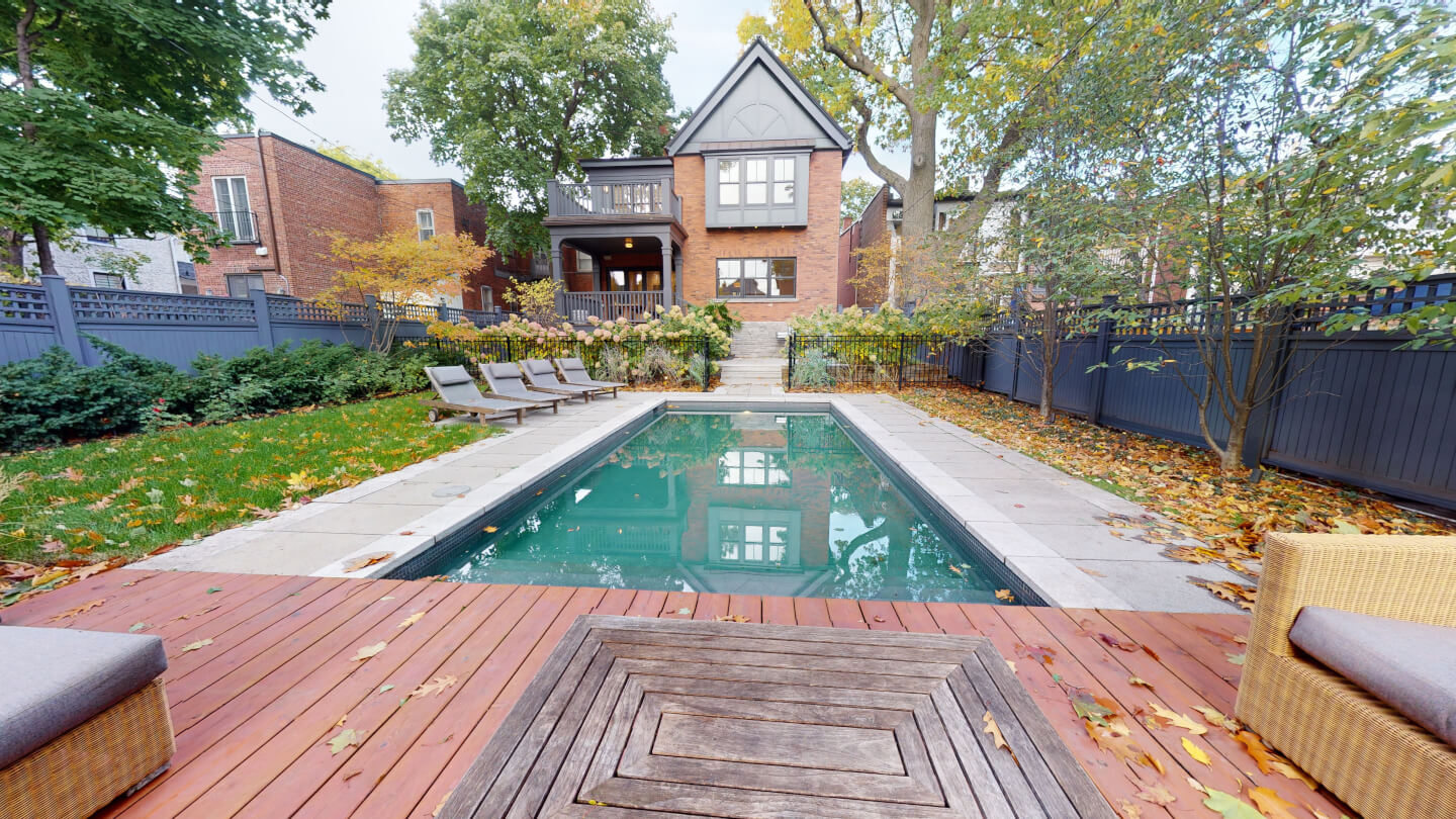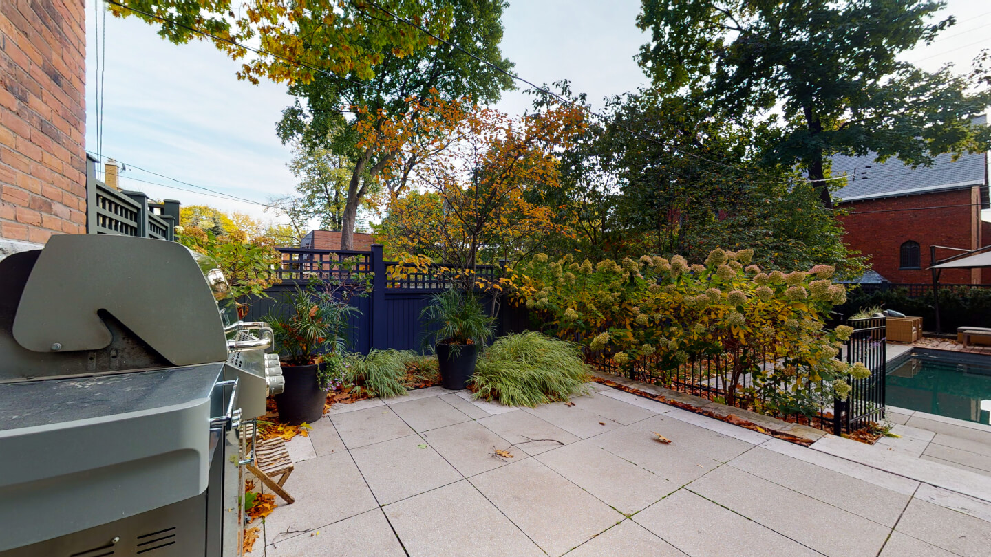 Terrasse en ipé privée, couverte, 4 portes surdimensionnées rétractables offrant une vue non obstruée menant au jardin privé paysager et à sa piscine
