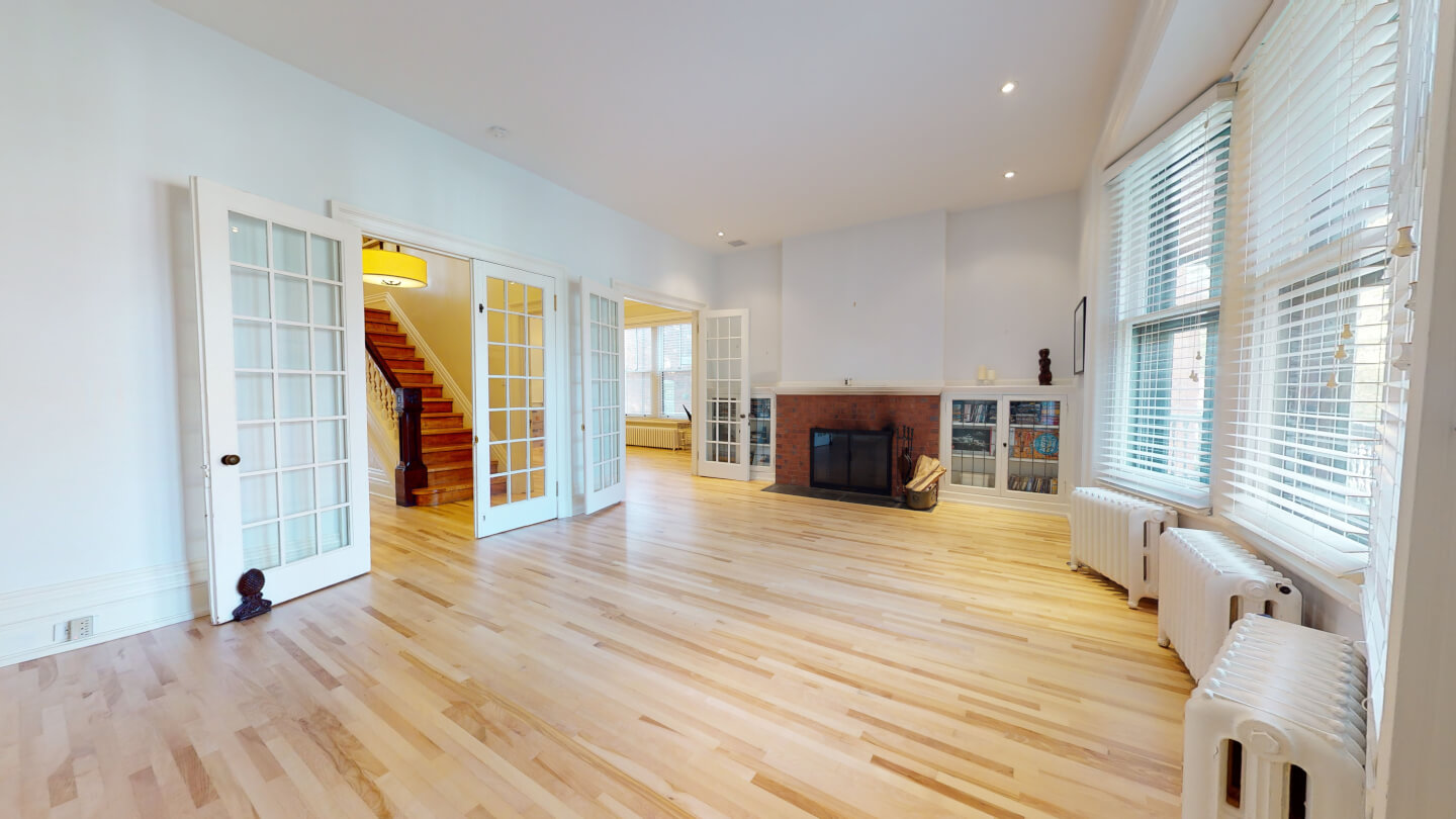 Élégant salon, fenestration en baie, encastrés, portes françaises (foyer - conduit de cheminée complètement reconstruit en 2012)