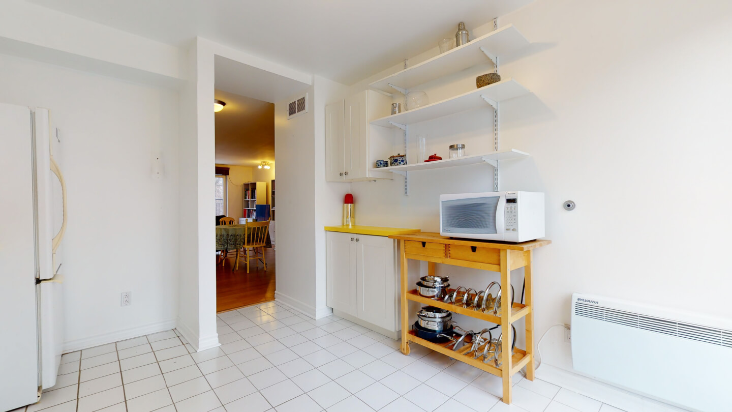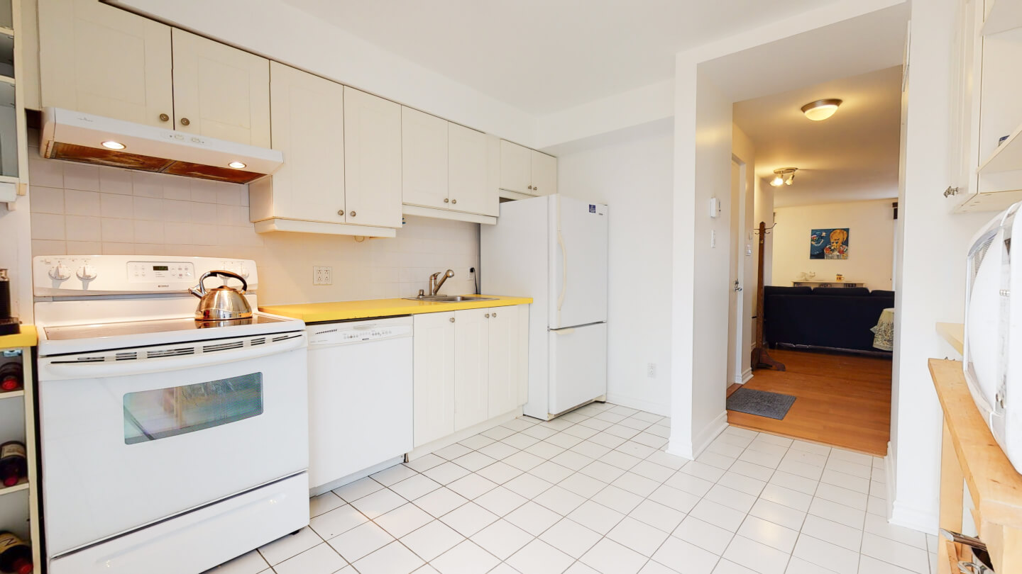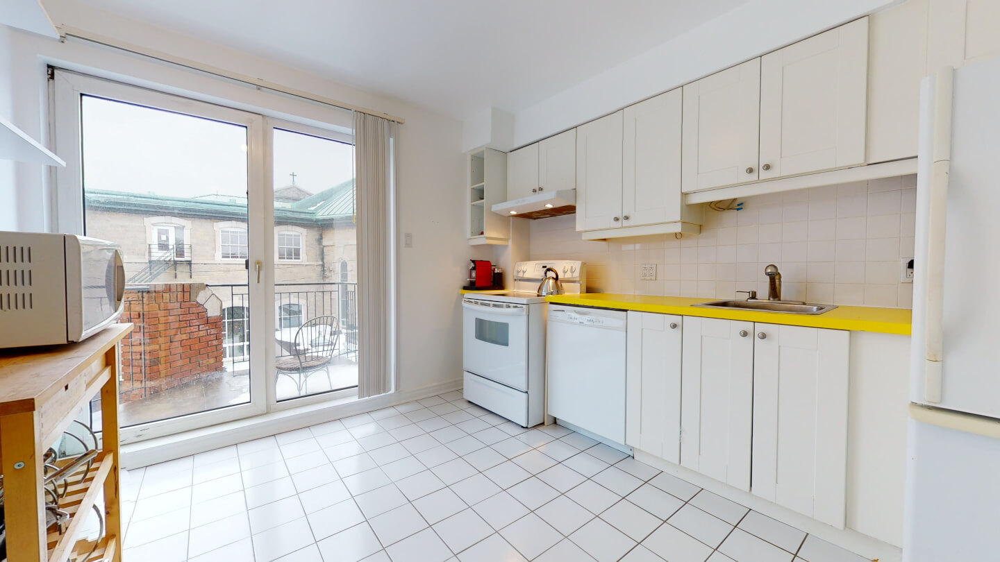 Cuisine lumineuse, plancher céramique, porte patio, balcon
