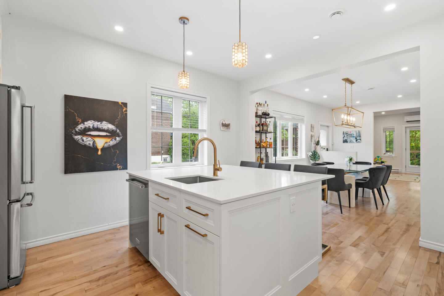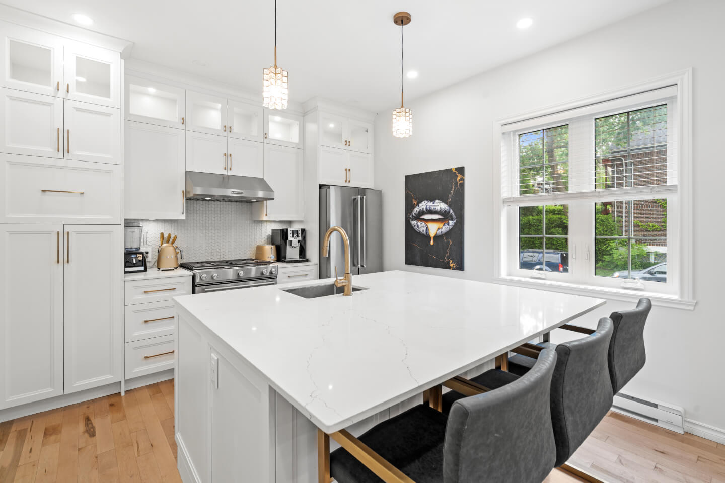 Cuisine neuve impeccable avec grand ilot, comptoir de quartz et plancher céramique