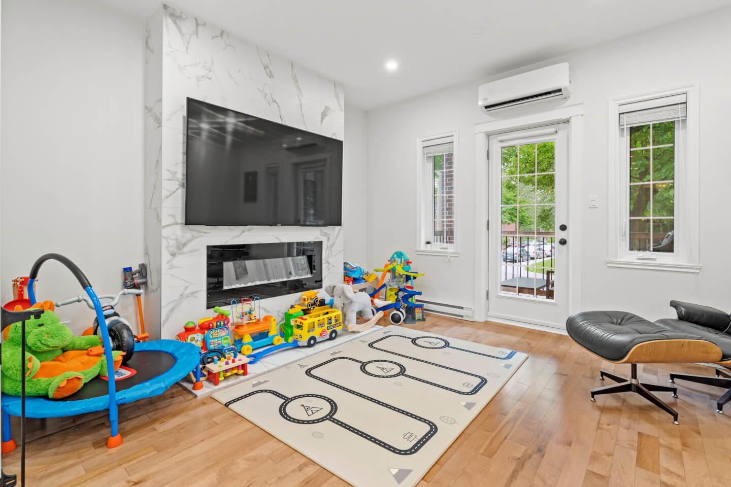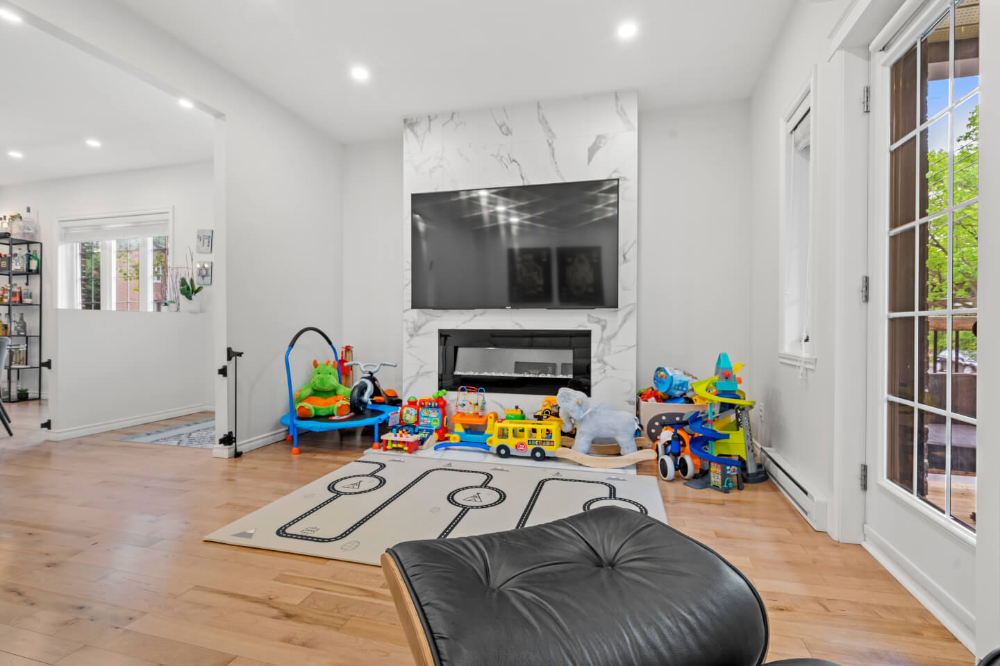 Salon avec mur télé et foyer électrique