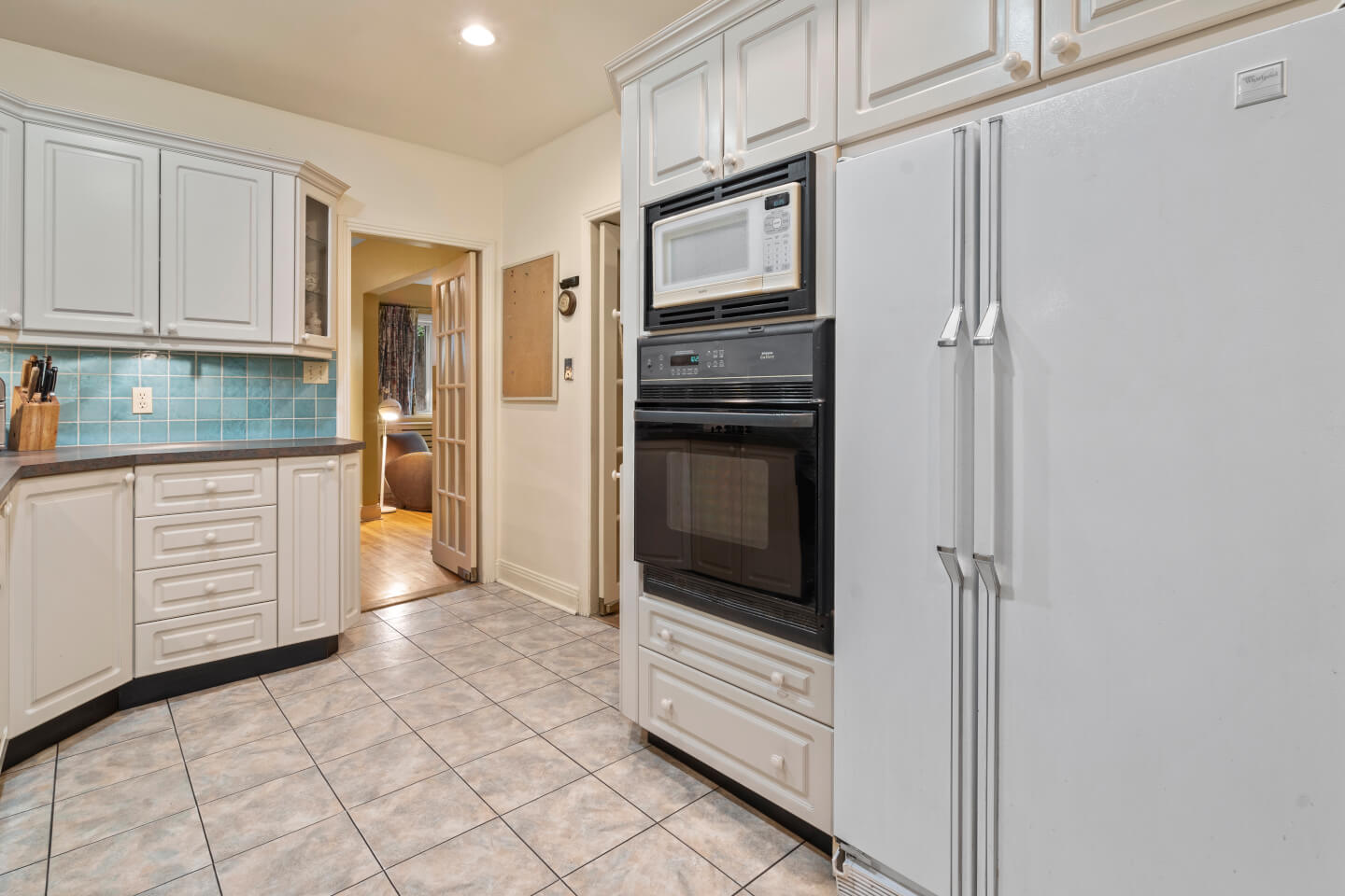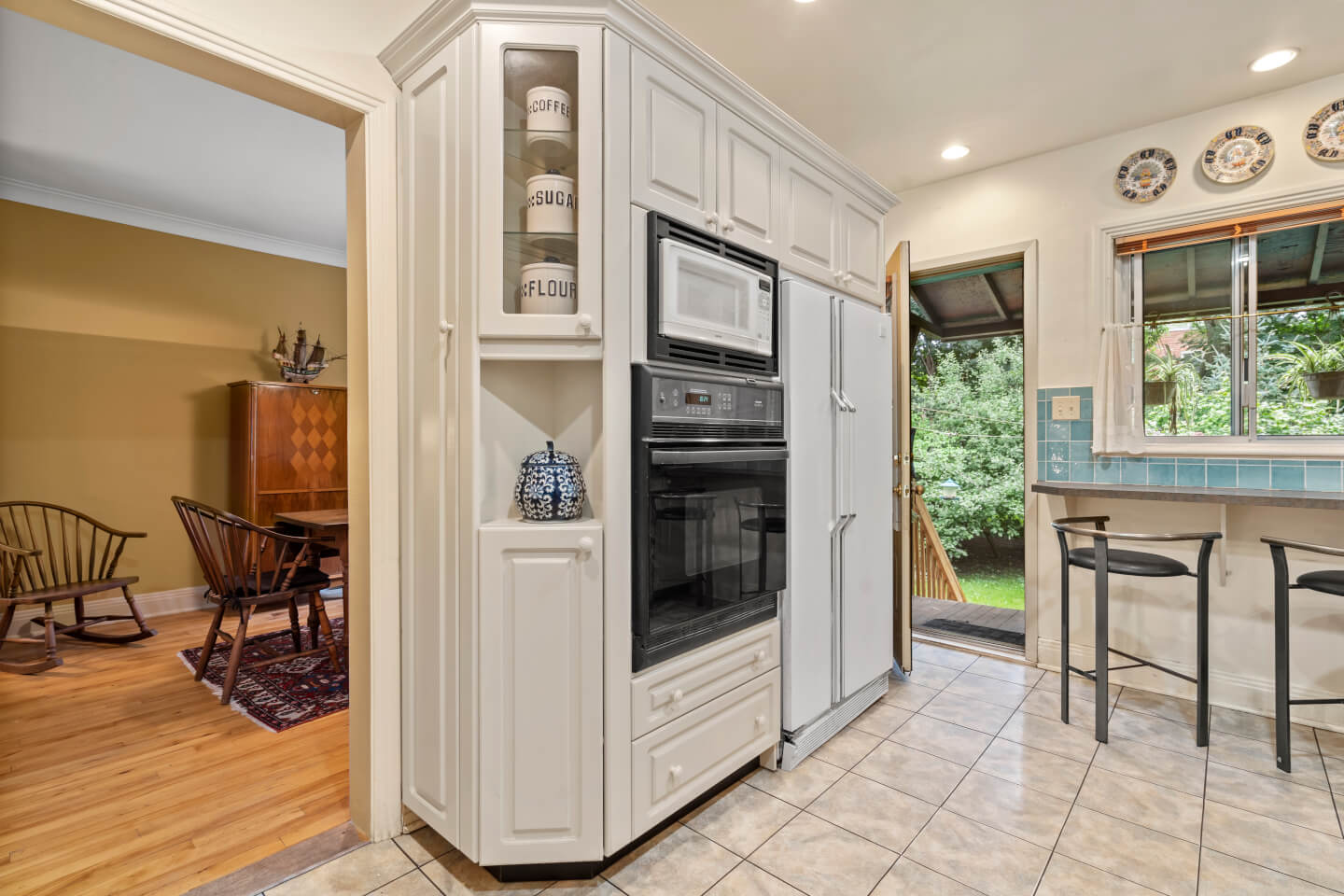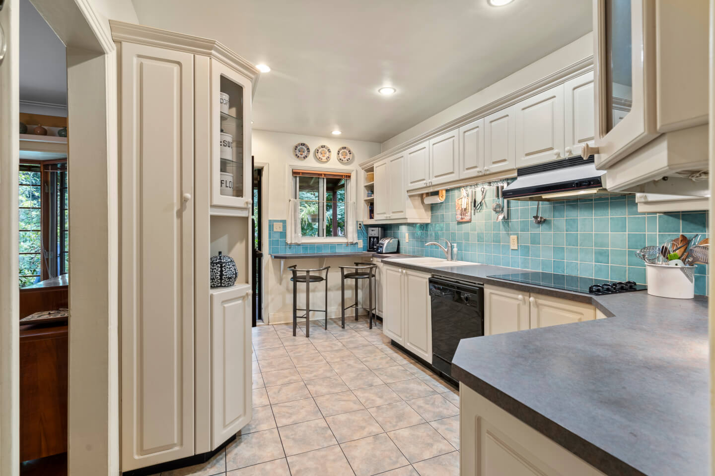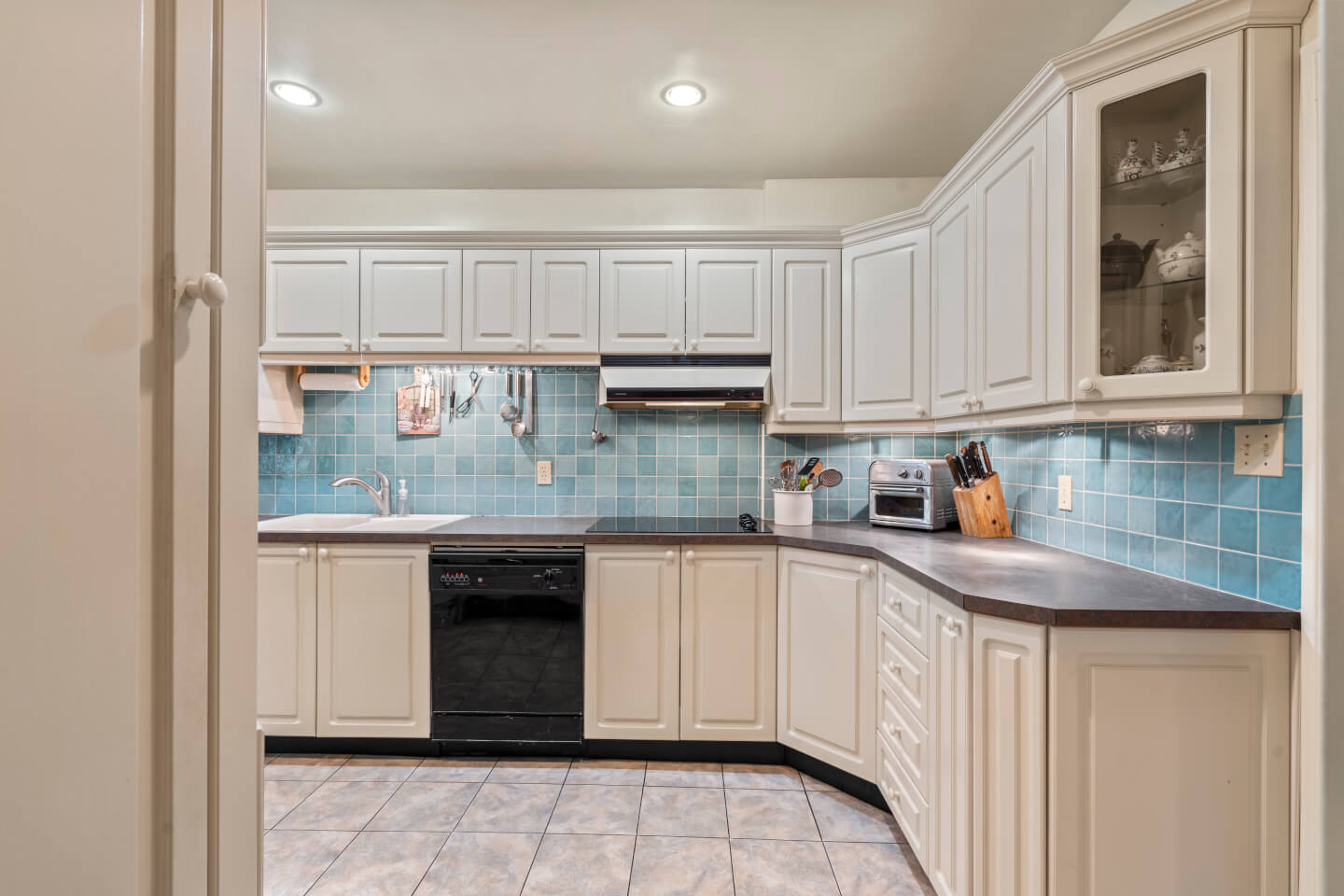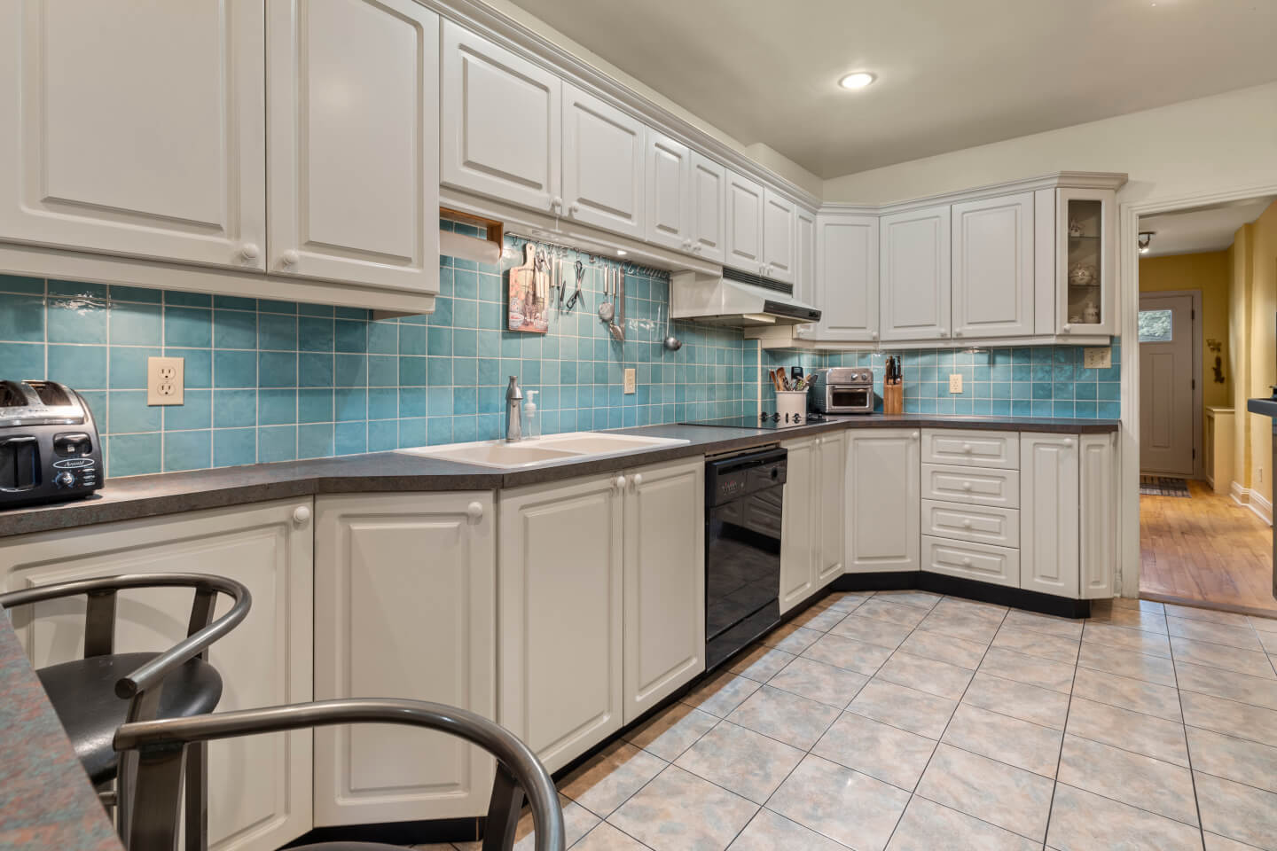 Cuisine, fin des années 90 armoires PVC espace comptoir déjeuner comptoir et plancher linoléum