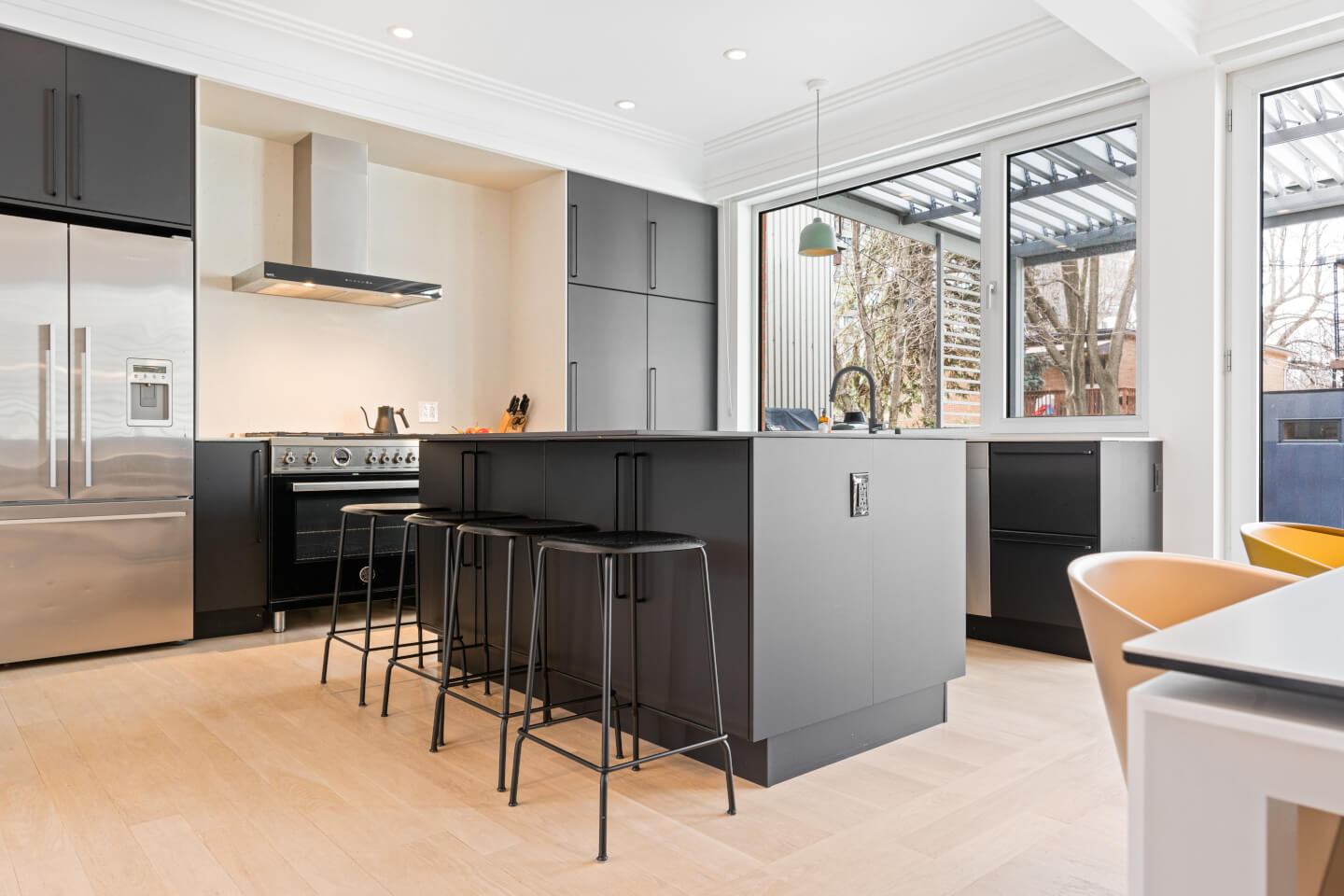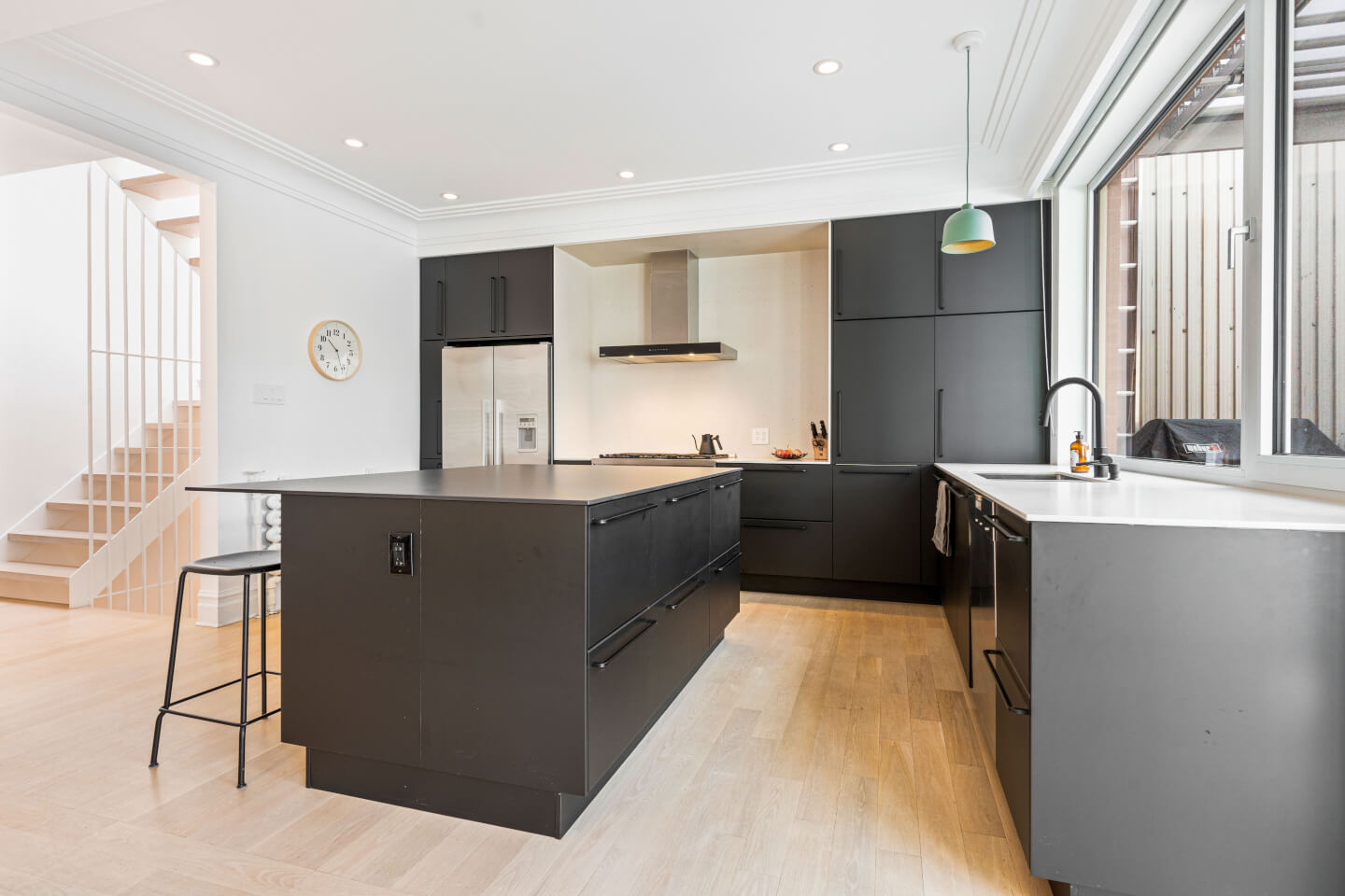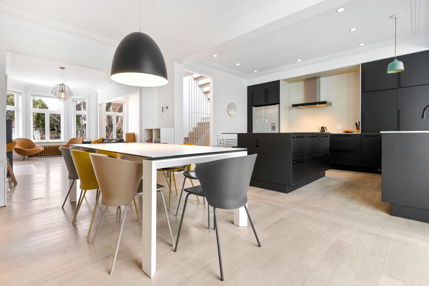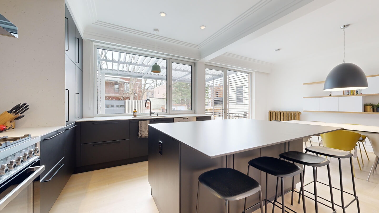 Mur à mur fenestré; Salle à manger et magnifique Cuisine, comptoir de Quartz et Néo lite, grand ilot déjeuner et plancher de bois