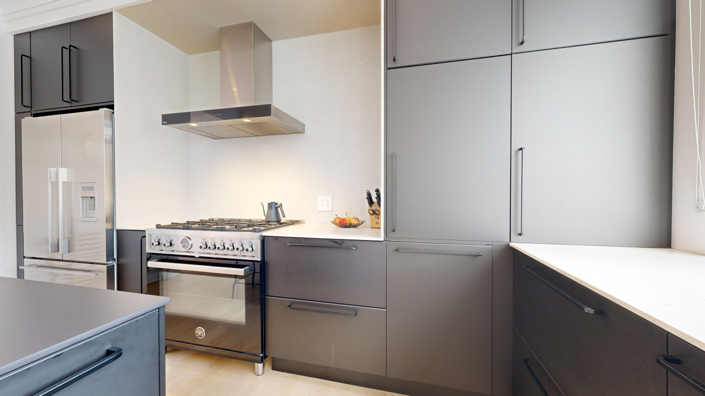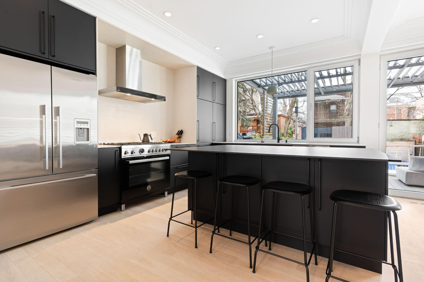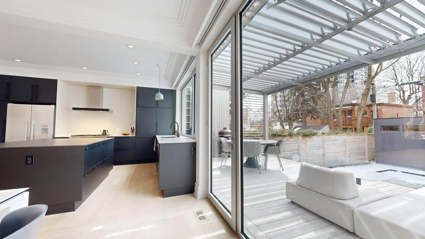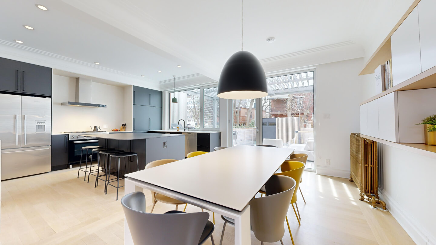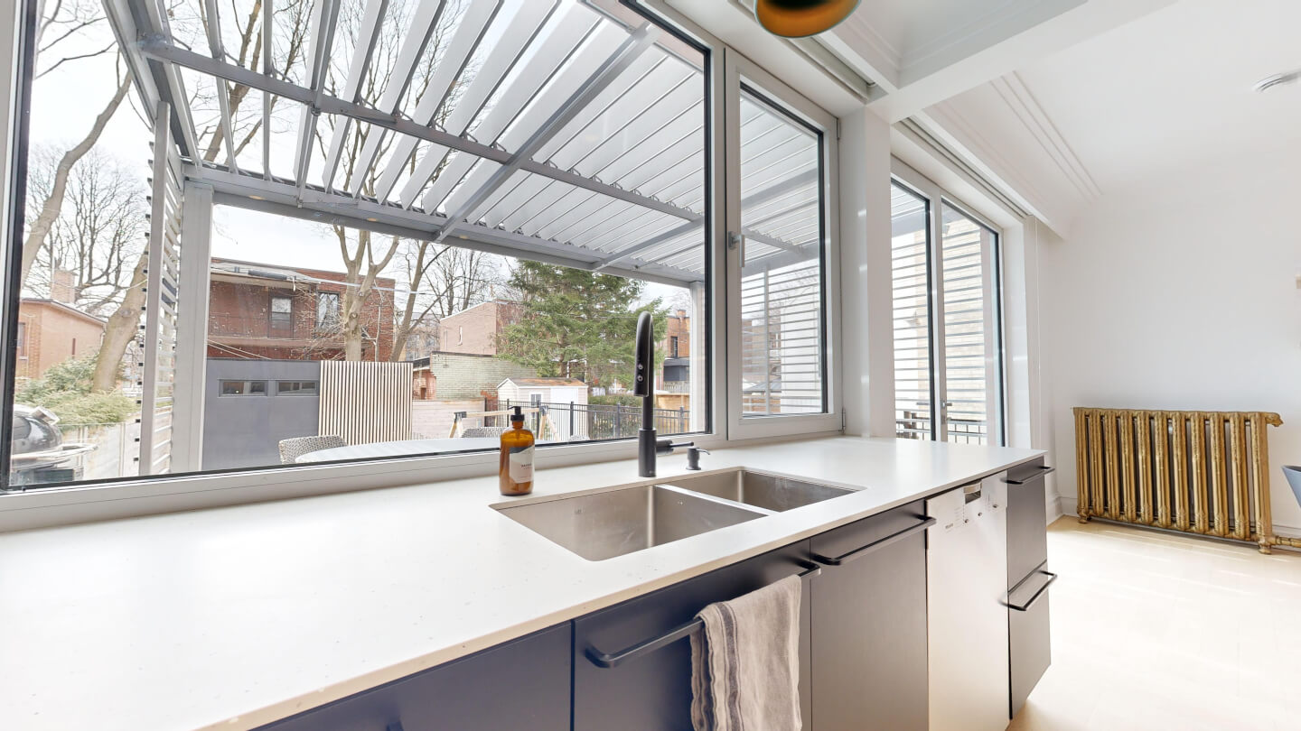 Mur à mur fenestré; Salle à manger et magnifique Cuisine, comptoir de Quartz et Néo lite, grand ilot déjeuner et plancher de bois