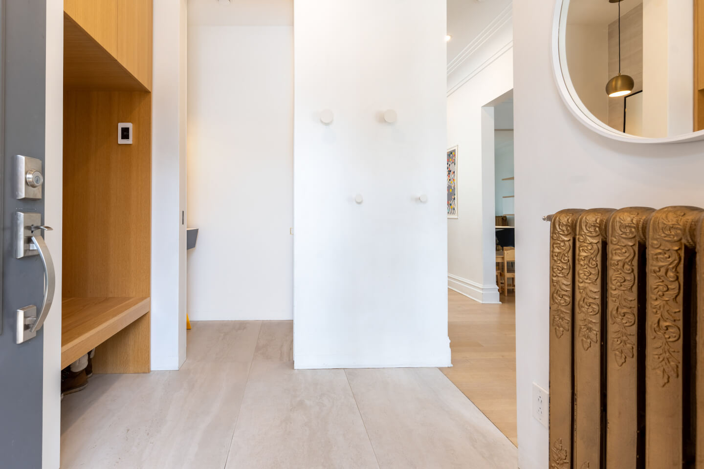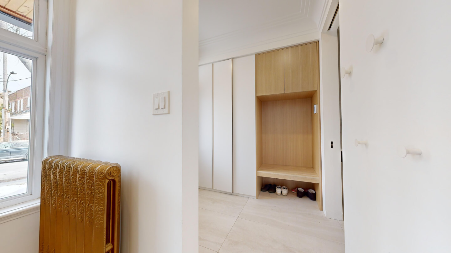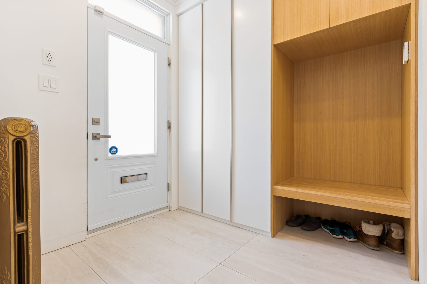 Grand vestibule d’entrée aménagé placard et banquette sur plancher radiant