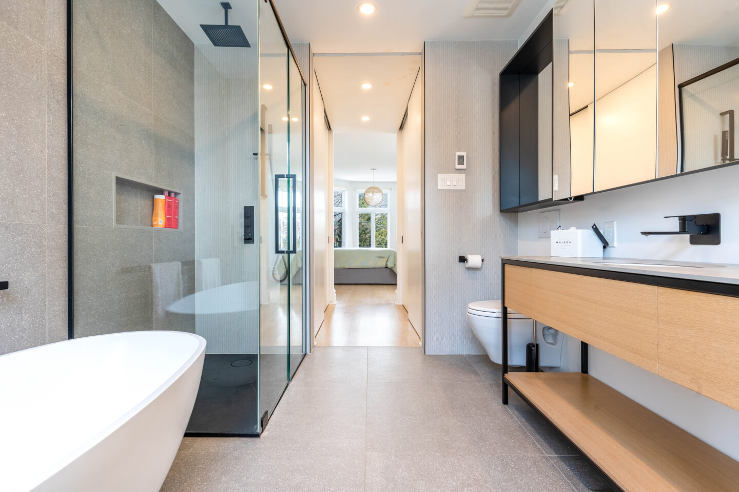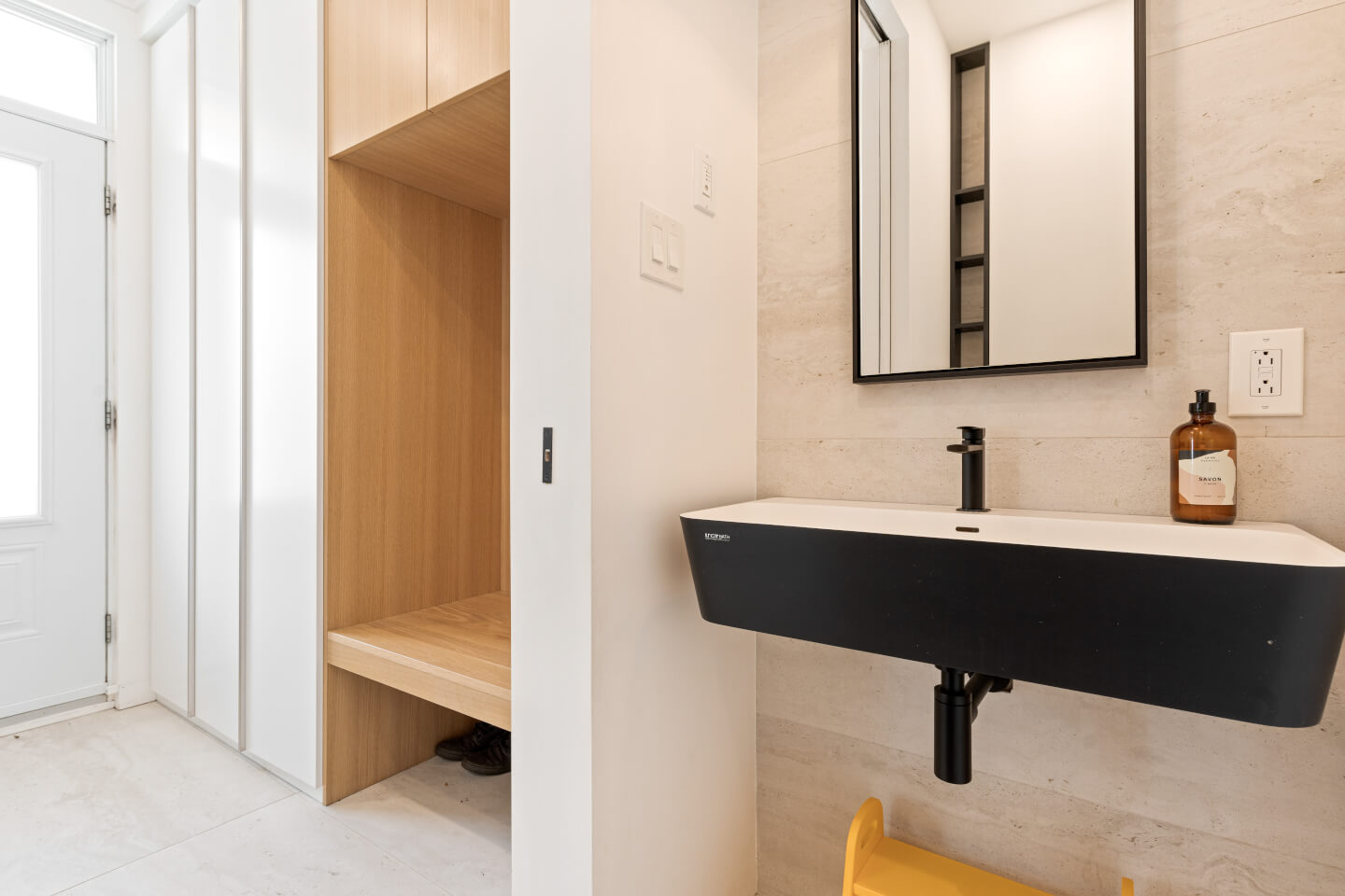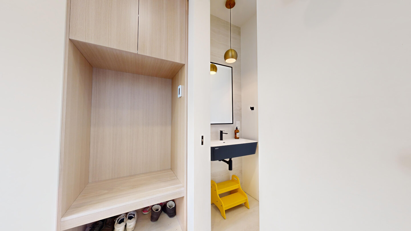 Grand vestibule d’entrée aménagé placard et banquette sur plancher radiant
