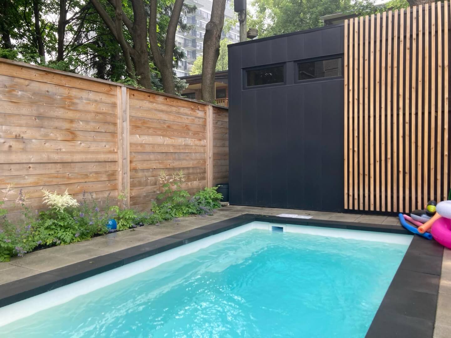 2022-Terrassement avant et arrière. Piscine, cabanon sur mesure, clôture en cèdres, clôture ornementale, pavé, entrée, nouveau balcon avant, plantes, arbustes)