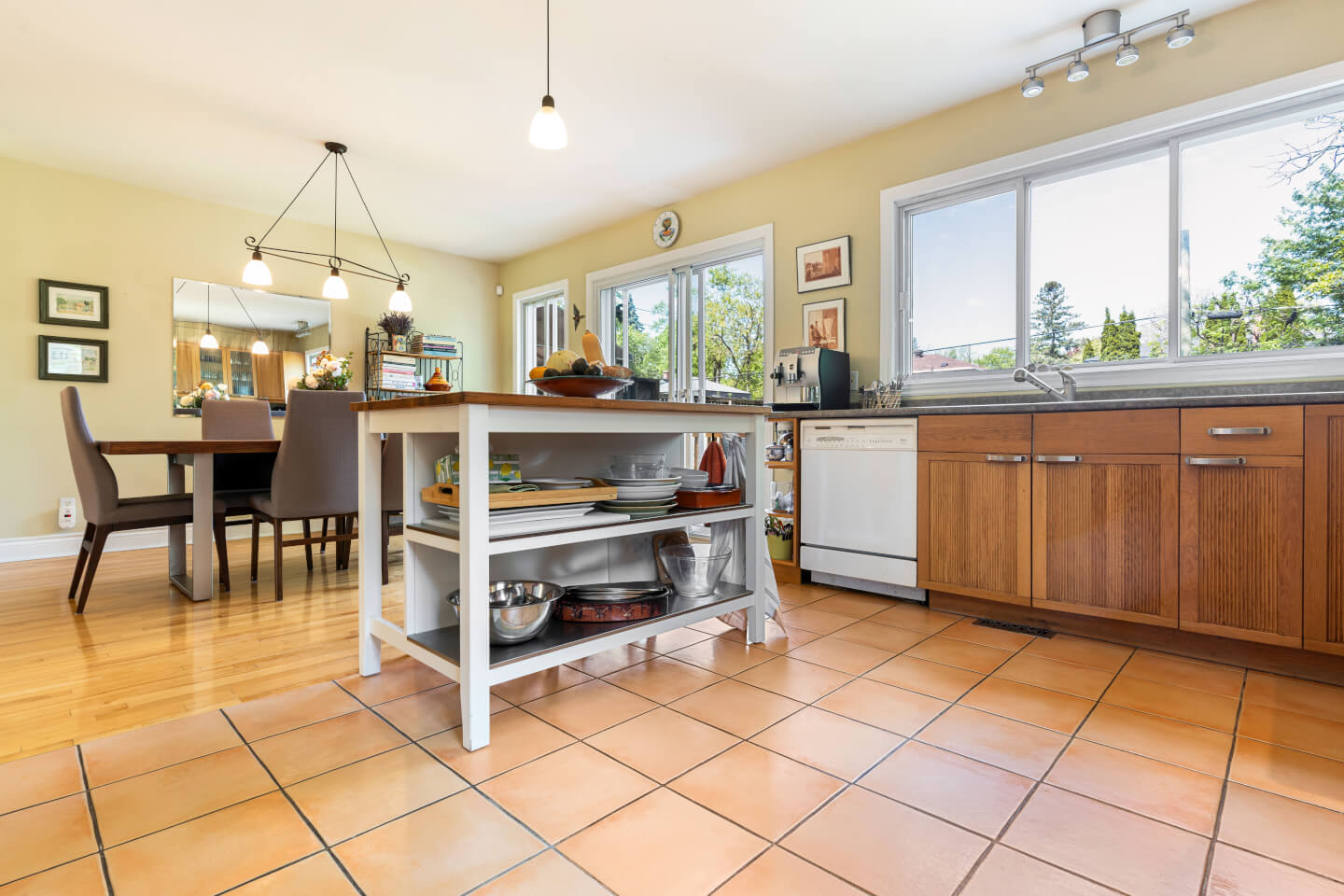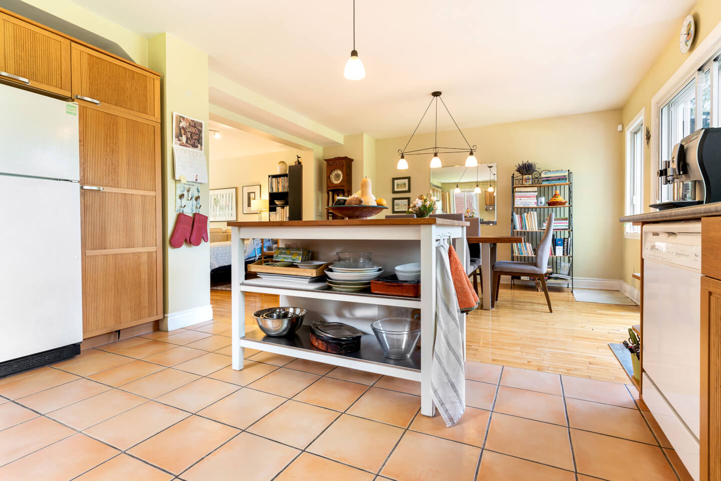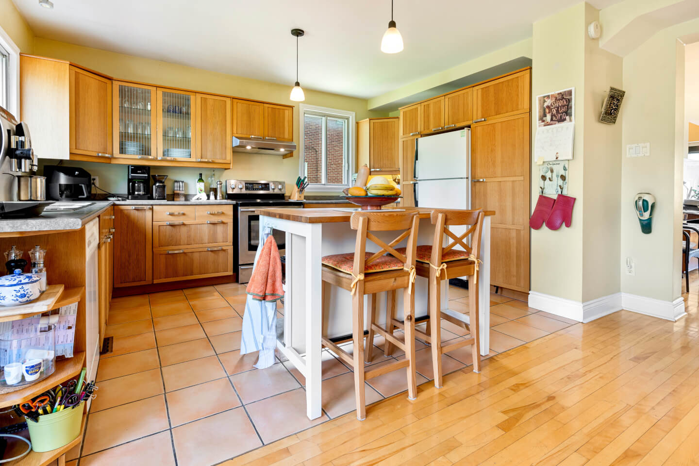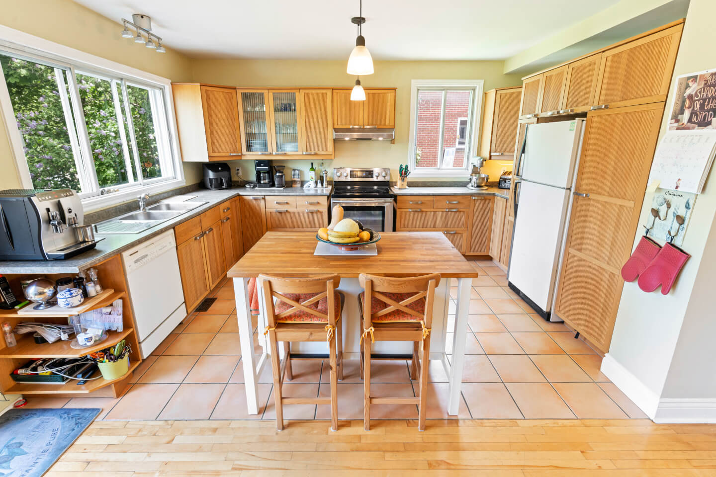 Cuisine, Ilot central, armoires bois, plancher céramique