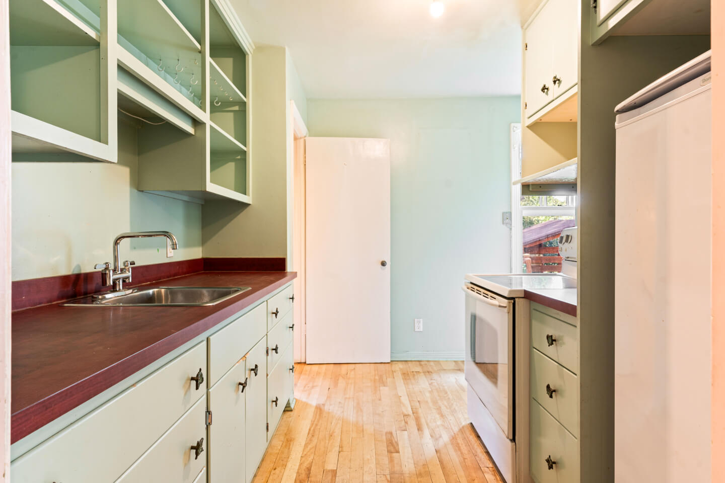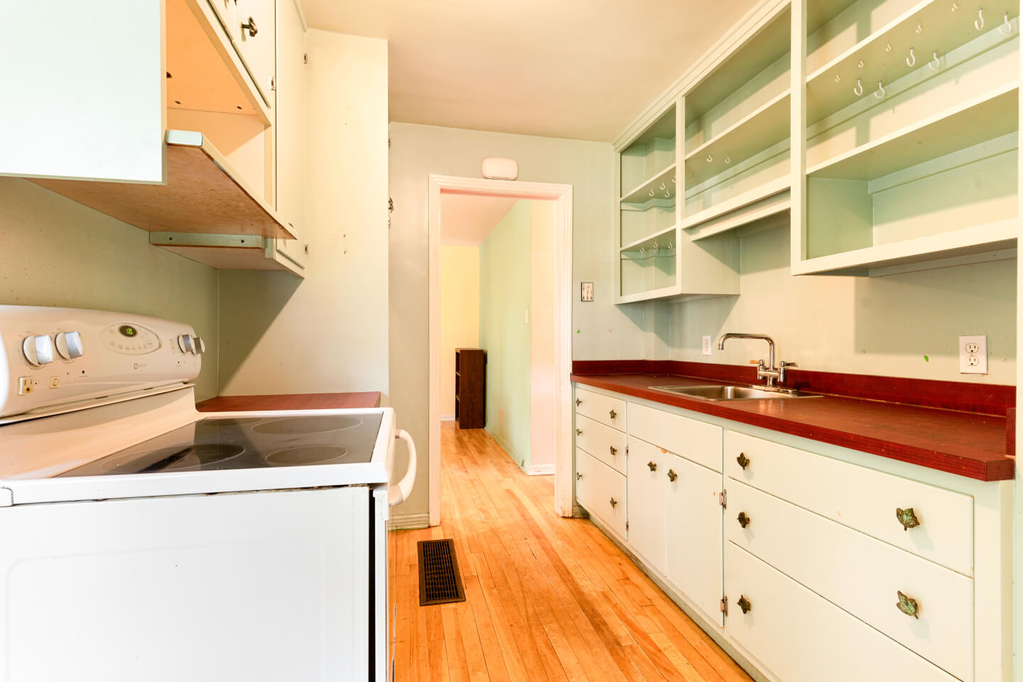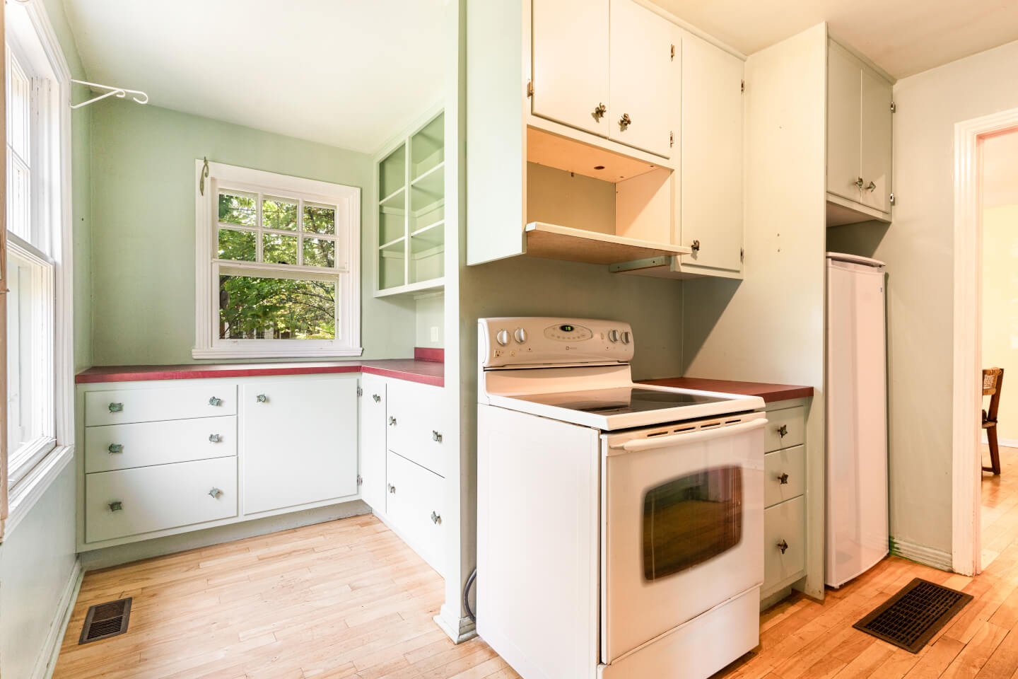 Cuisine, en Disposition-L, plancher de bois