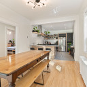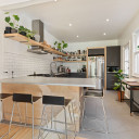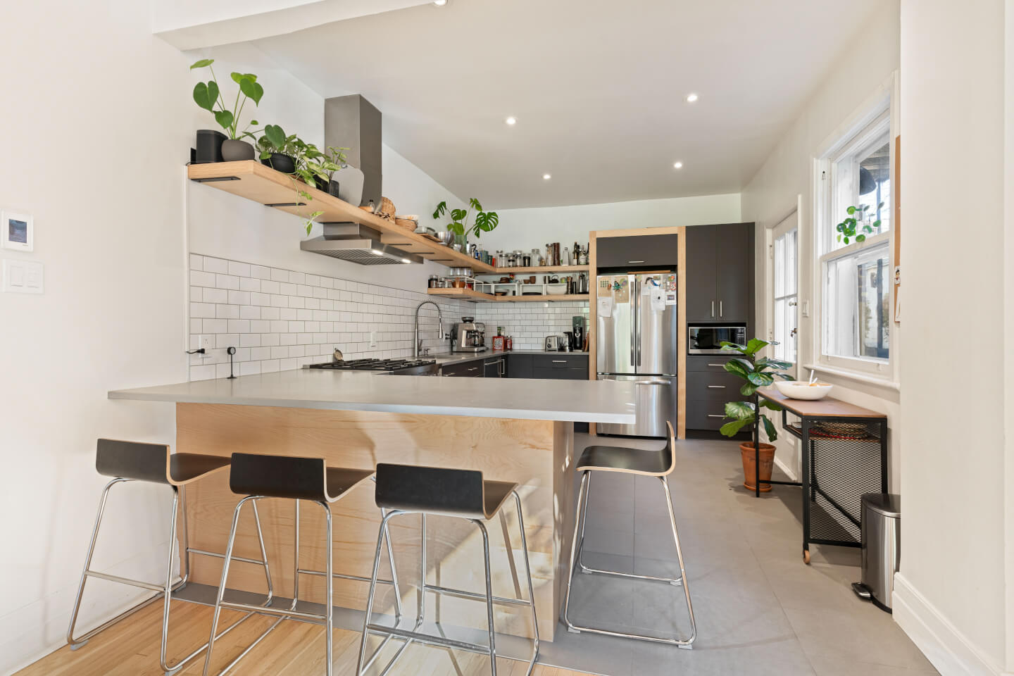 Cuisine rénovée, comptoir déjeuner de quartz et plancher céramique chauffante