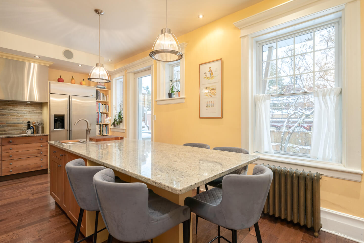 Cuisine avec électroménagers de calibre professionnel, grand ilot et comptoir de granite