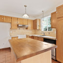 Cuisine avec îlot et plancher en céramique