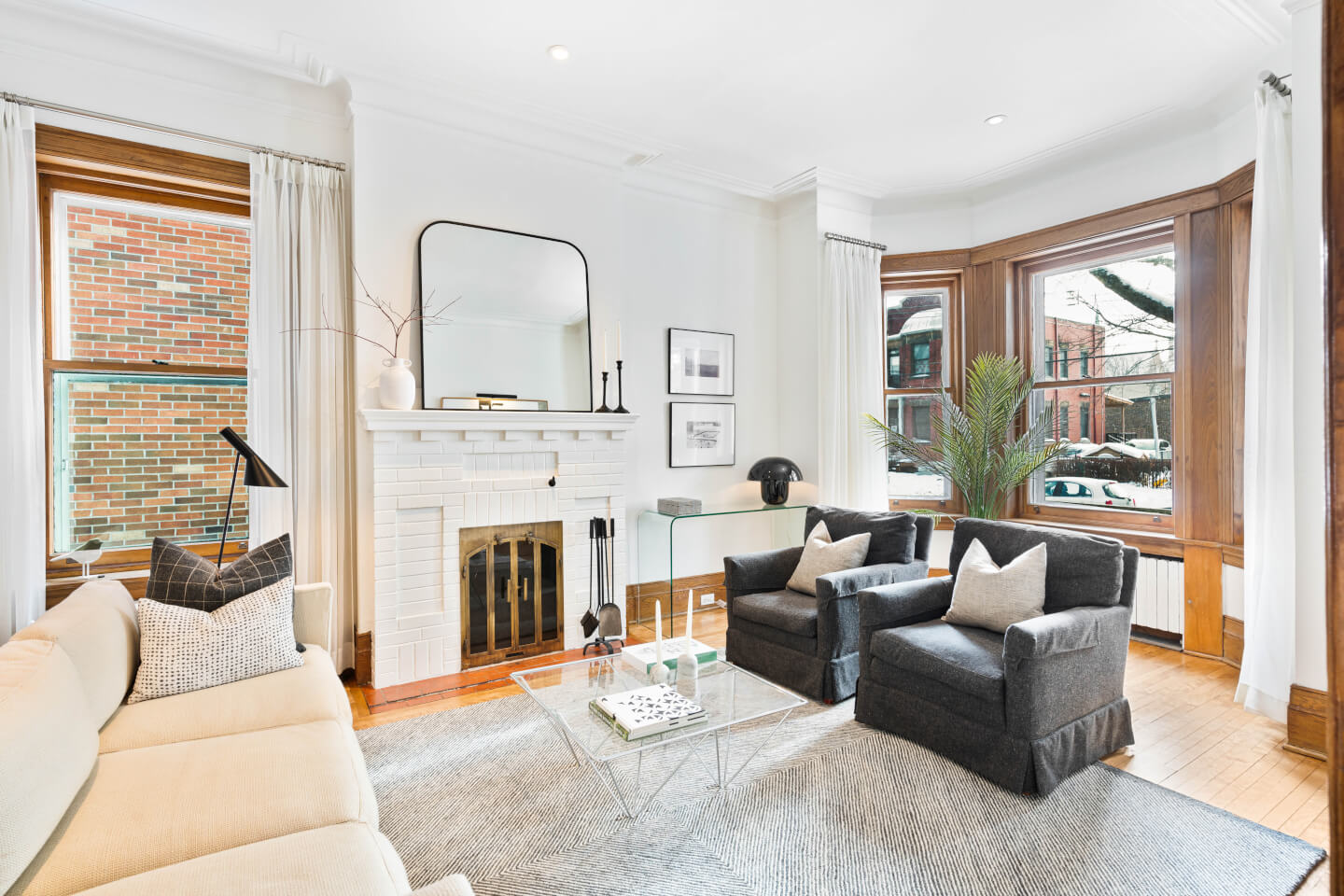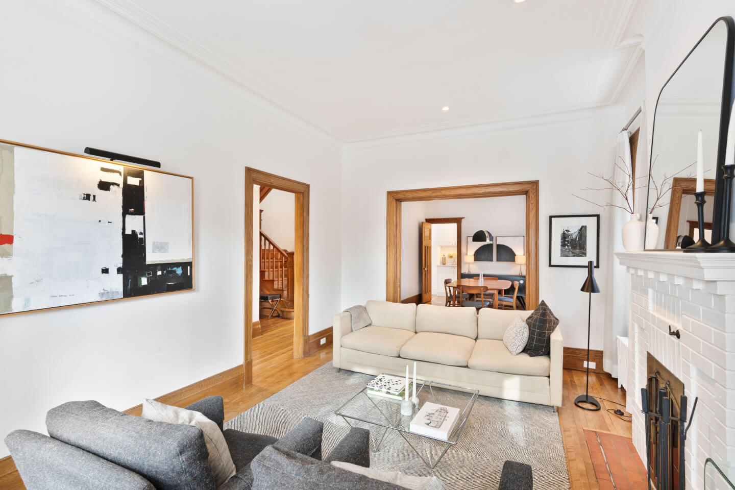Grand salon avec des fenêtres en baie, ouvert sur la salle à manger