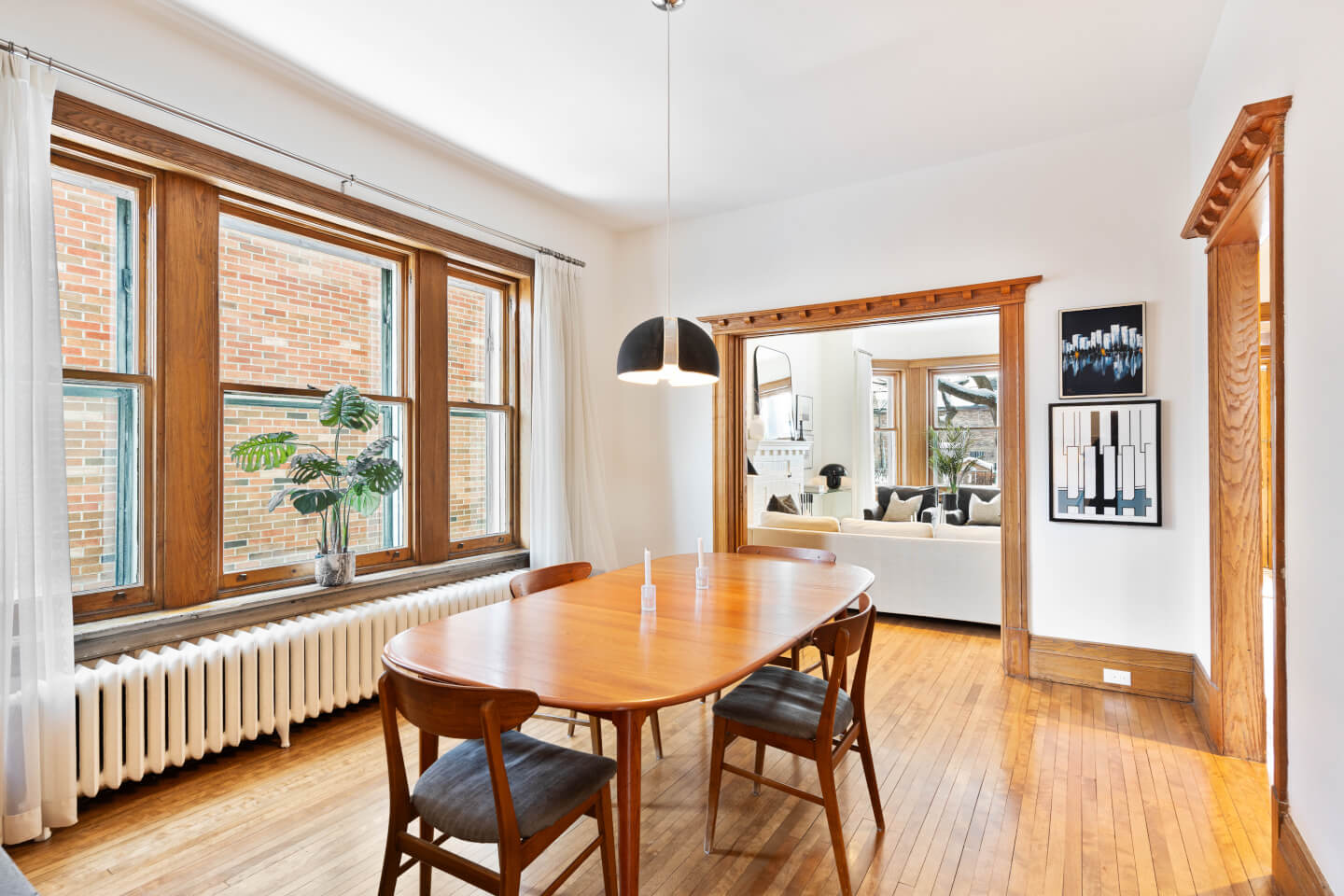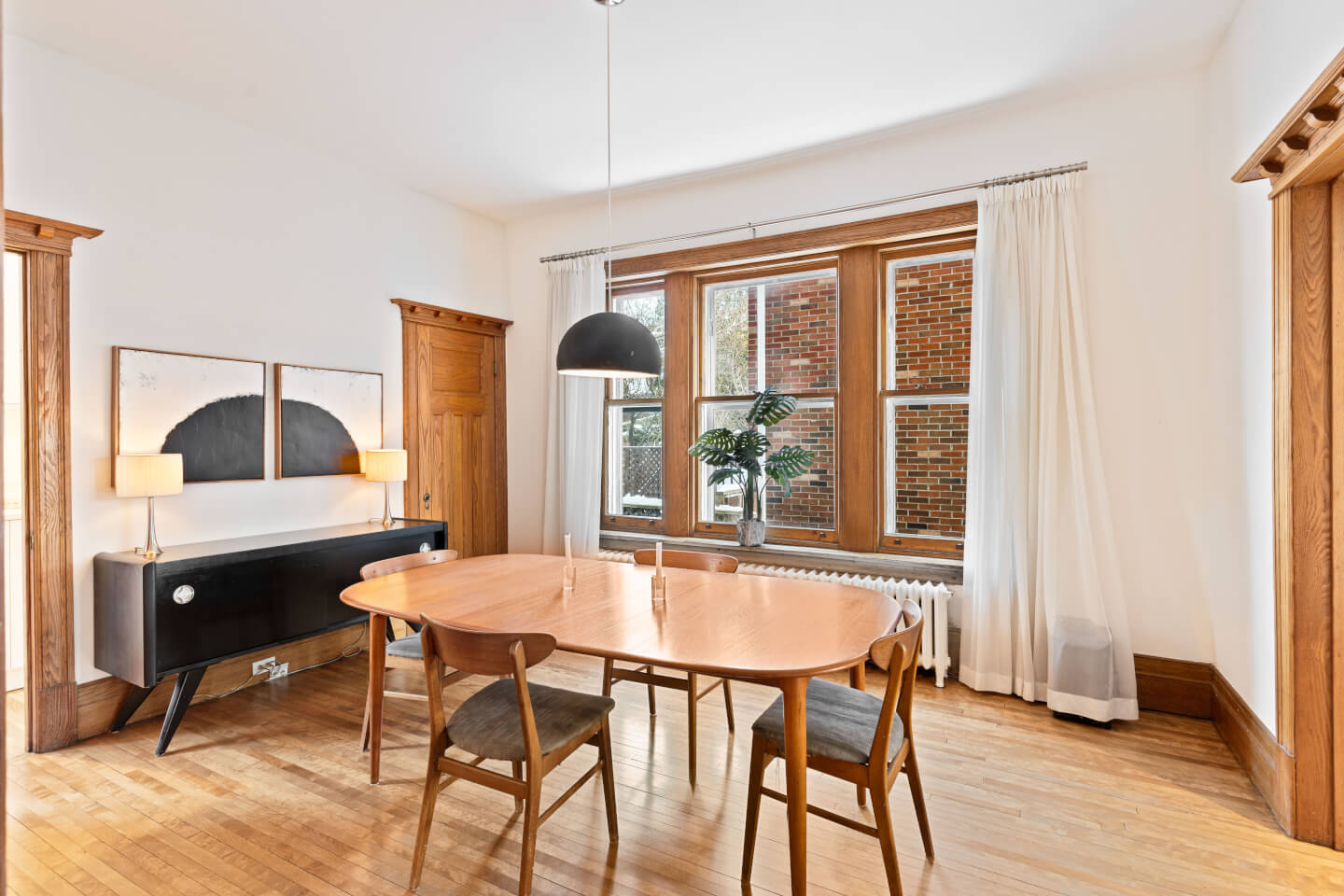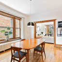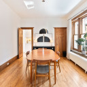 Salle à manger avec fenestration en bois d’origine, accès à la cuisine