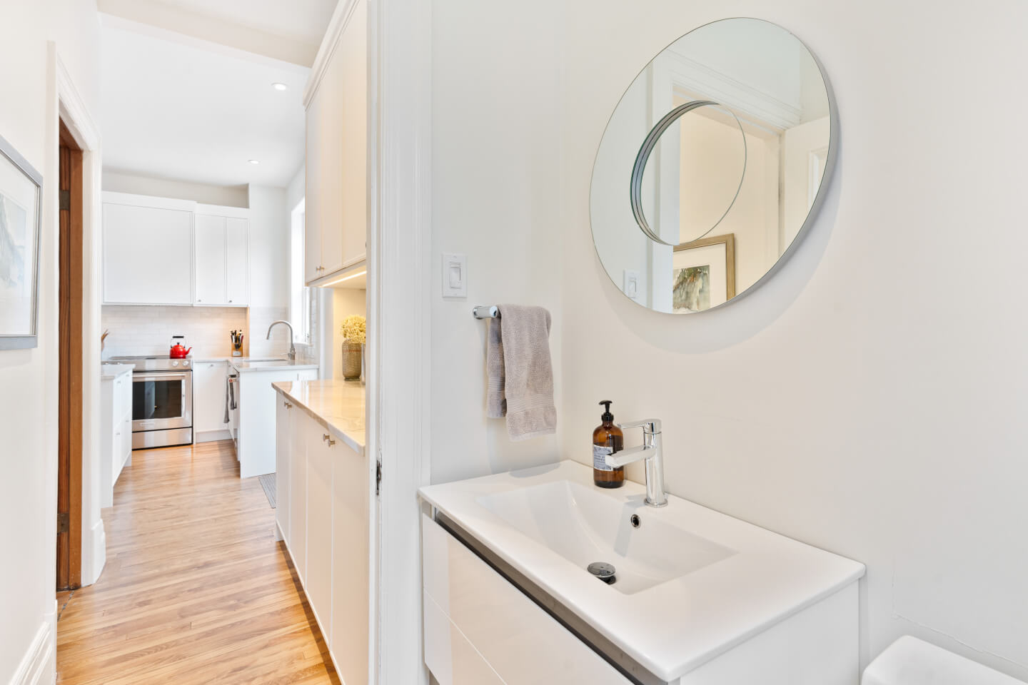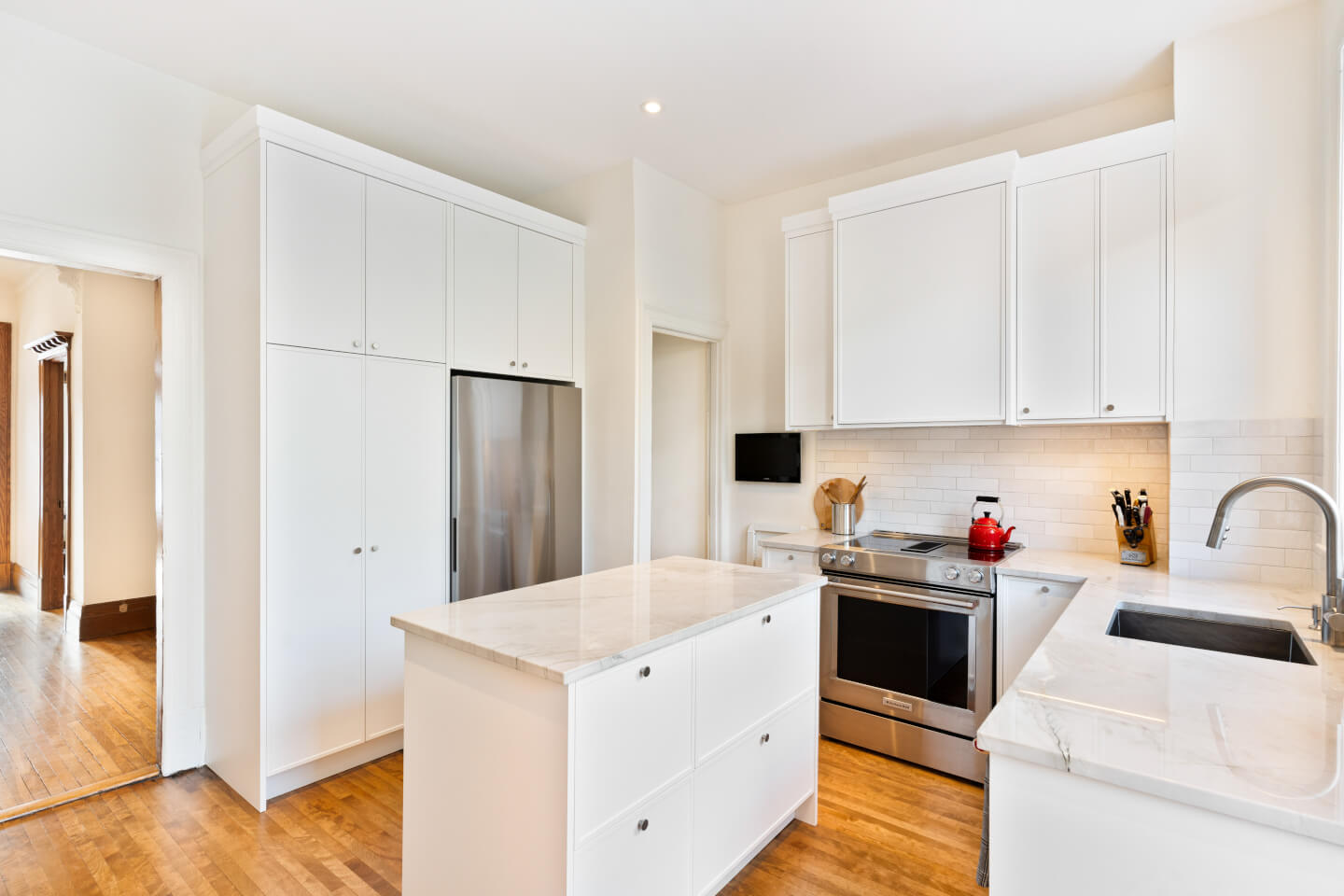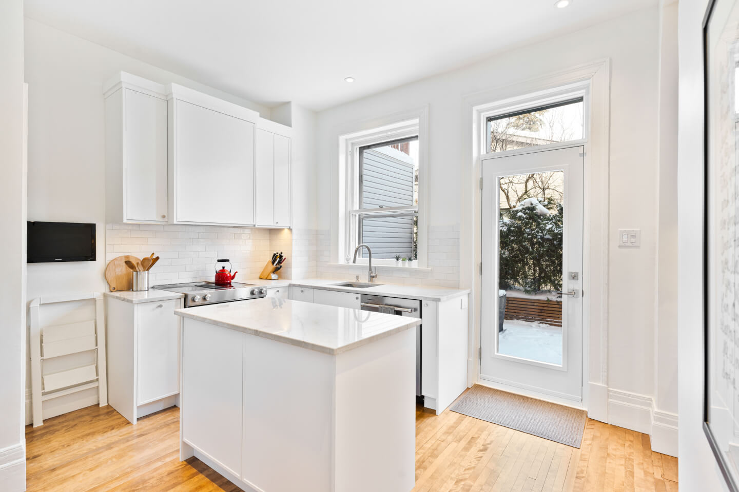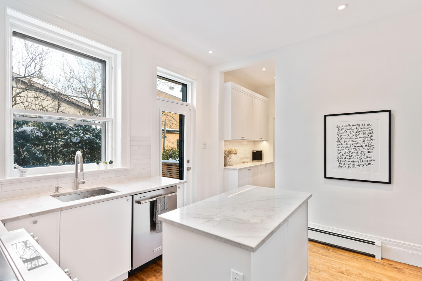 Magnifique cuisine nouvellement rénovée en 2024, soigneusement conçue, avec comptoir de quartzite, un coin café ainsi qu’une salle d’eau.