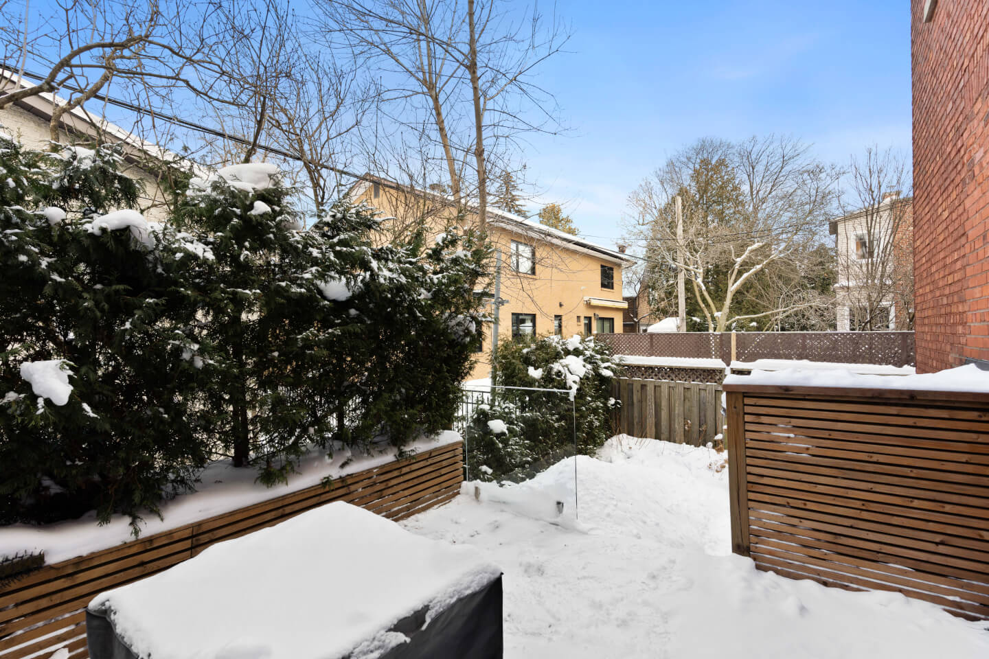 Belle terrasse et jardin urbain, avec aménagement paysager professionnel à l'avant, l’arrière et sur le côté de la maison.