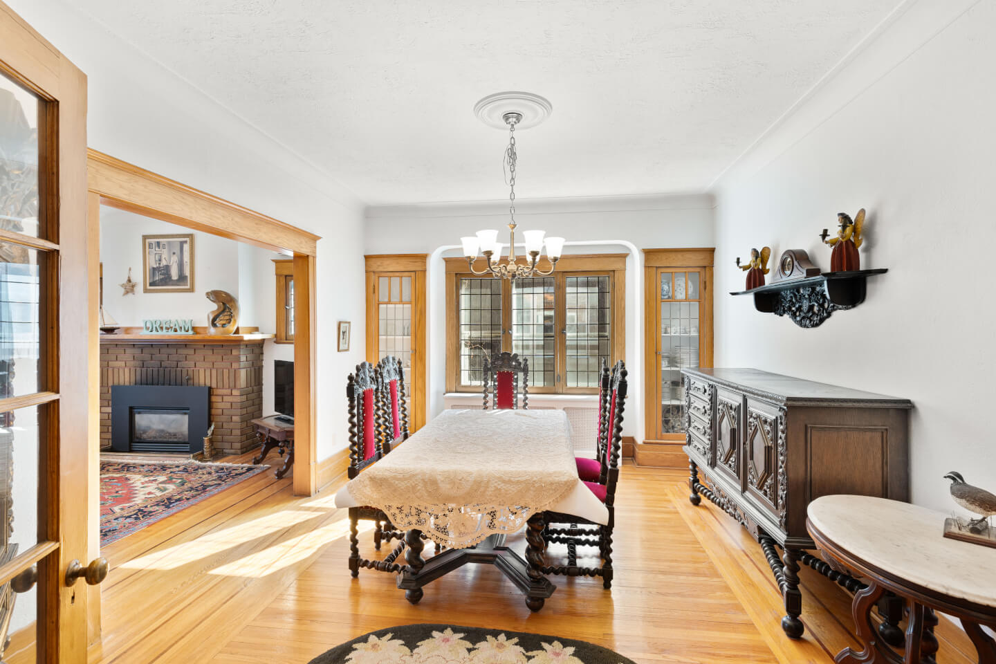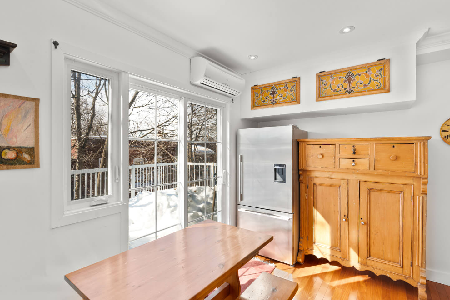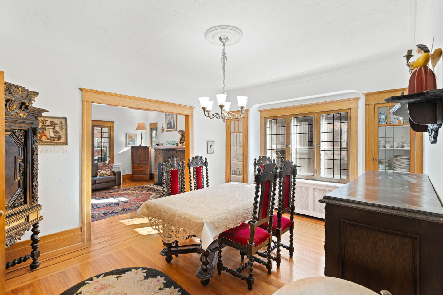 Salle à manger avec vaisseliers encastrés, magnifiques fenêtres plombées