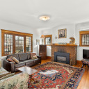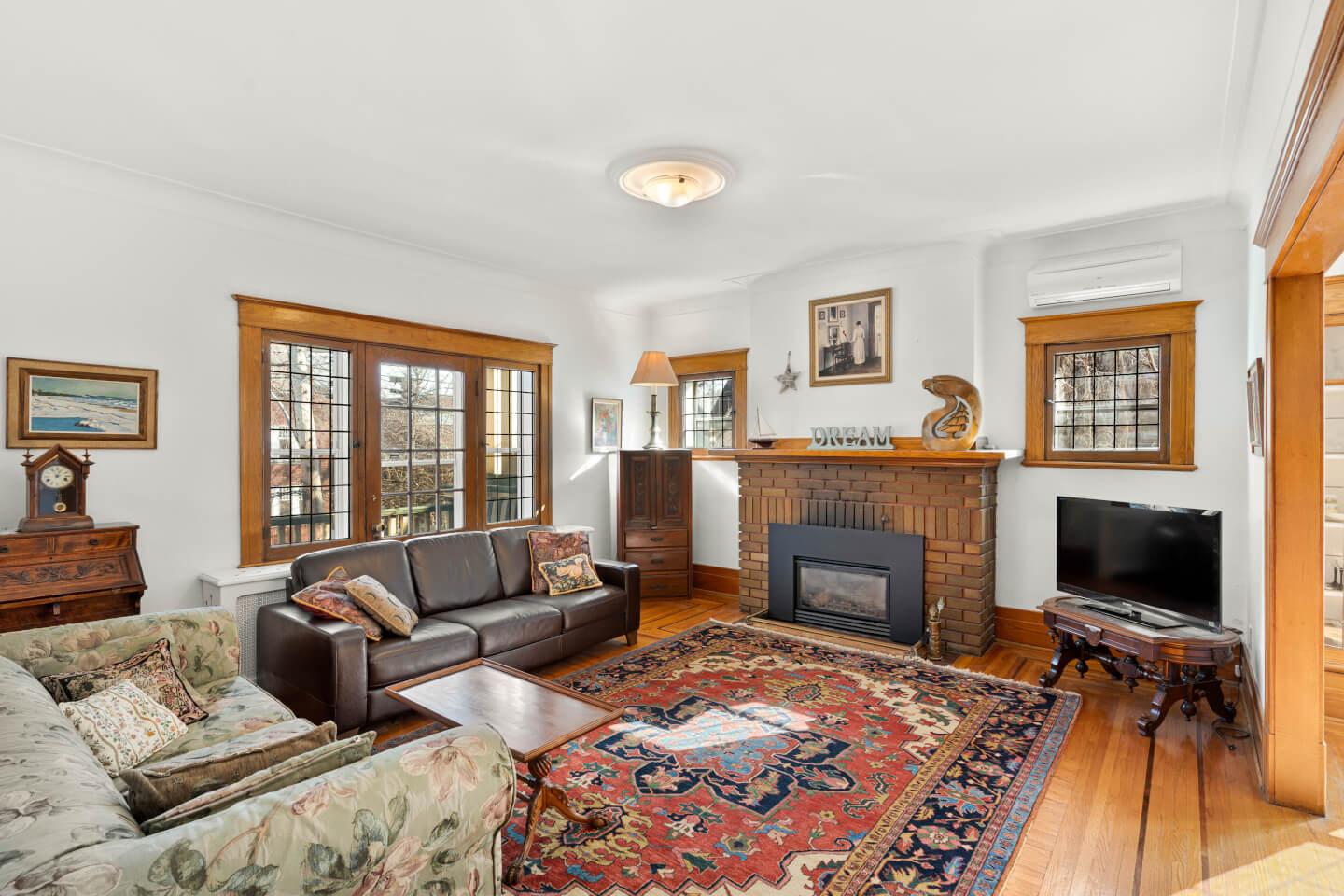Salon avec foyer au gaz, balcon, AC et ouvrant sur la salle à manger