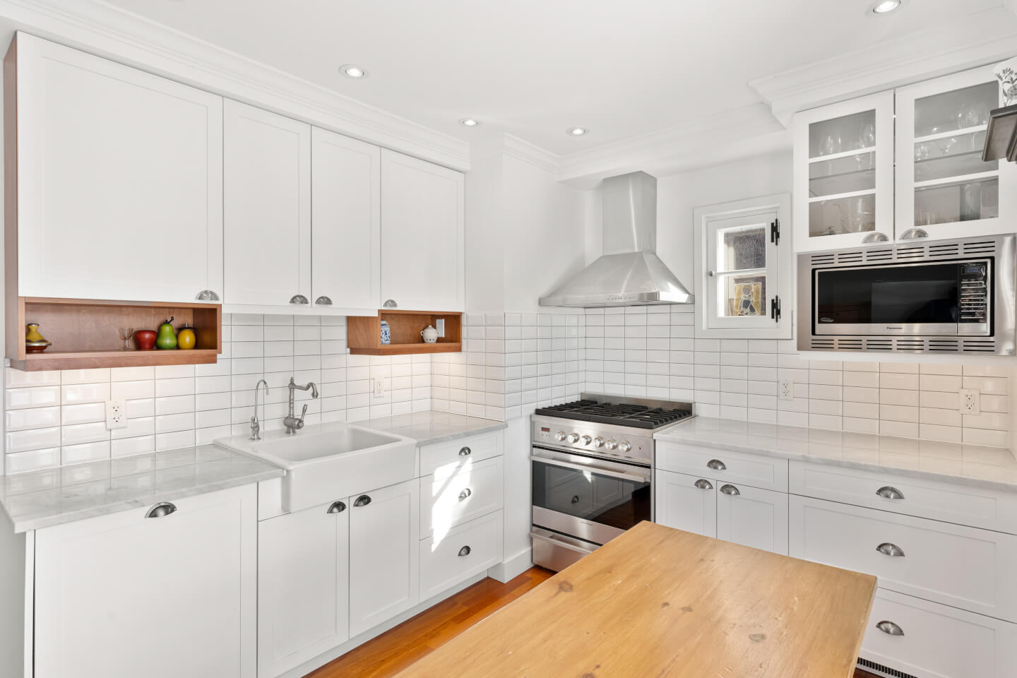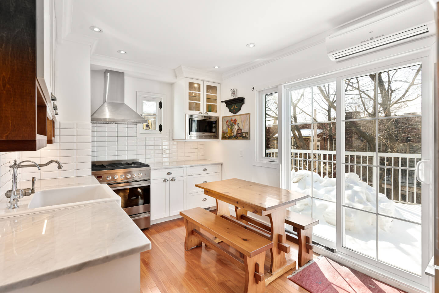 Cuisine soigneusement rénovée en 2016 comptoirs de marbre et plancher radiant de bois d’ingénierie en cerisier