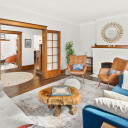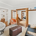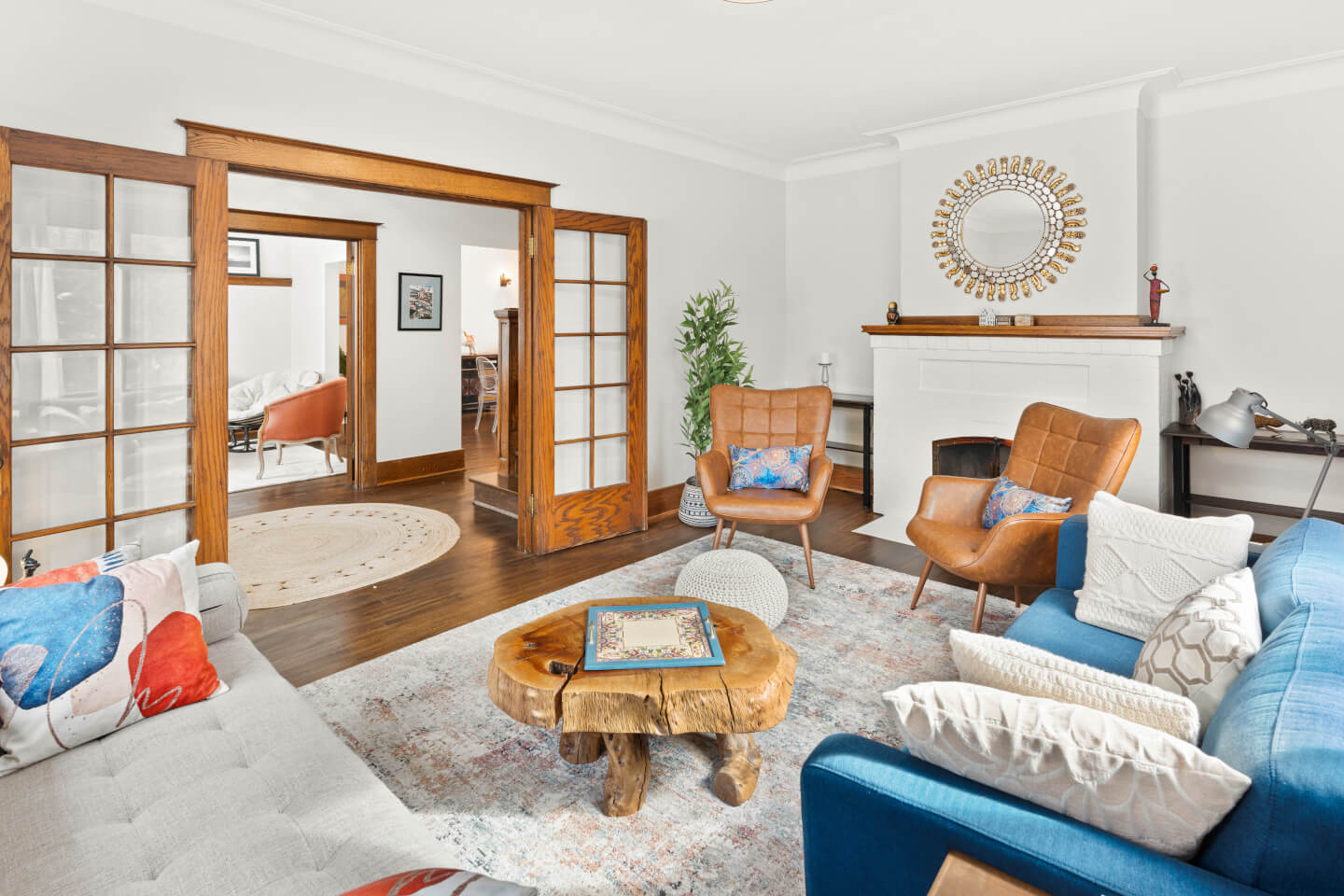 Grand salon lumineux (foyer d’origine 1927) avec deux grandes fenêtres