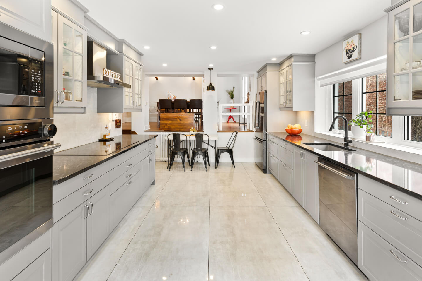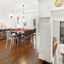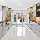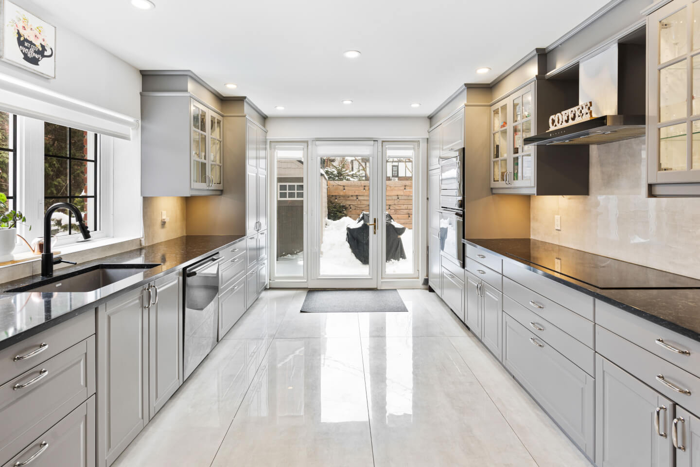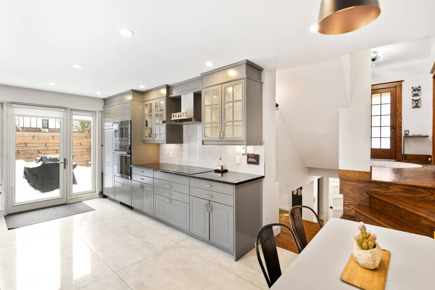 Superbe élégante cuisine soigneusement rénovée en 2020, avec comptoir de quartz, coin repas, plancher chauffant, accès au jardin et une hauteur de 7’8’’!