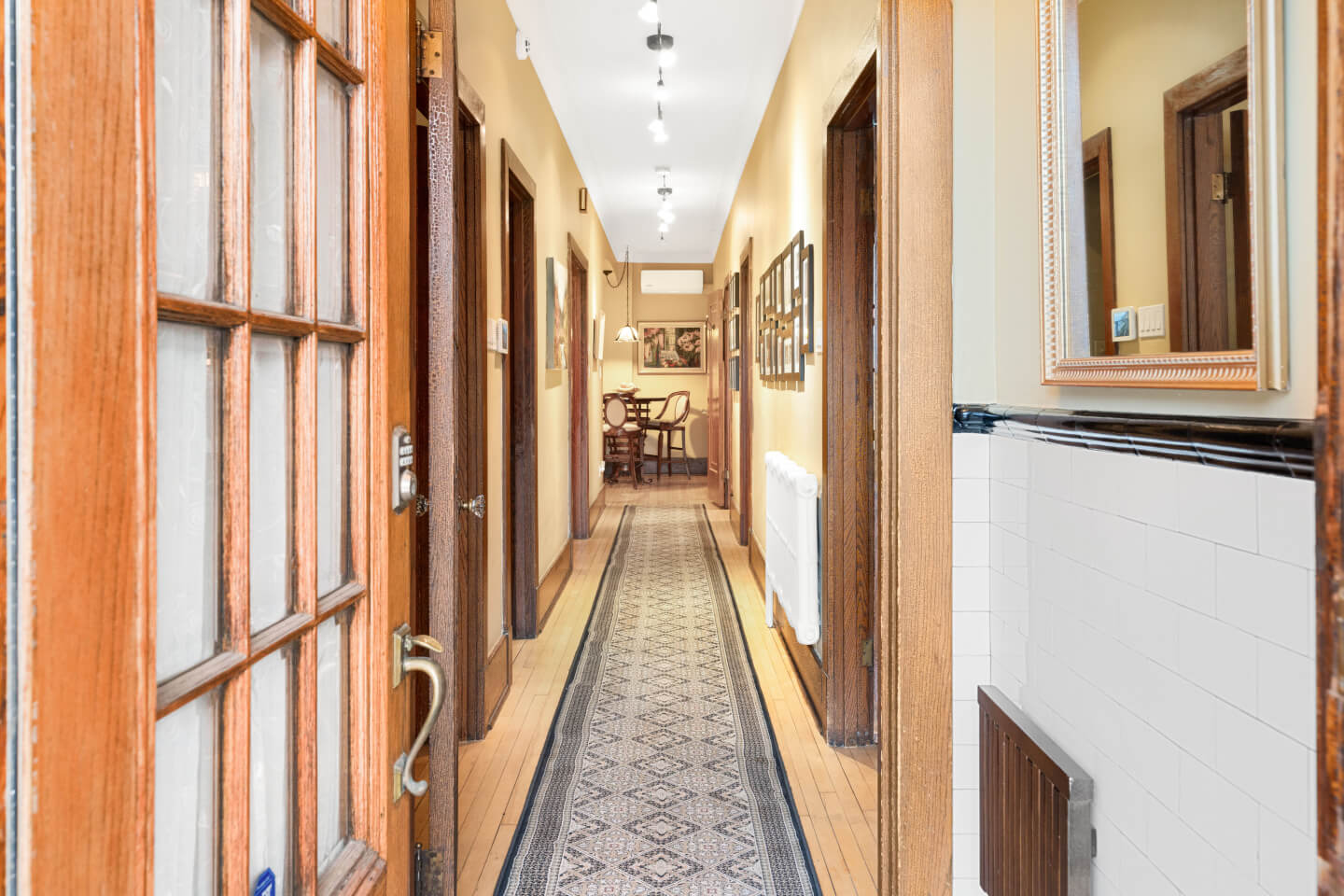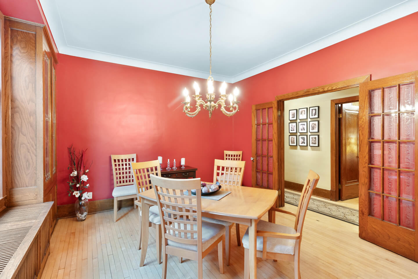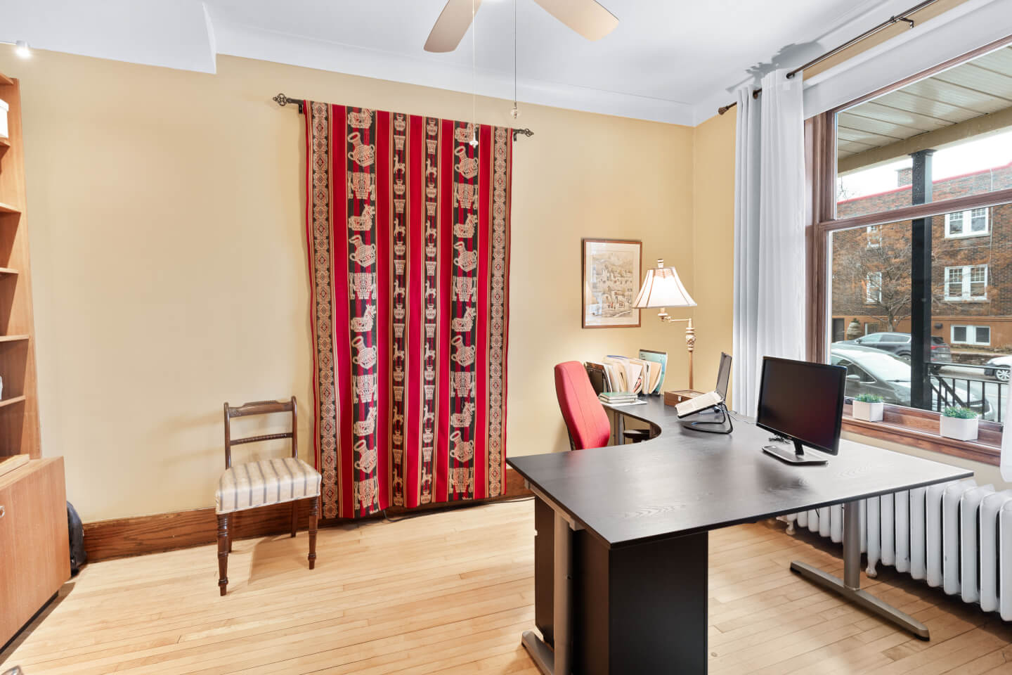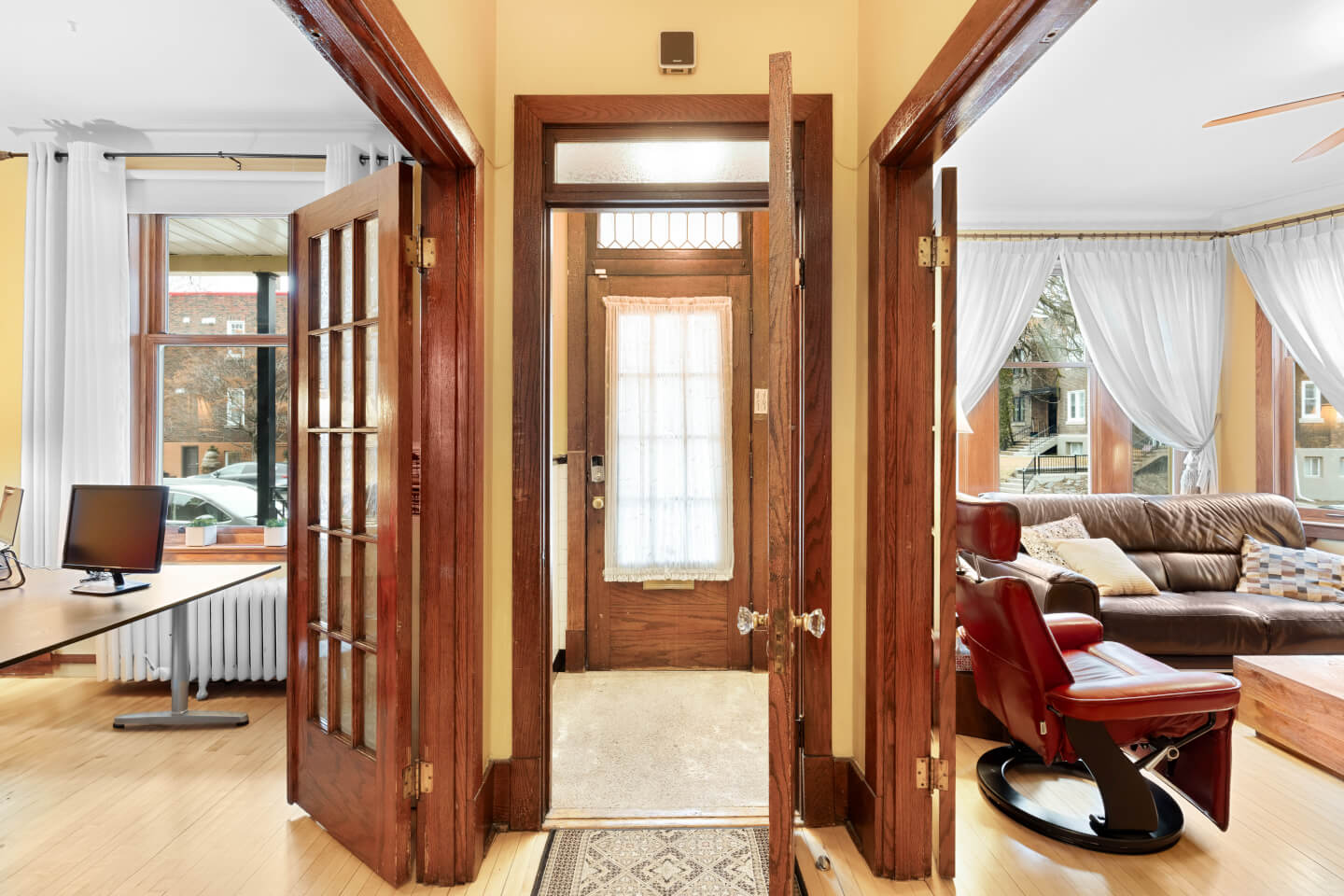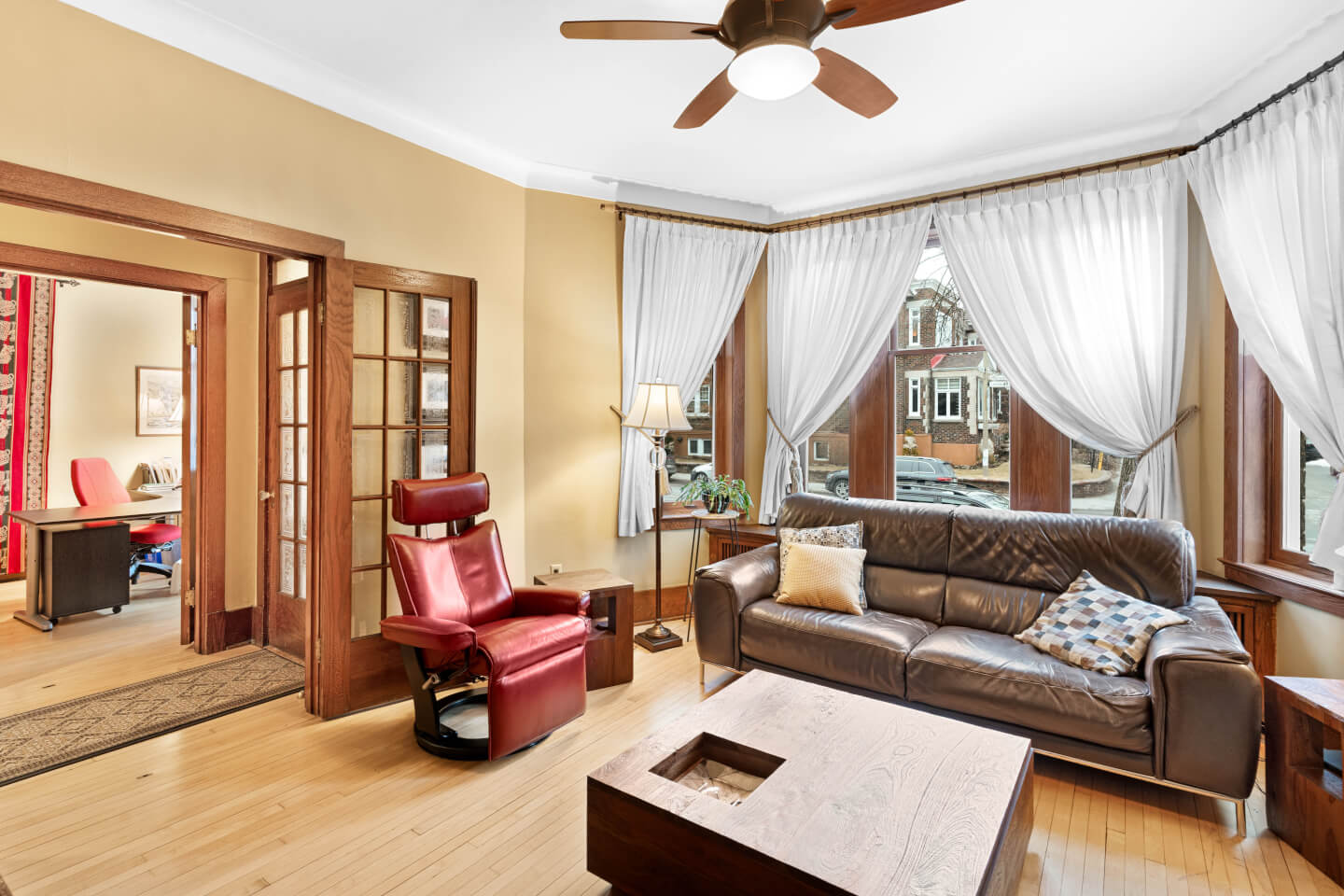 Salon (foyer non fonctionnel selon la loi de la ville de Montréal), portes françaises, fenêtres en baie