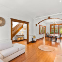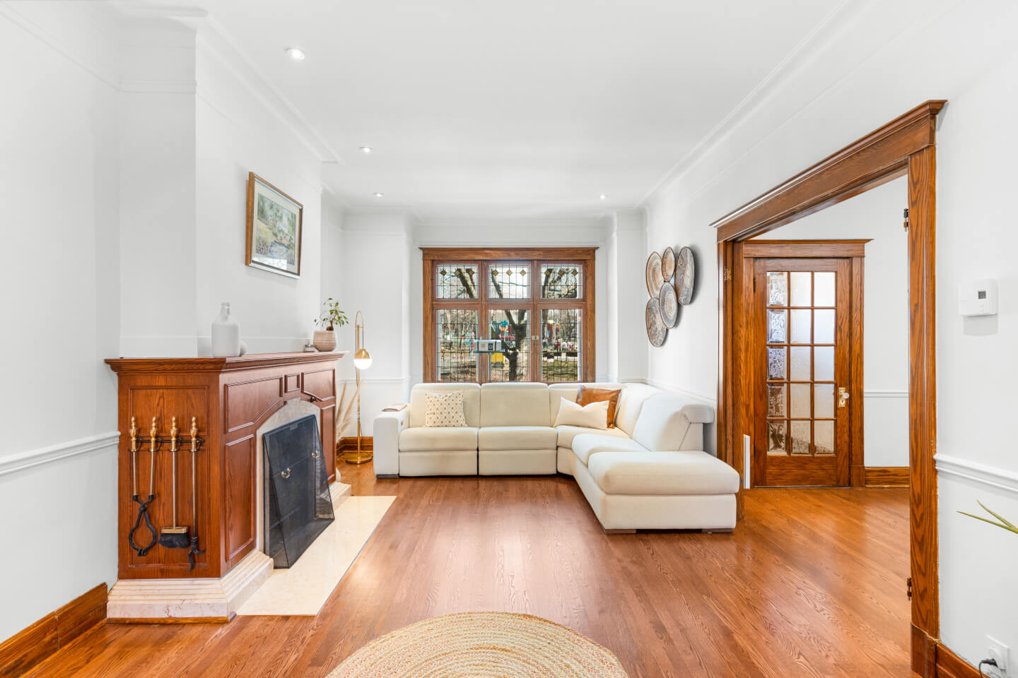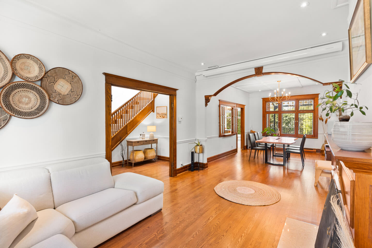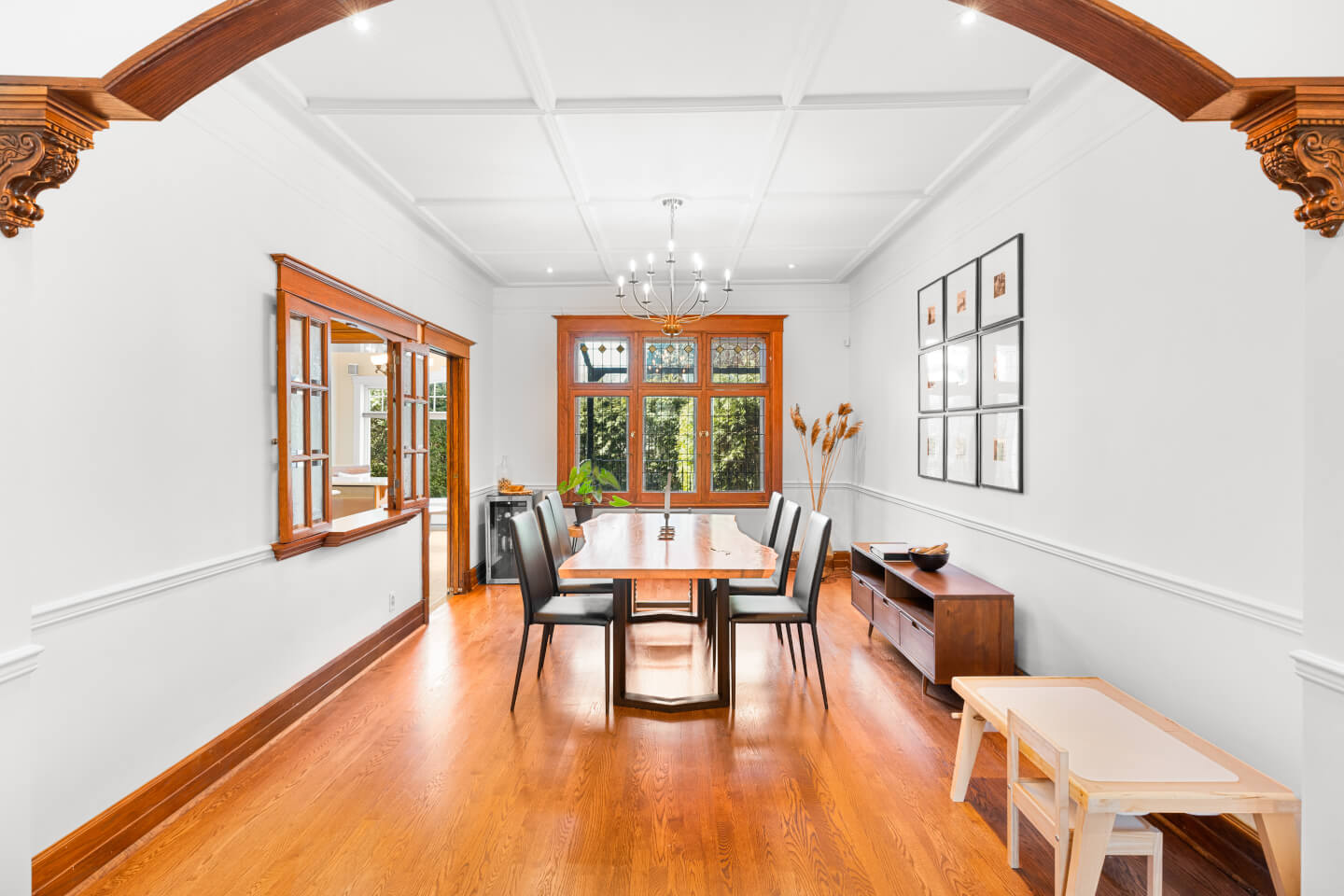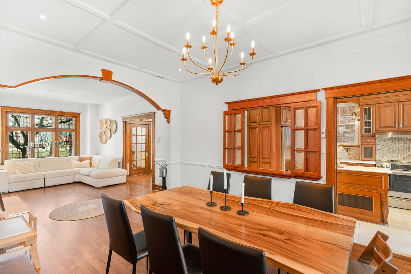 Salon avec foyer d’origine, boiseries et magnifique arche en bois, ouvert sur la salle à manger