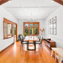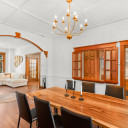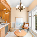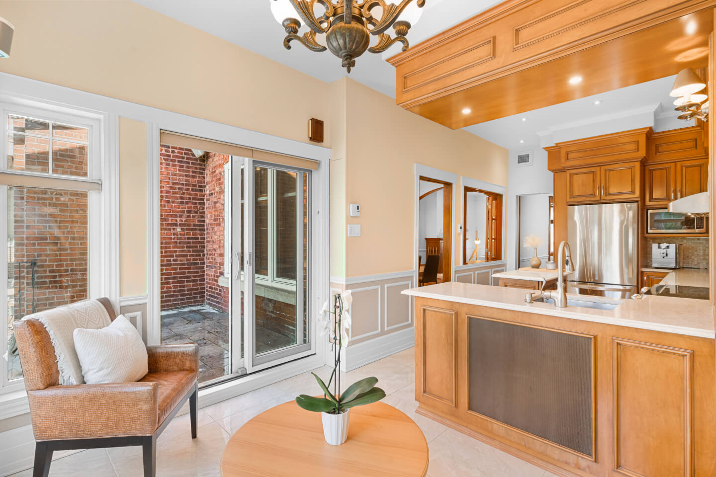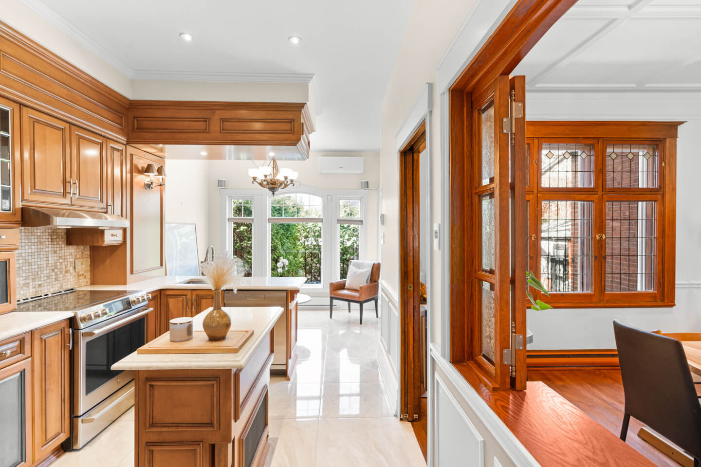 Salle à manger semi-ouverte sur la cuisine avec des magnifiques verres biseautés