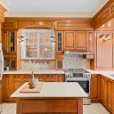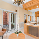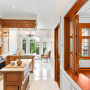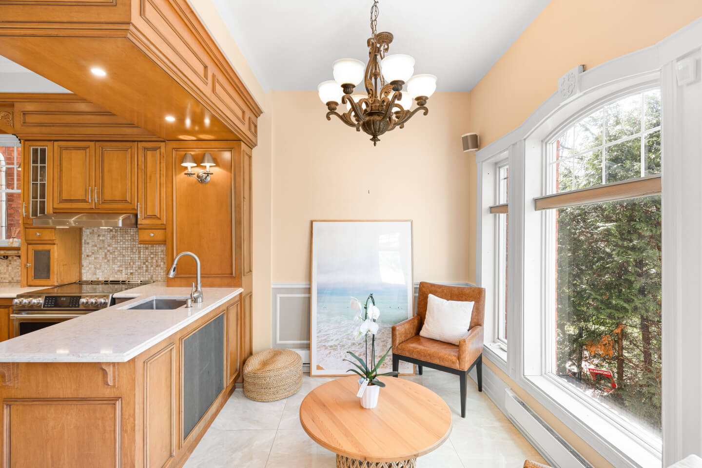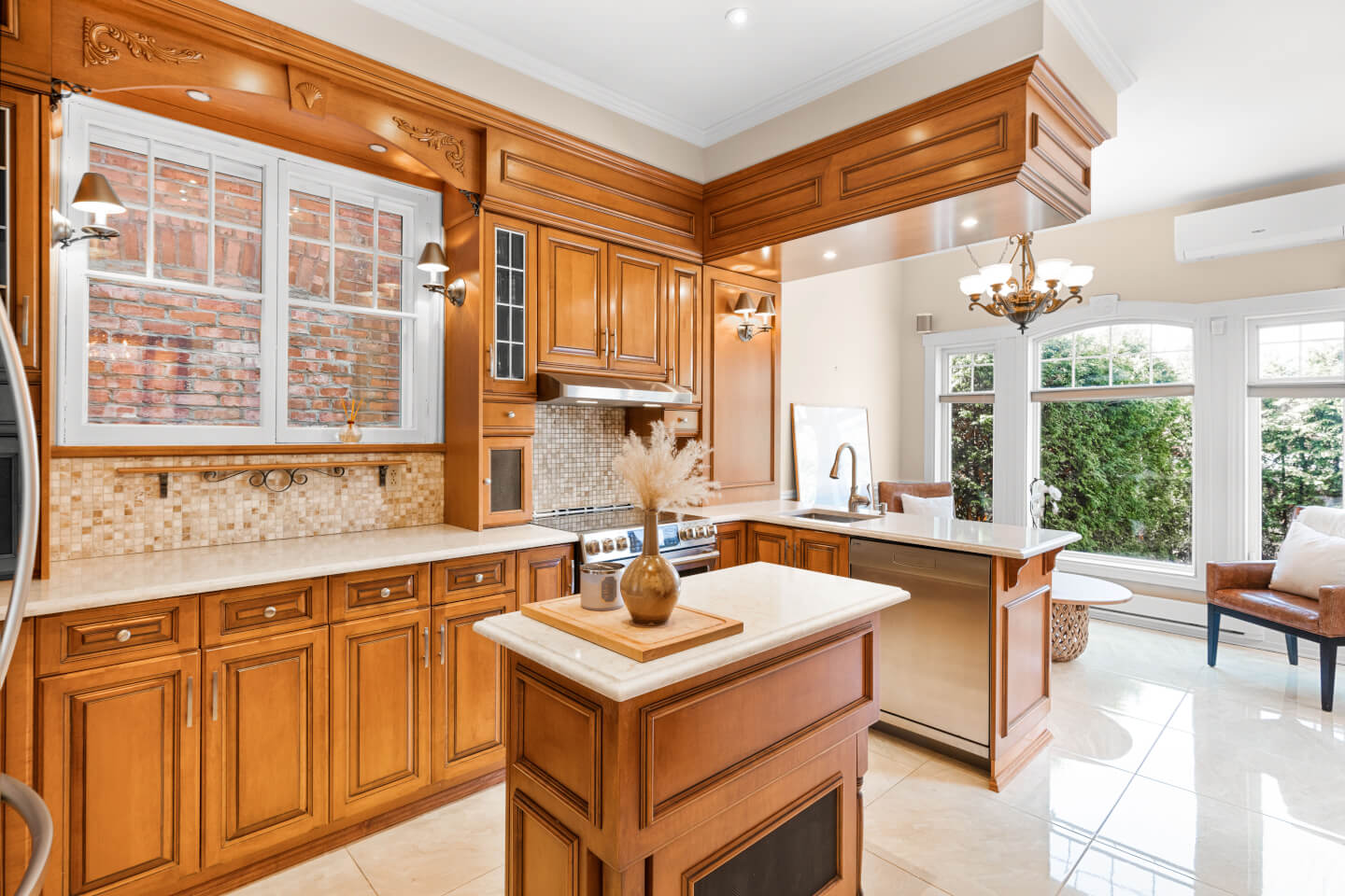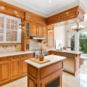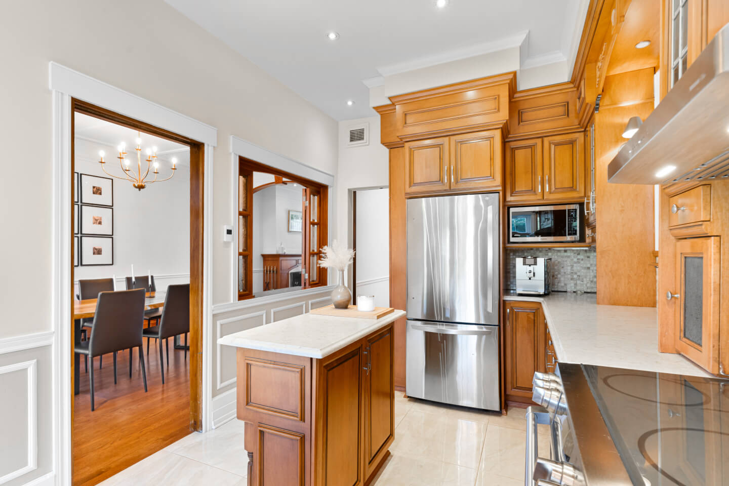 Cuisine avec ilot et comptoir de granit, plancher de céramique chauffante et dinette