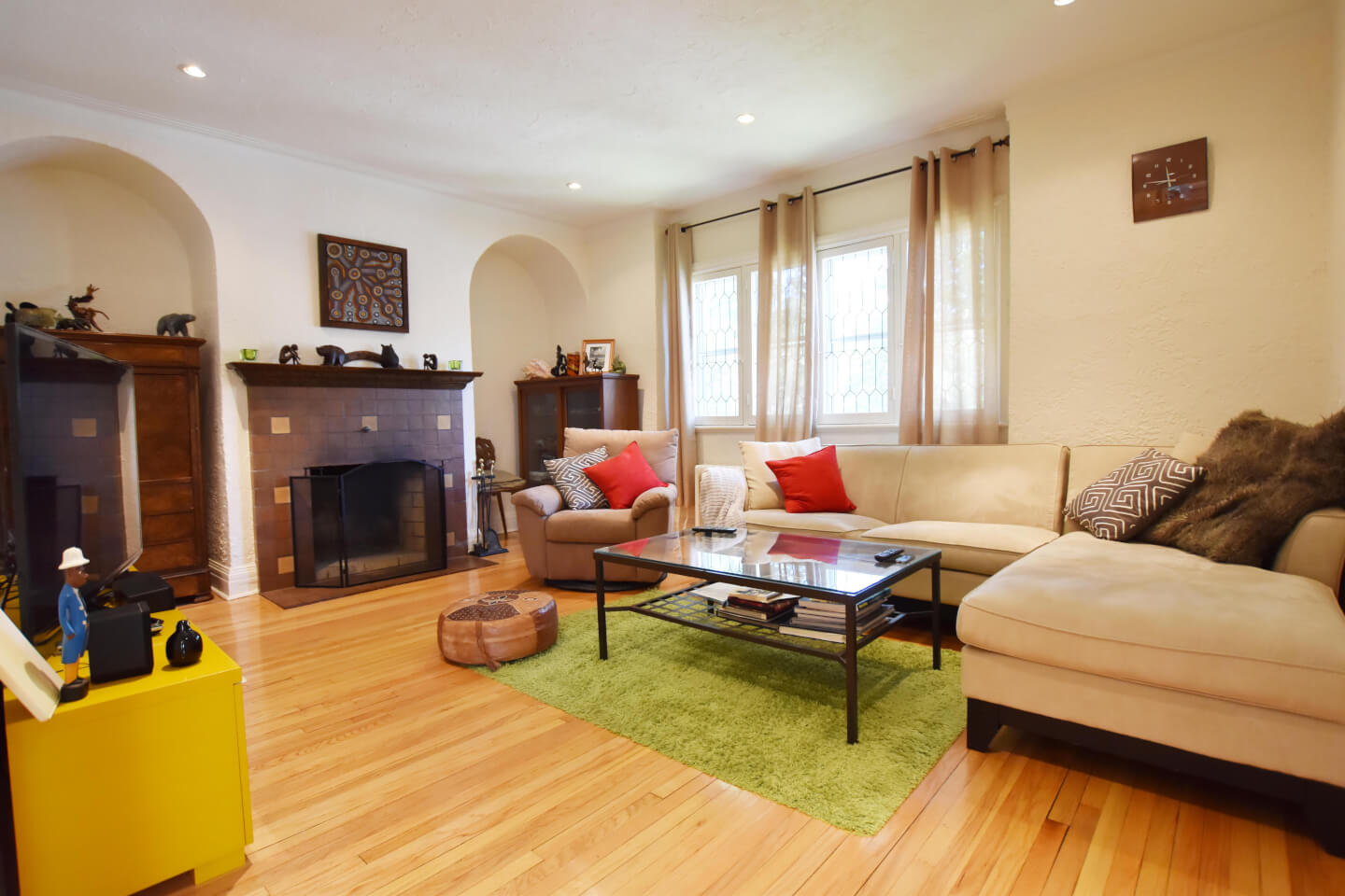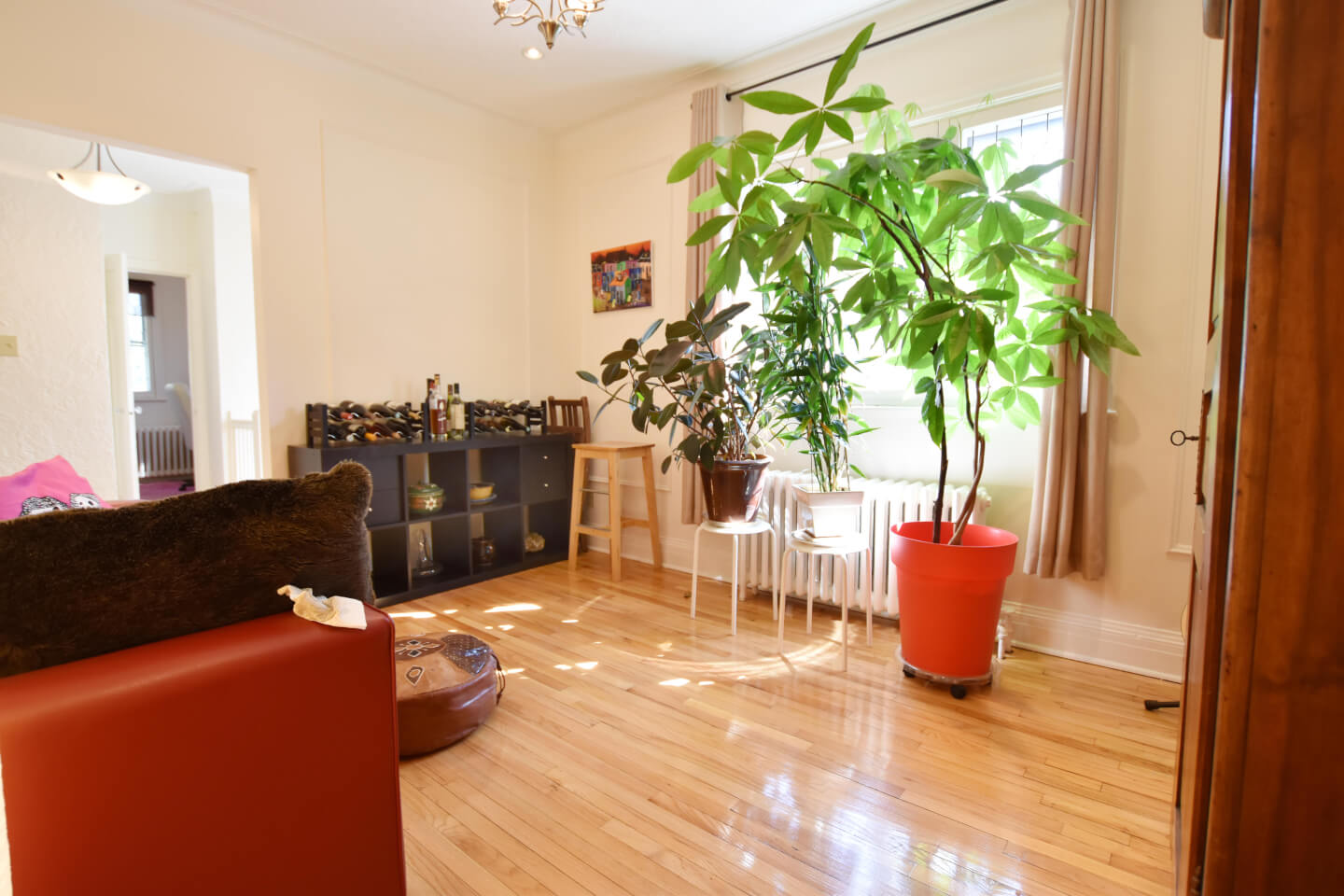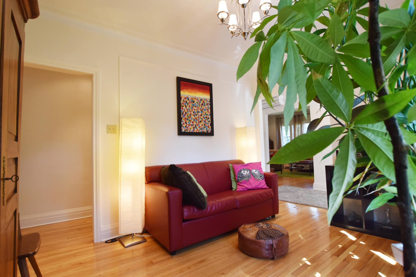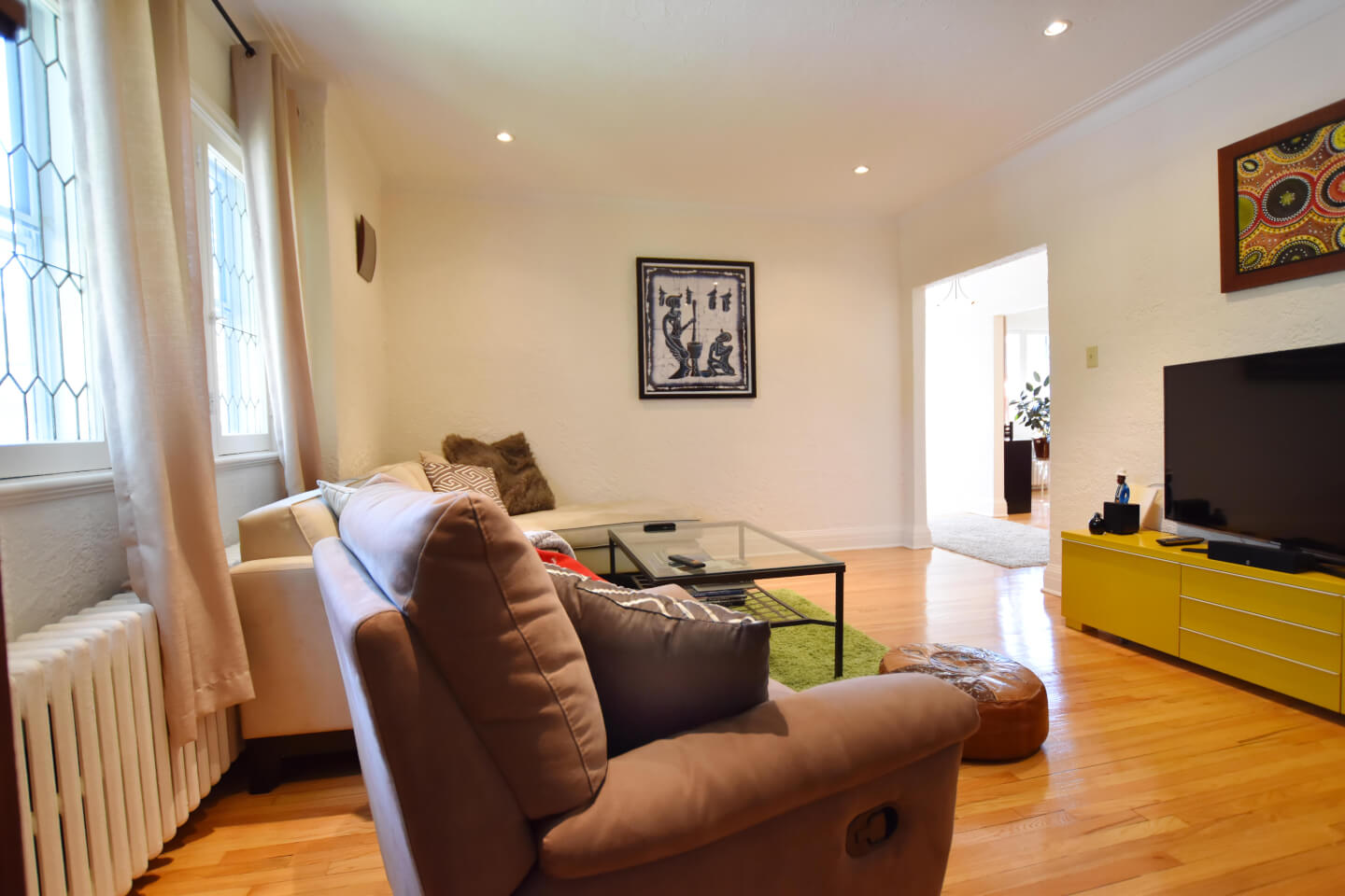 Spacieux salon et salle à manger sur plancher de chêne.