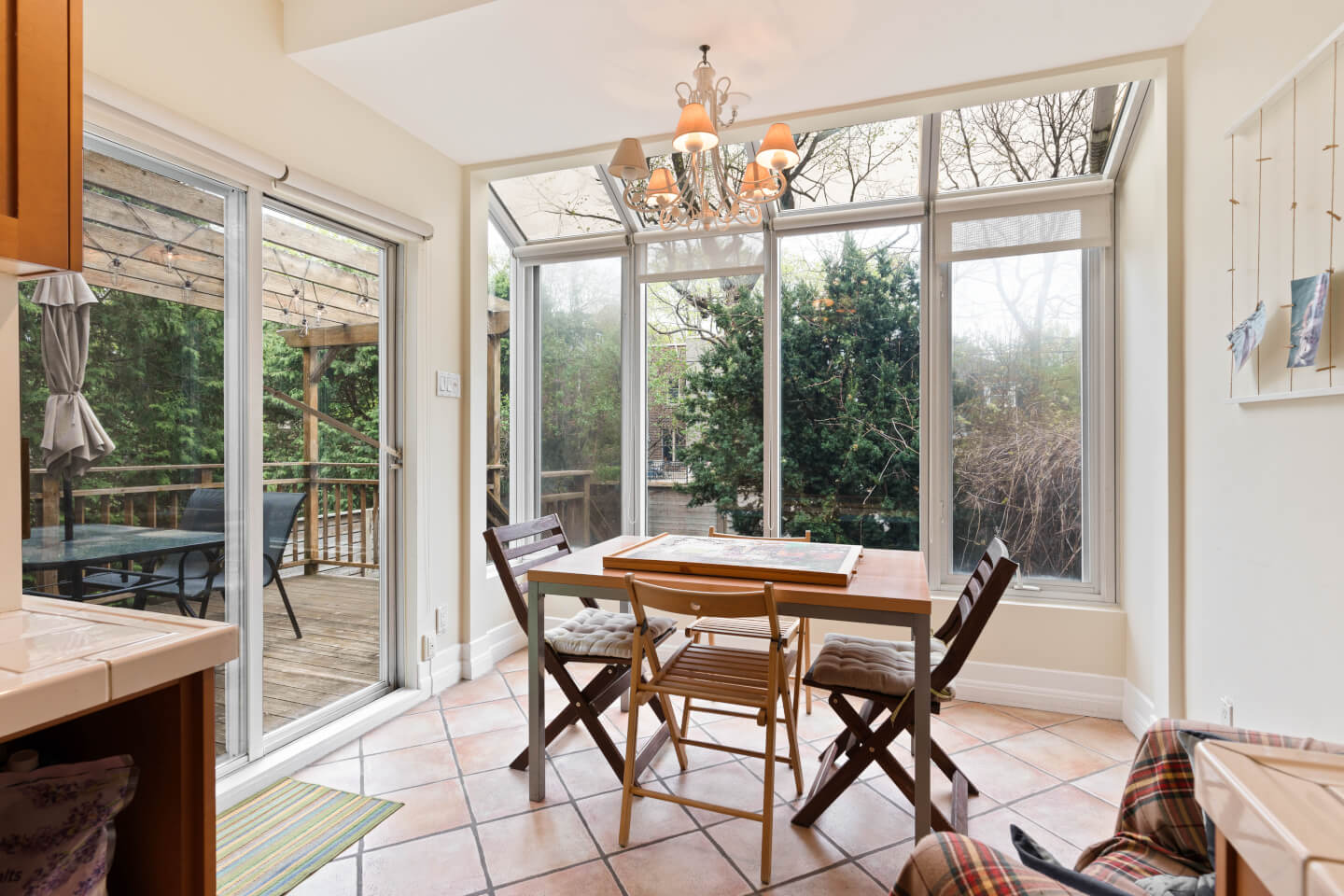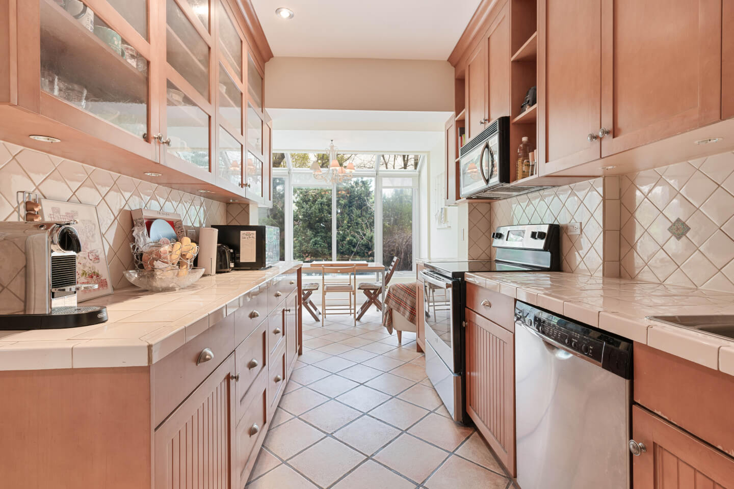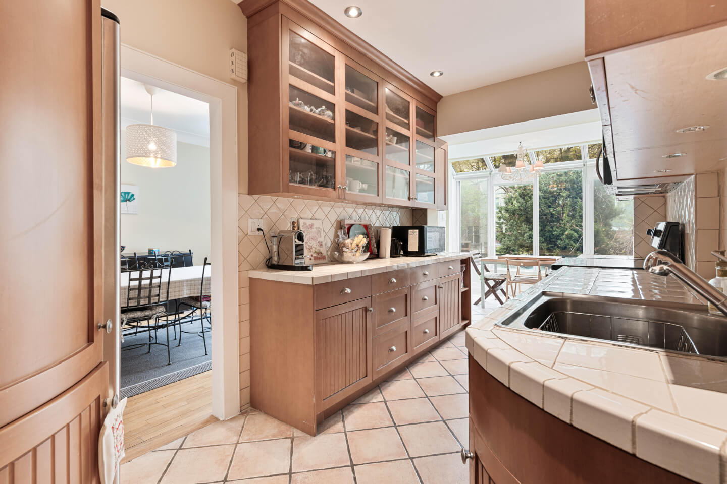 Superbe Cuisine Denis Couture, joliment ouverte sur son coin dînette solarium sur plancher céramique chauffant avec vue sur le jardin côté Ouest; armoires style shaker, comptoir de céramique.