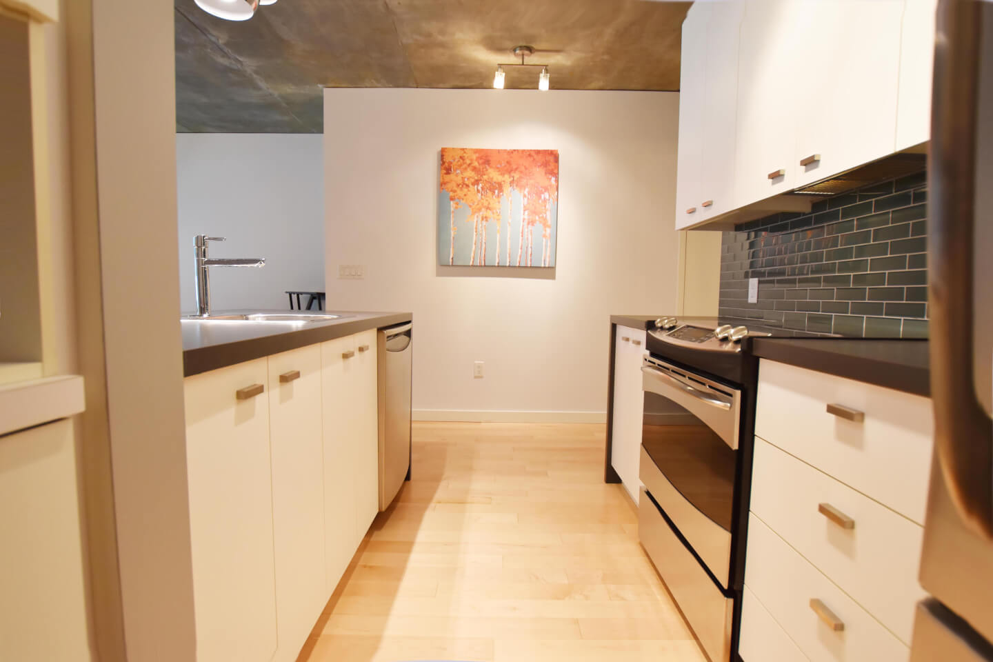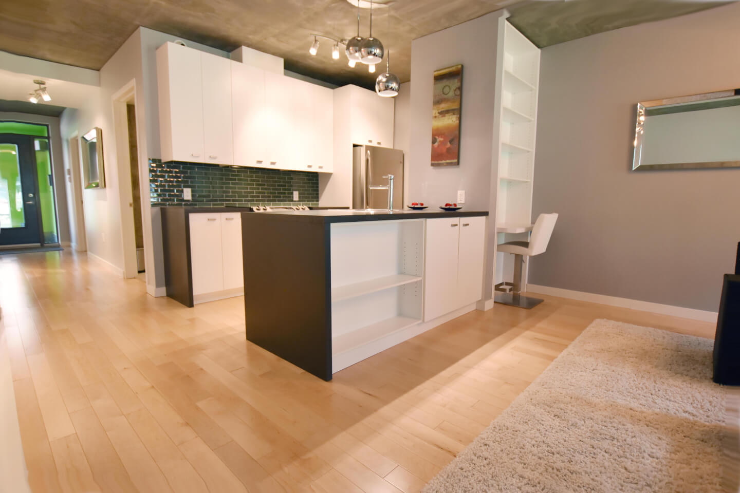 Cuisine, armoires en mélamine, ilot, sur planchers de bois franc d’ingénierie
