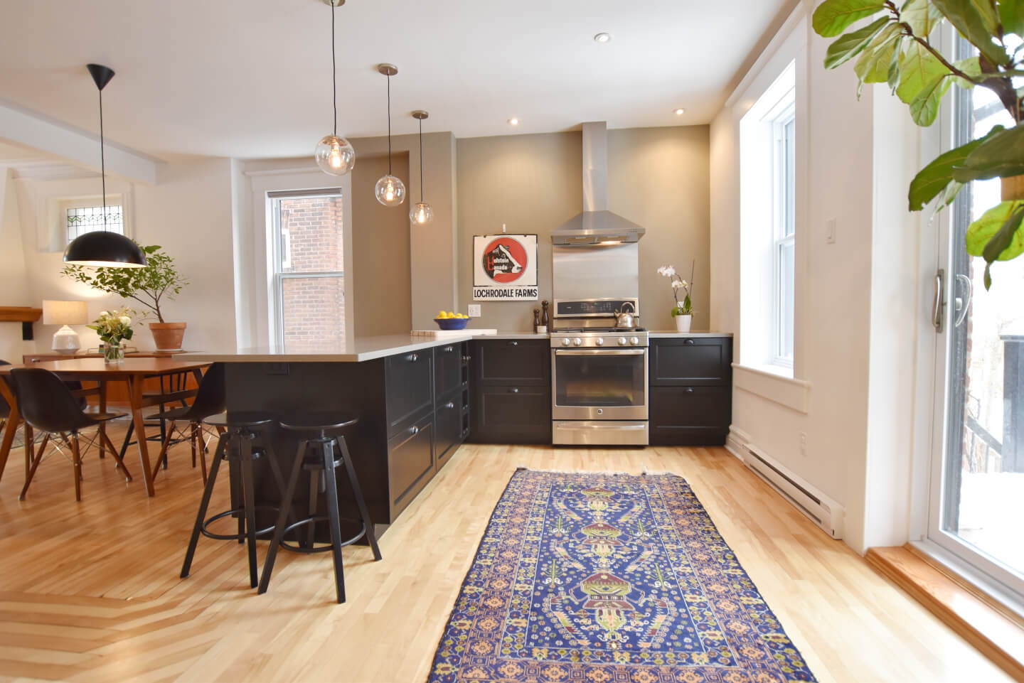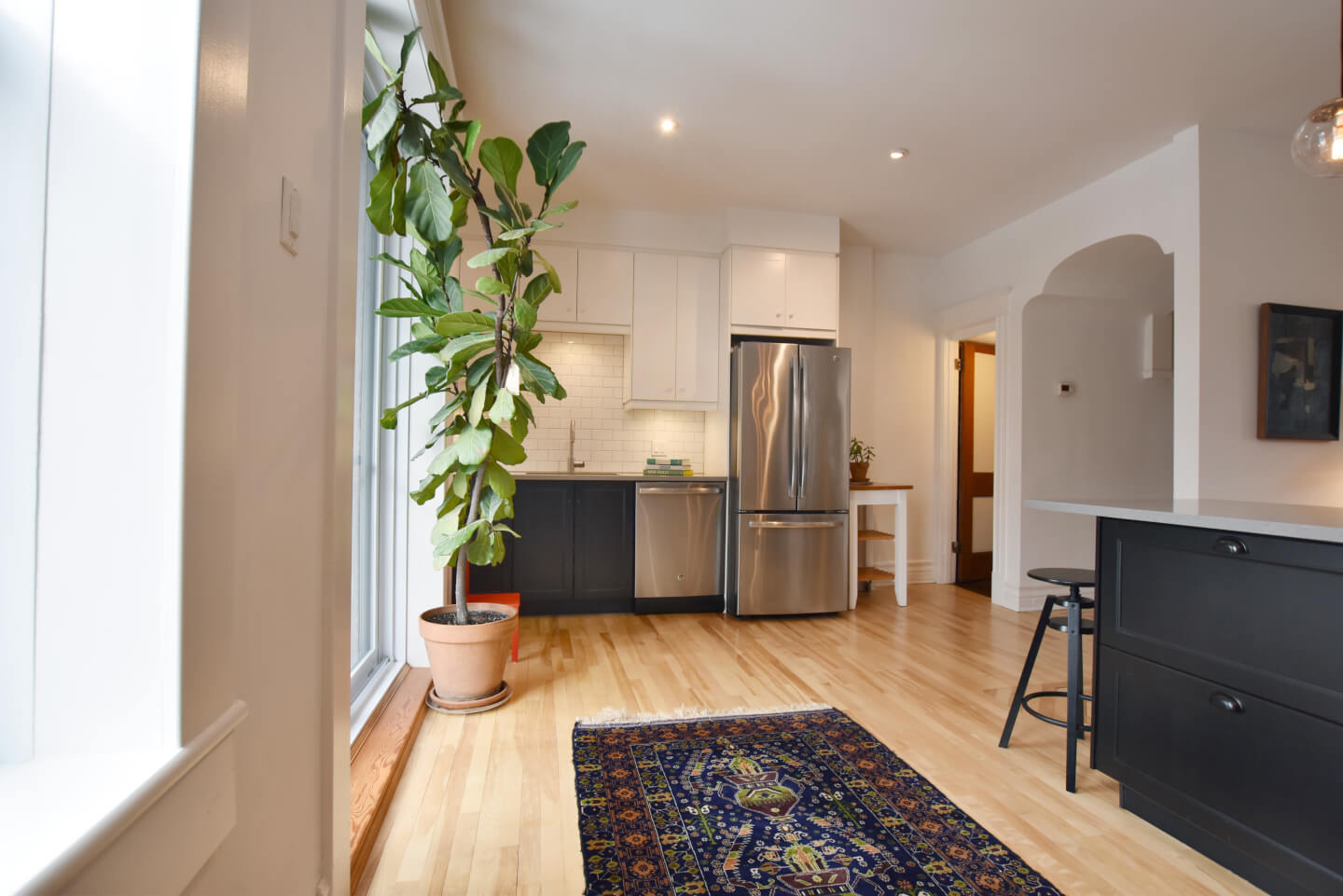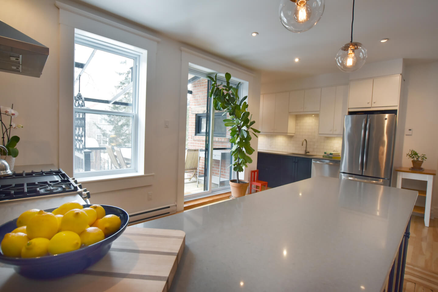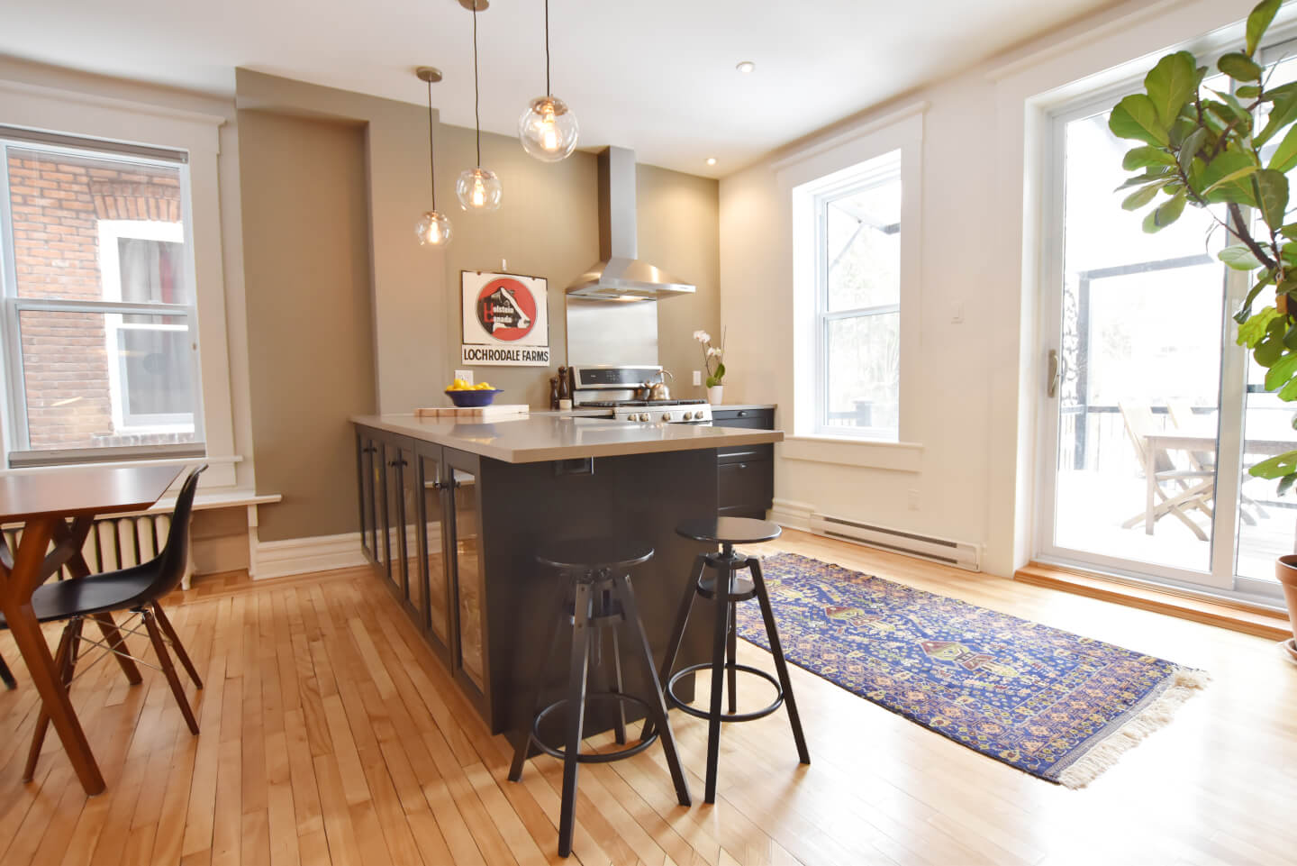 Superbe cuisine (2016), comptoir de quartz, plancher de bois