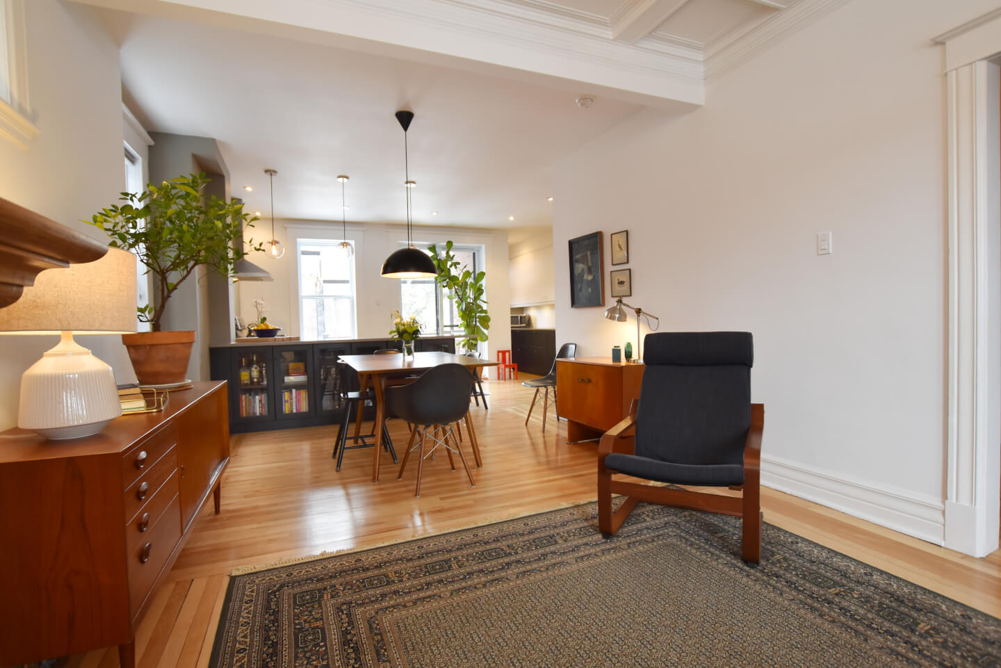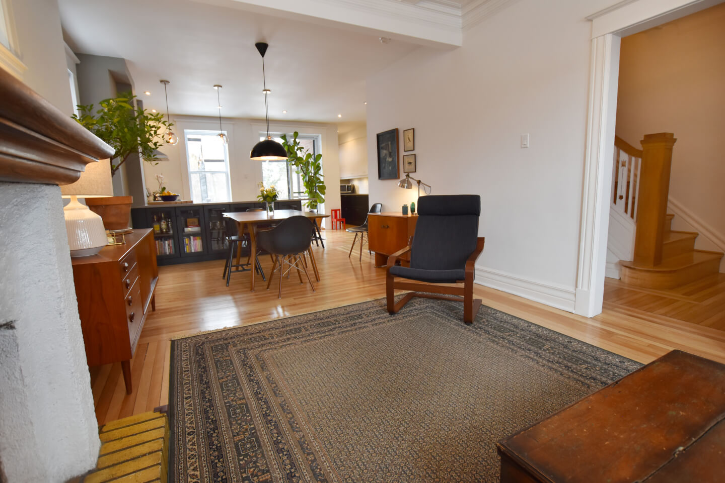 Salon très lumineux avec poutres au plafond ainsi qu’ouvert sur la salle à manger