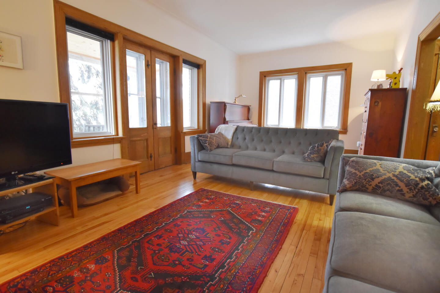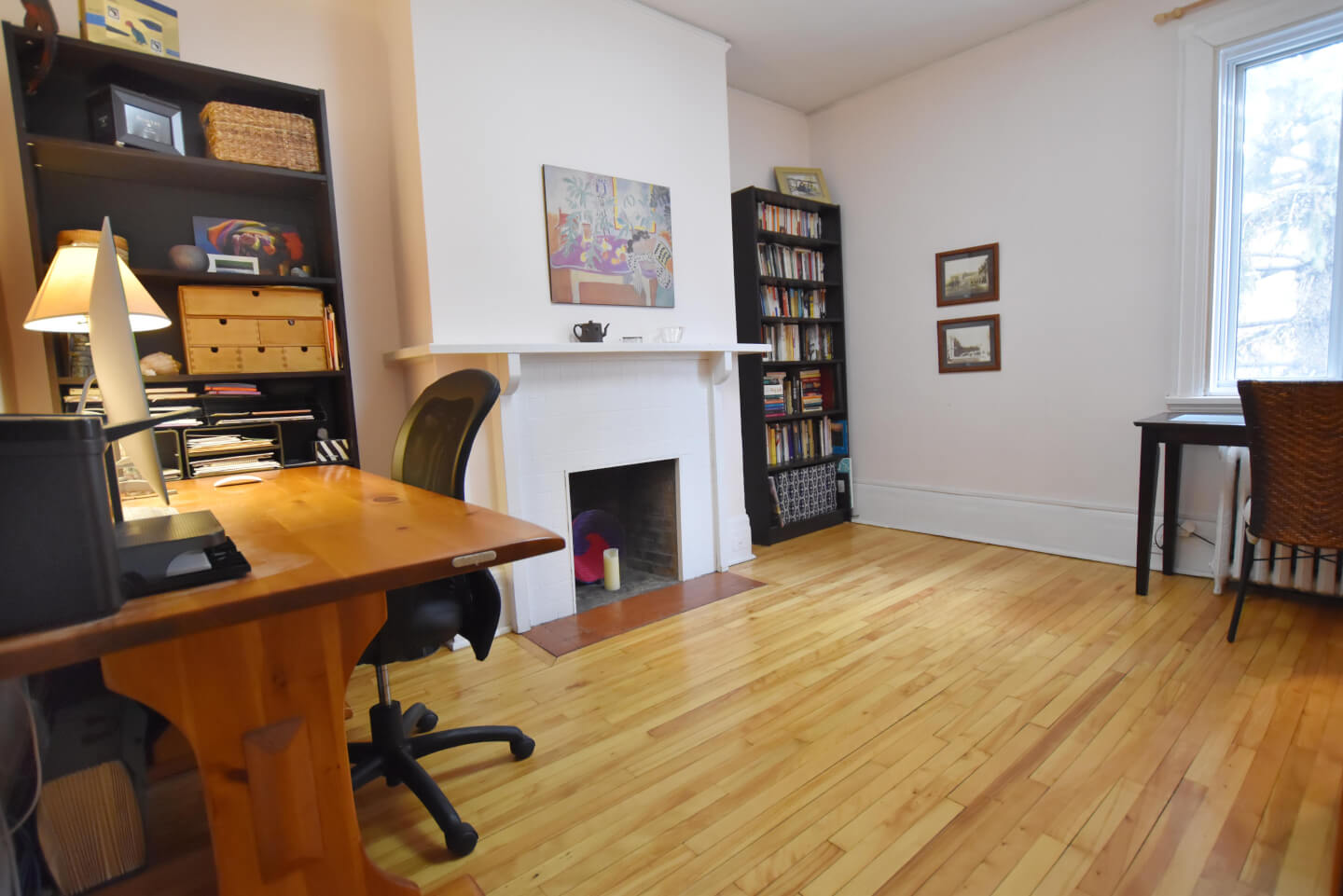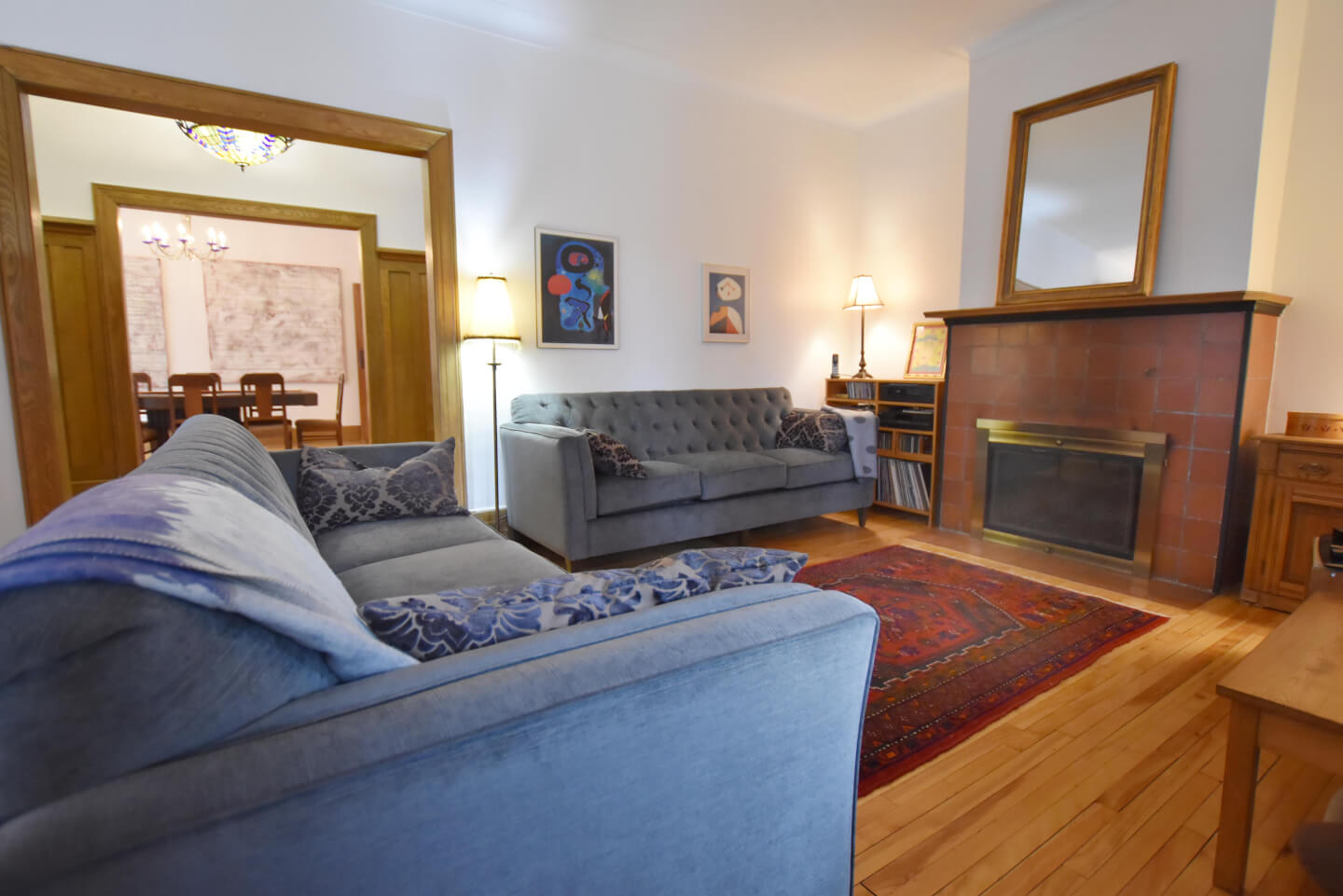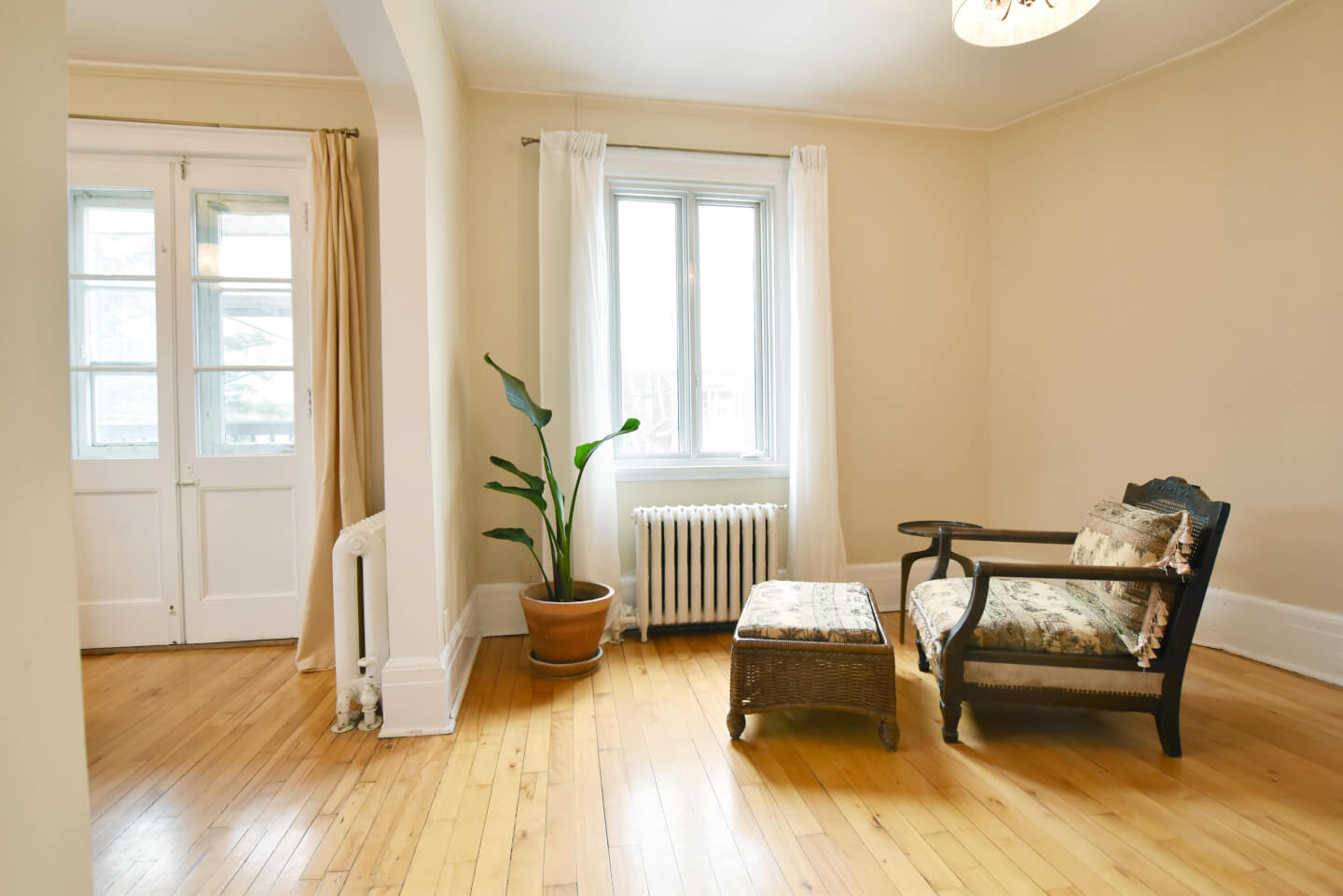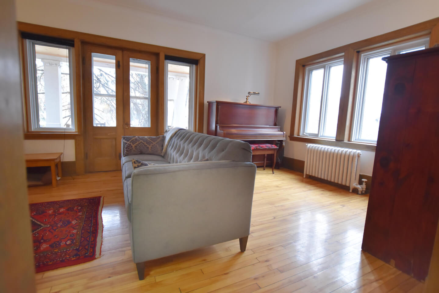 Grand salon rectangulaire avec plusieurs fenêtres et un beau balcon avant (foyer non fonctionnel selon la règlementation de la Ville de Montréal)