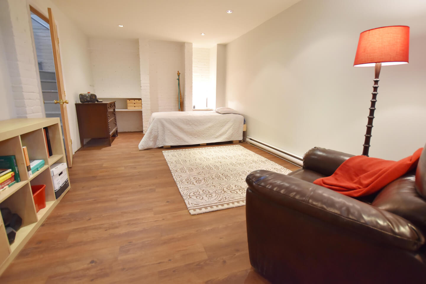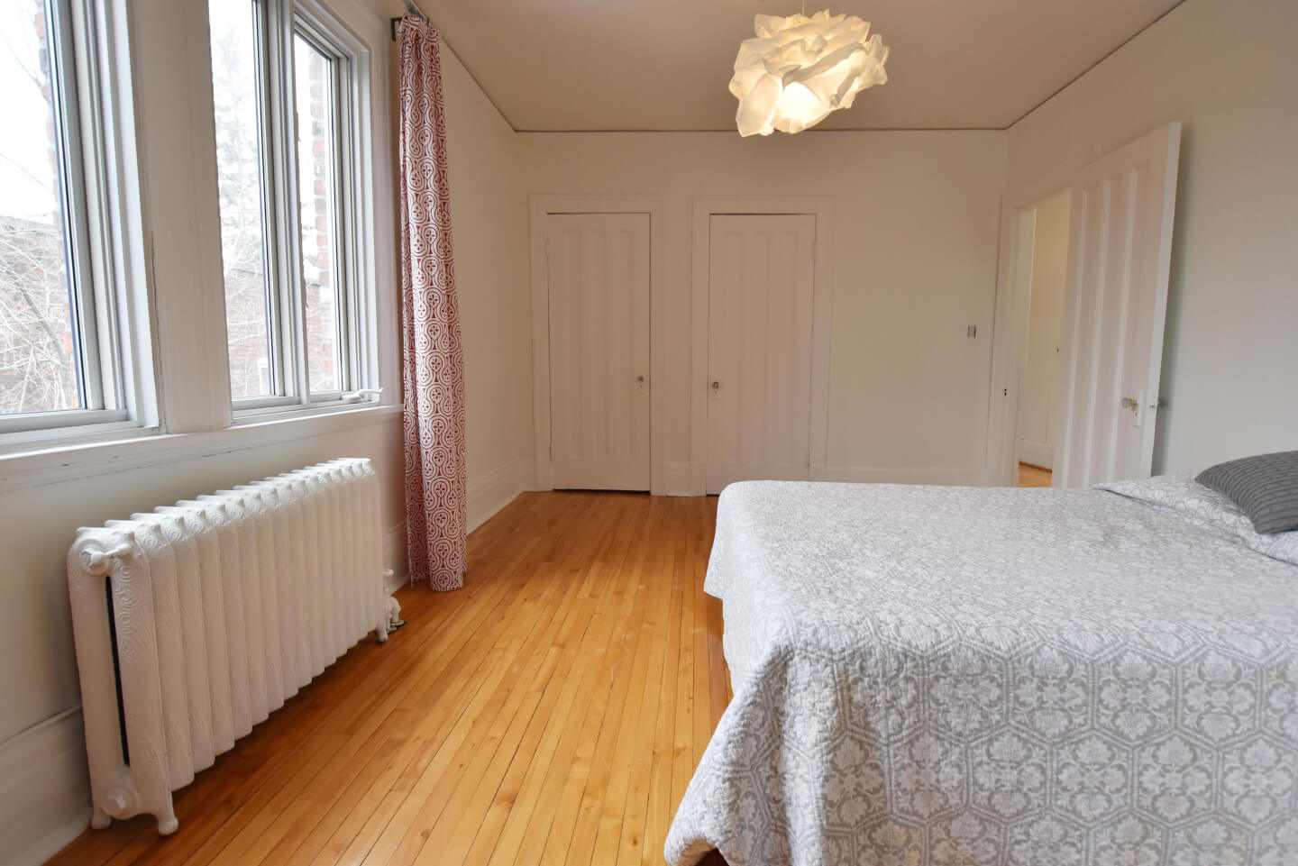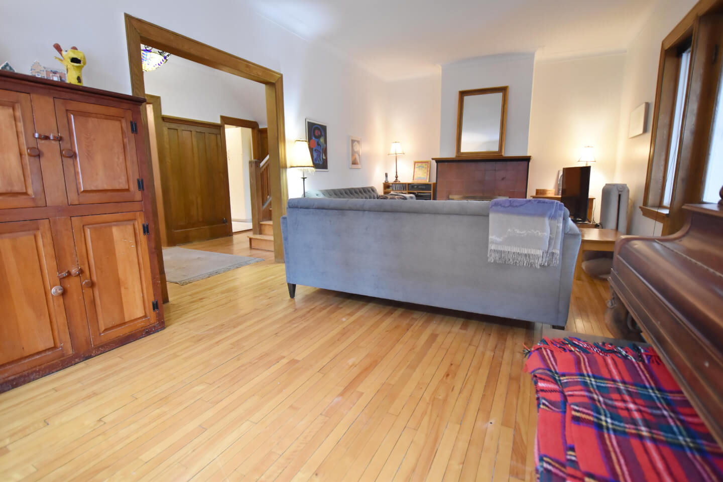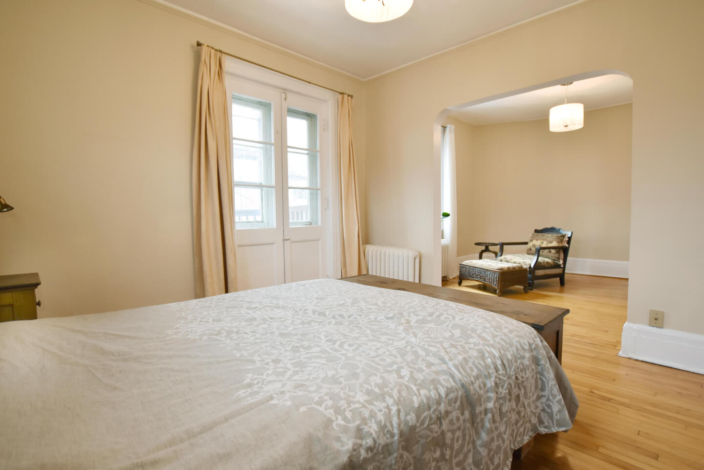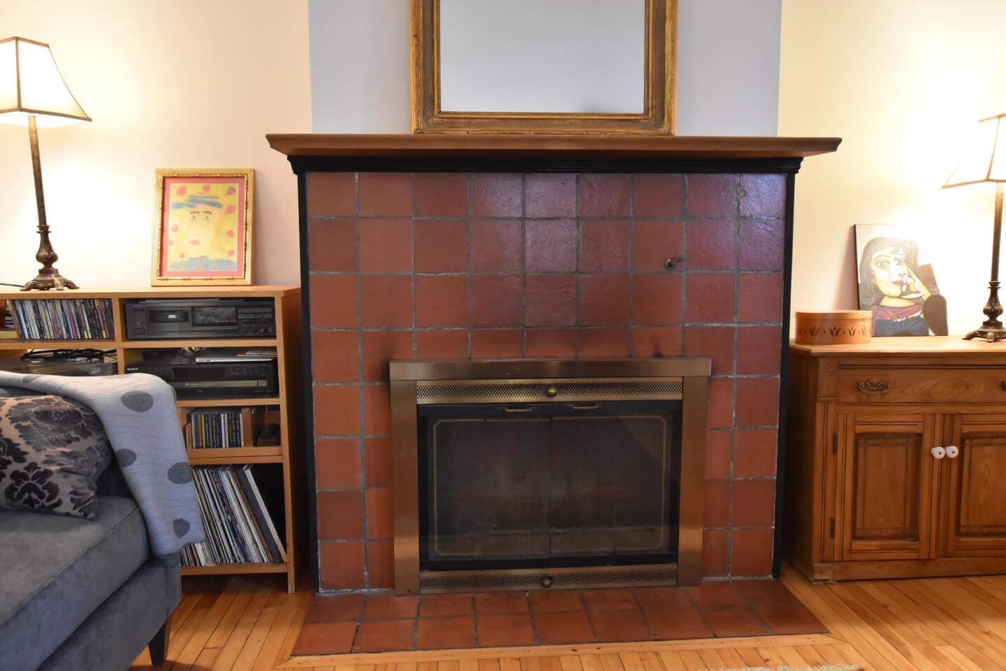 Grand salon rectangulaire avec plusieurs fenêtres et un beau balcon avant (foyer non fonctionnel selon la règlementation de la Ville de Montréal)