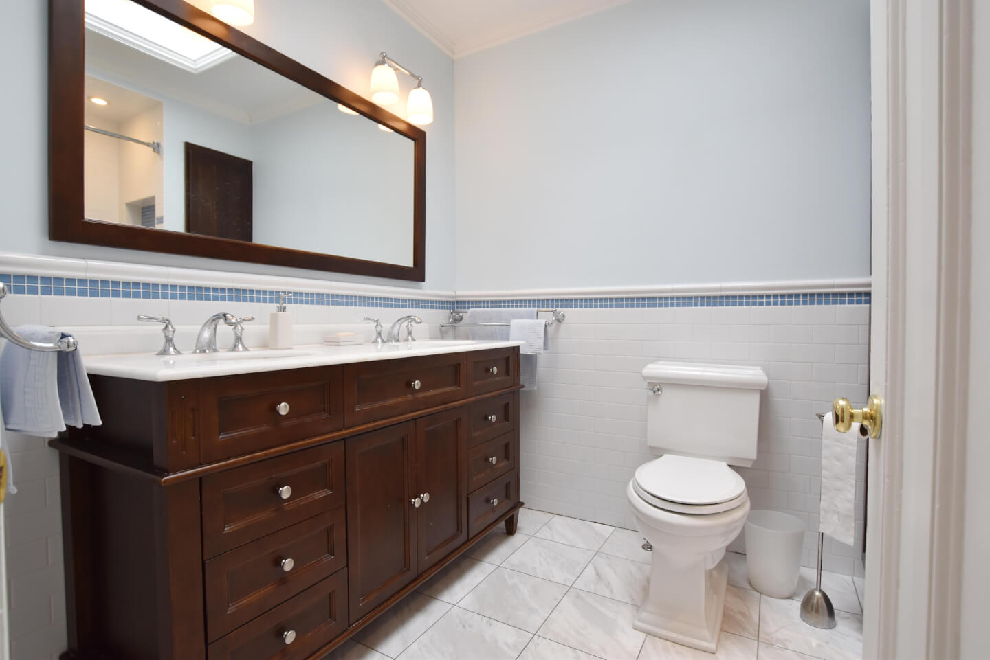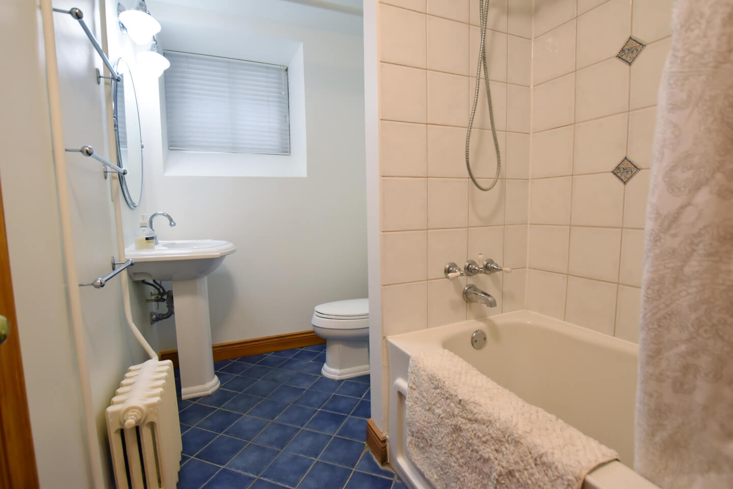 Jolie salle de bains, avec plancher radiant et puits de lumière