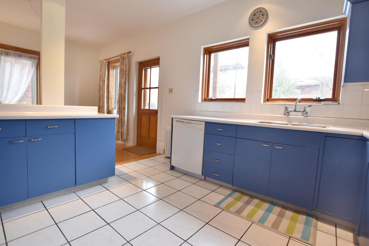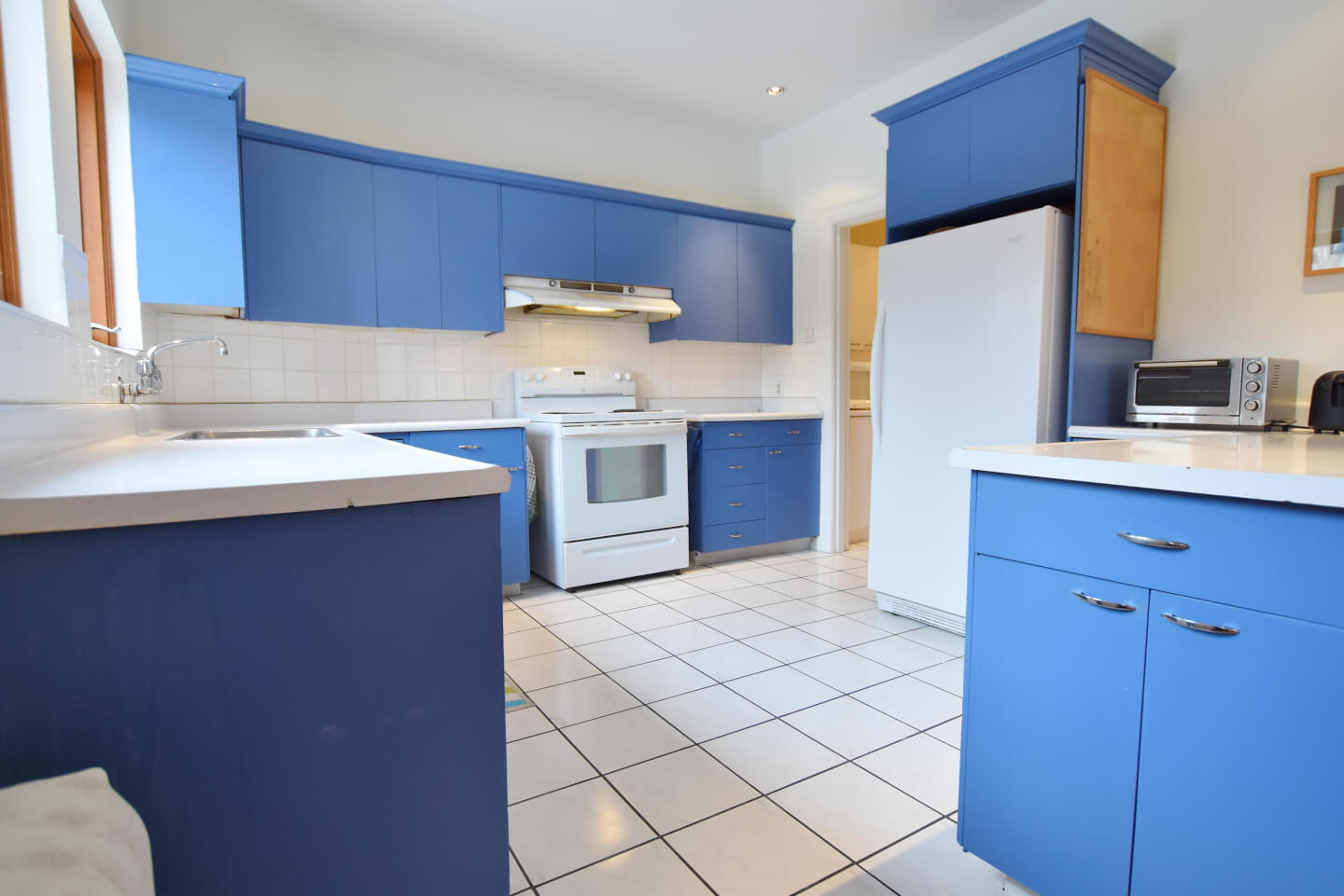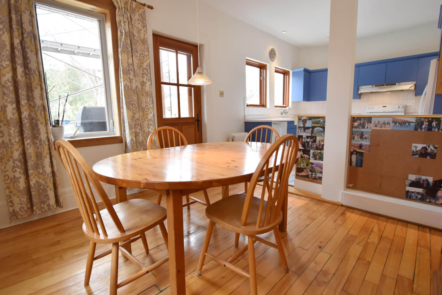 Extra grande cuisine lumineuse (plancher de céramique) à plan ouvert sur la dînette (plancher de bois), accès à la terrasse et jardin