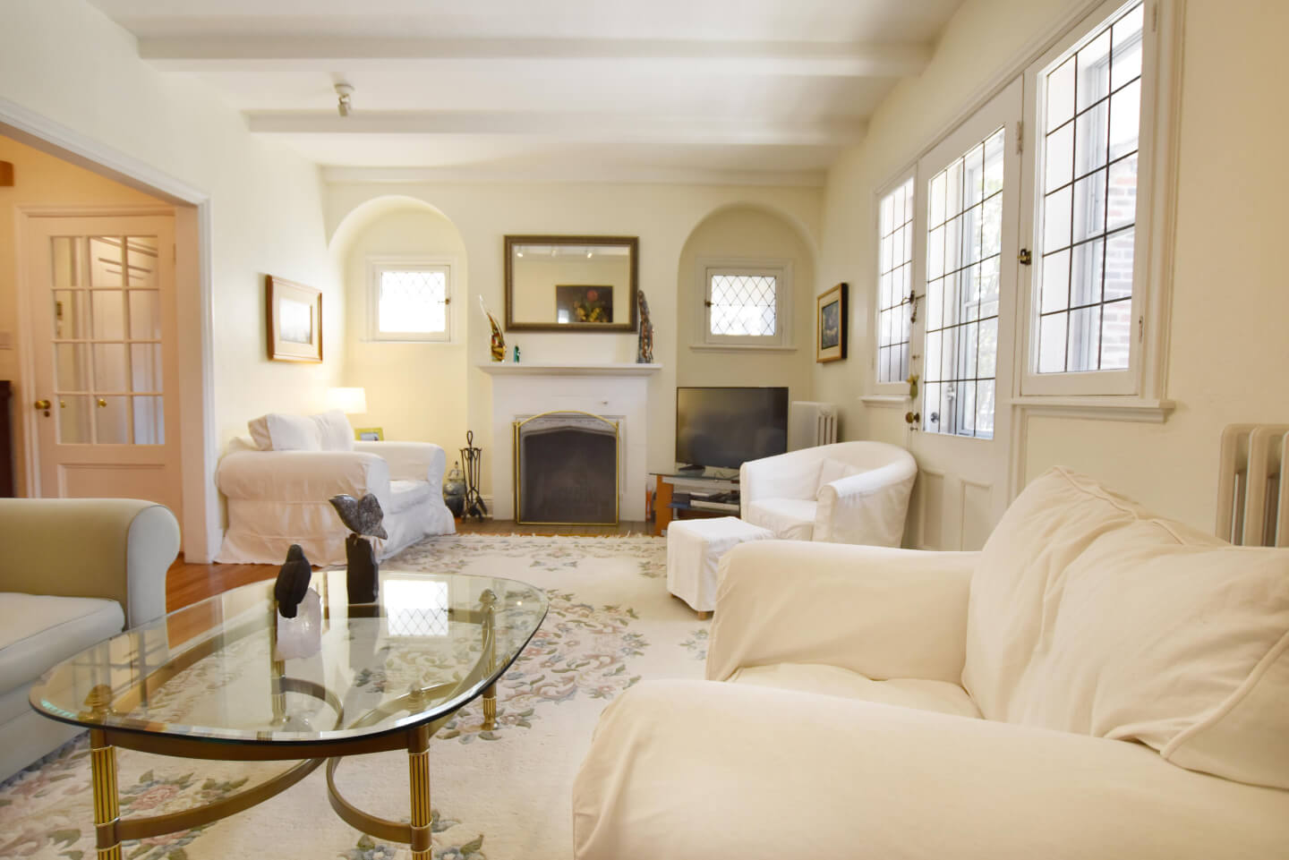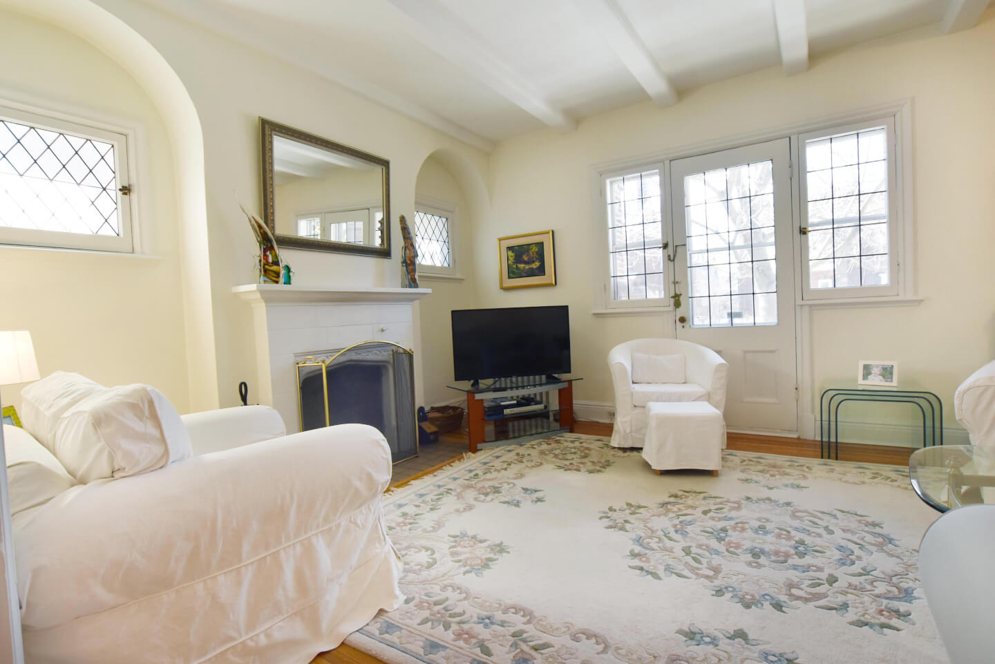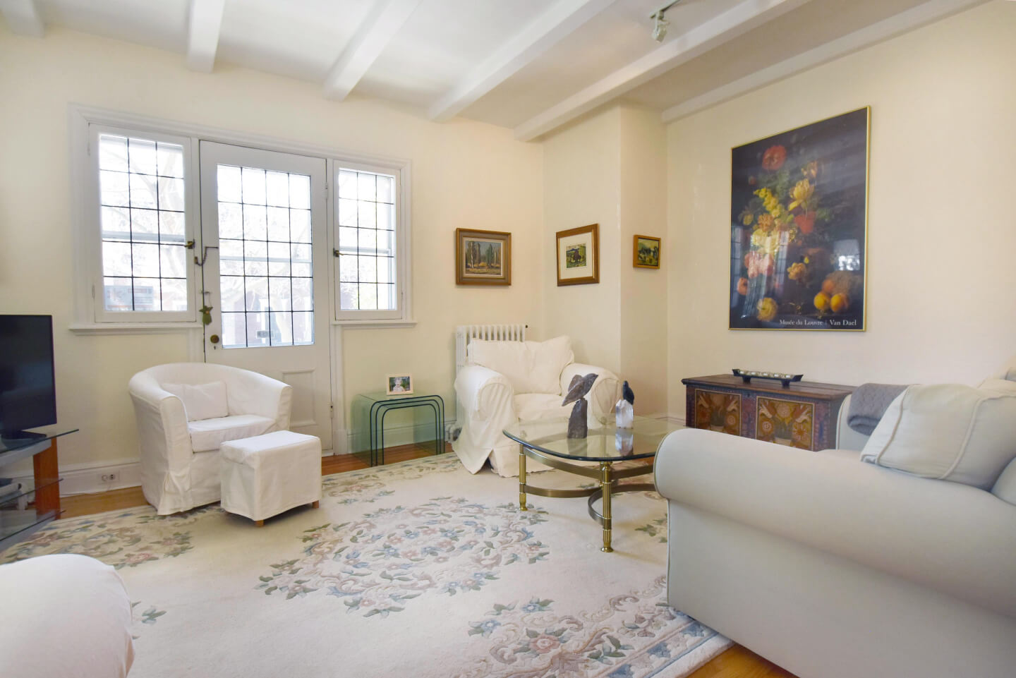 Unique salon avec ses poutres aux plafonds et un balcon avant