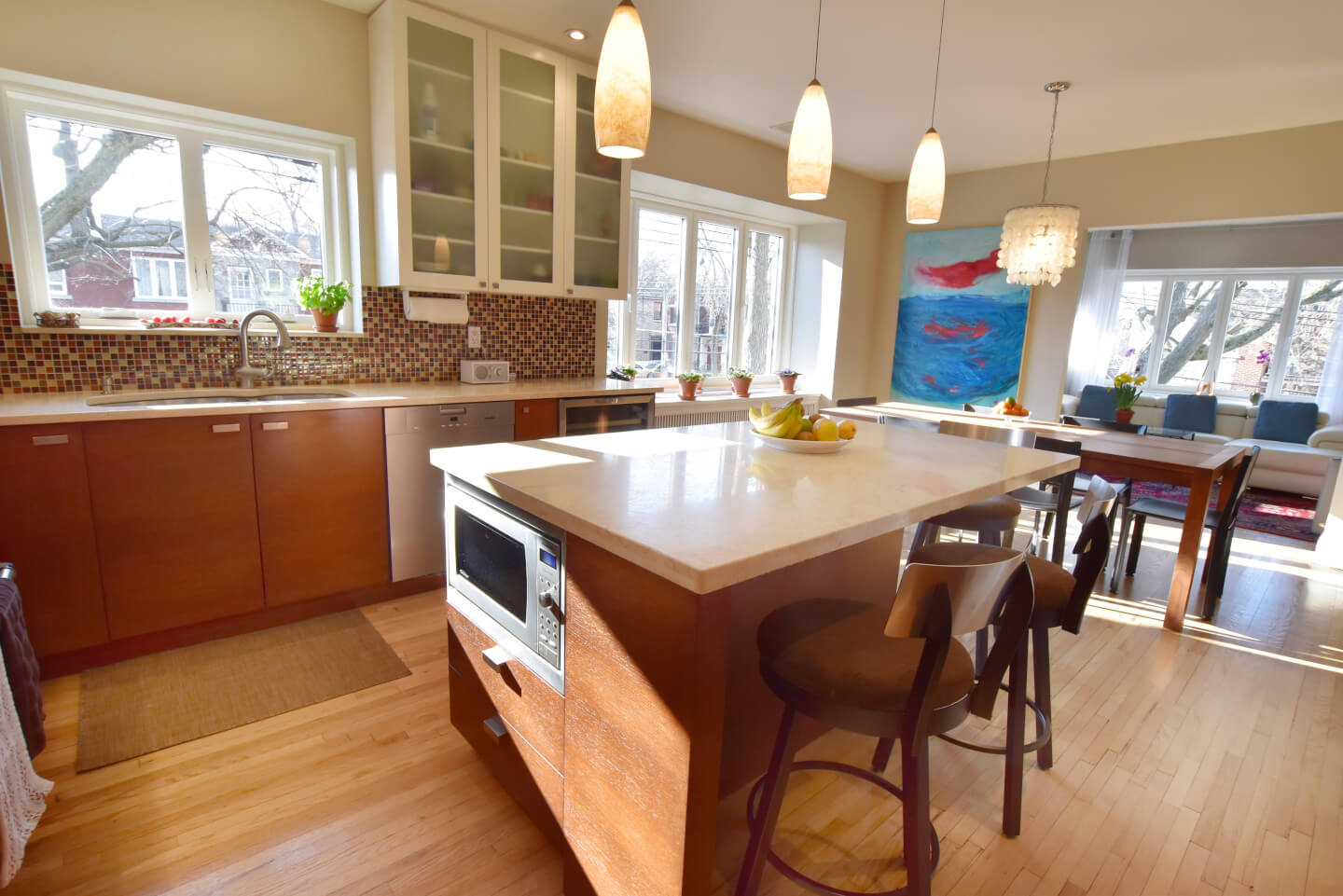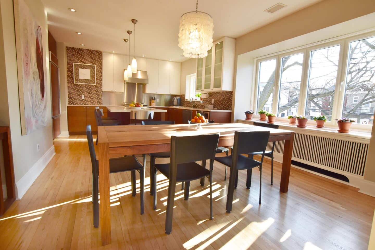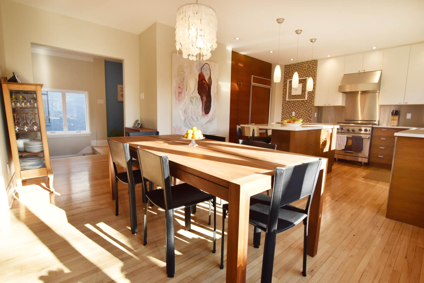 Grande fenestration à la salle à manger, ouverte sur la cuisine