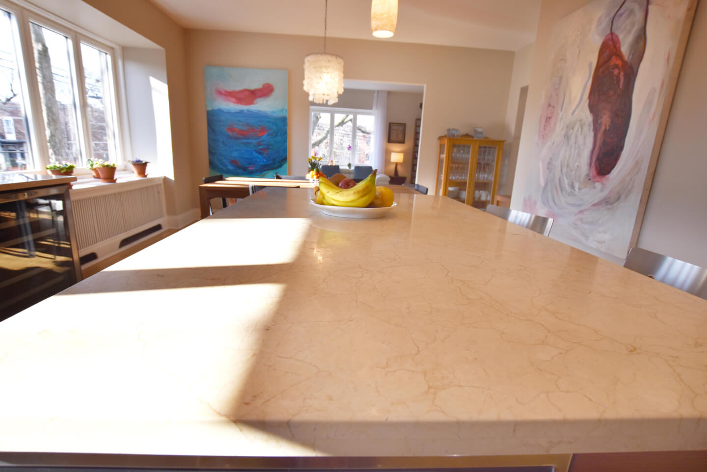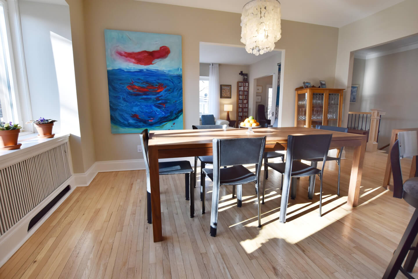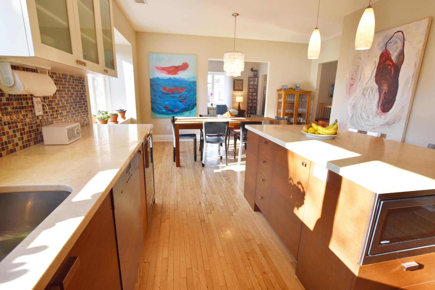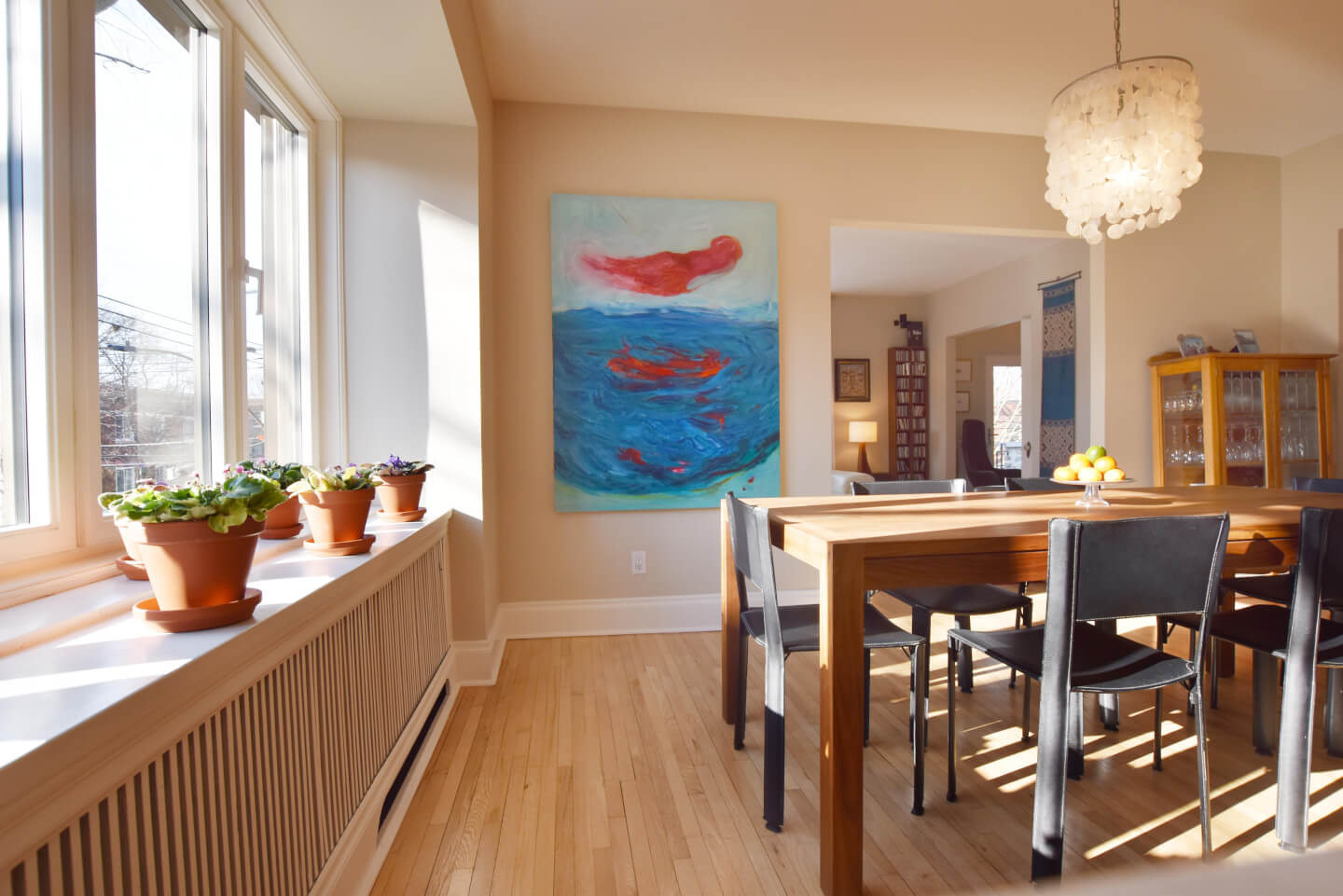 Grande fenestration à la salle à manger, ouverte sur la cuisine