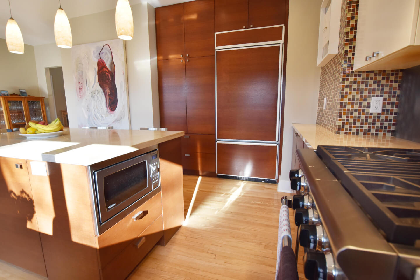 Superbe grande cuisine 2010, comptoir de marbre, appareils ménagers haut de gamme, cuisinière au gaz, cellier, Îlot central, comptoir bar déjeuner et plancher de bois