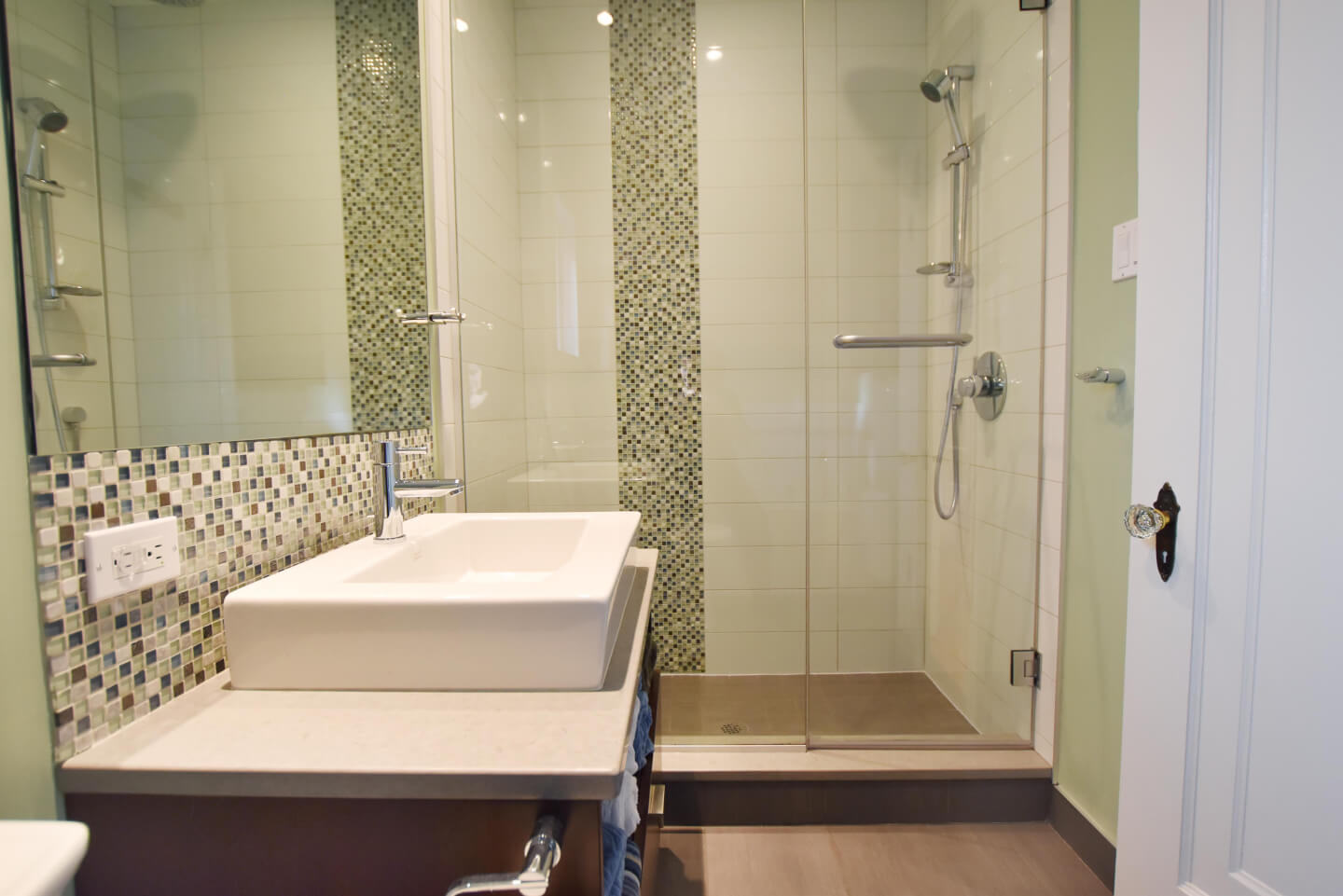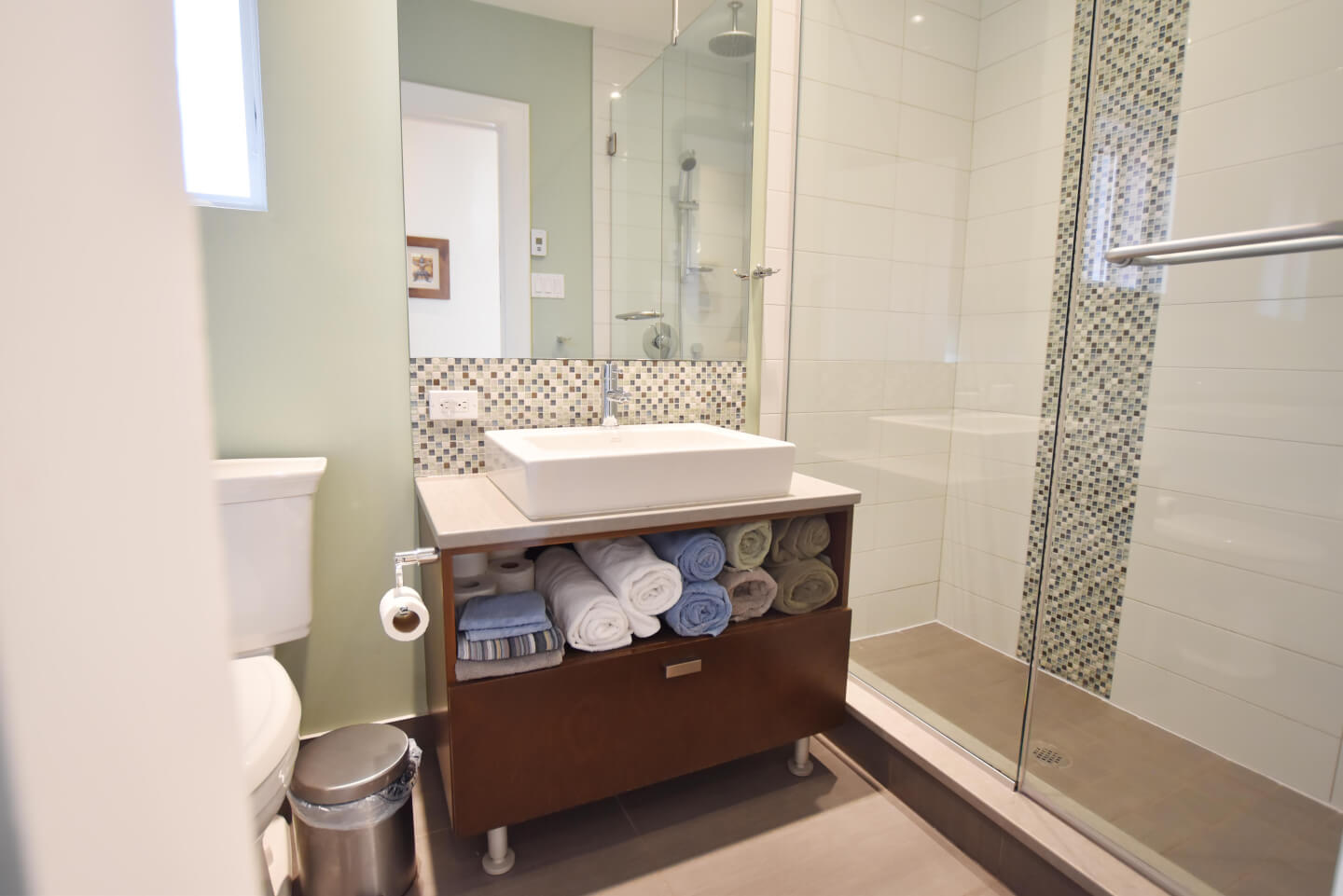 Superbe salle de bains, grande douche vitrée et baignoire séparée, plancher radiant