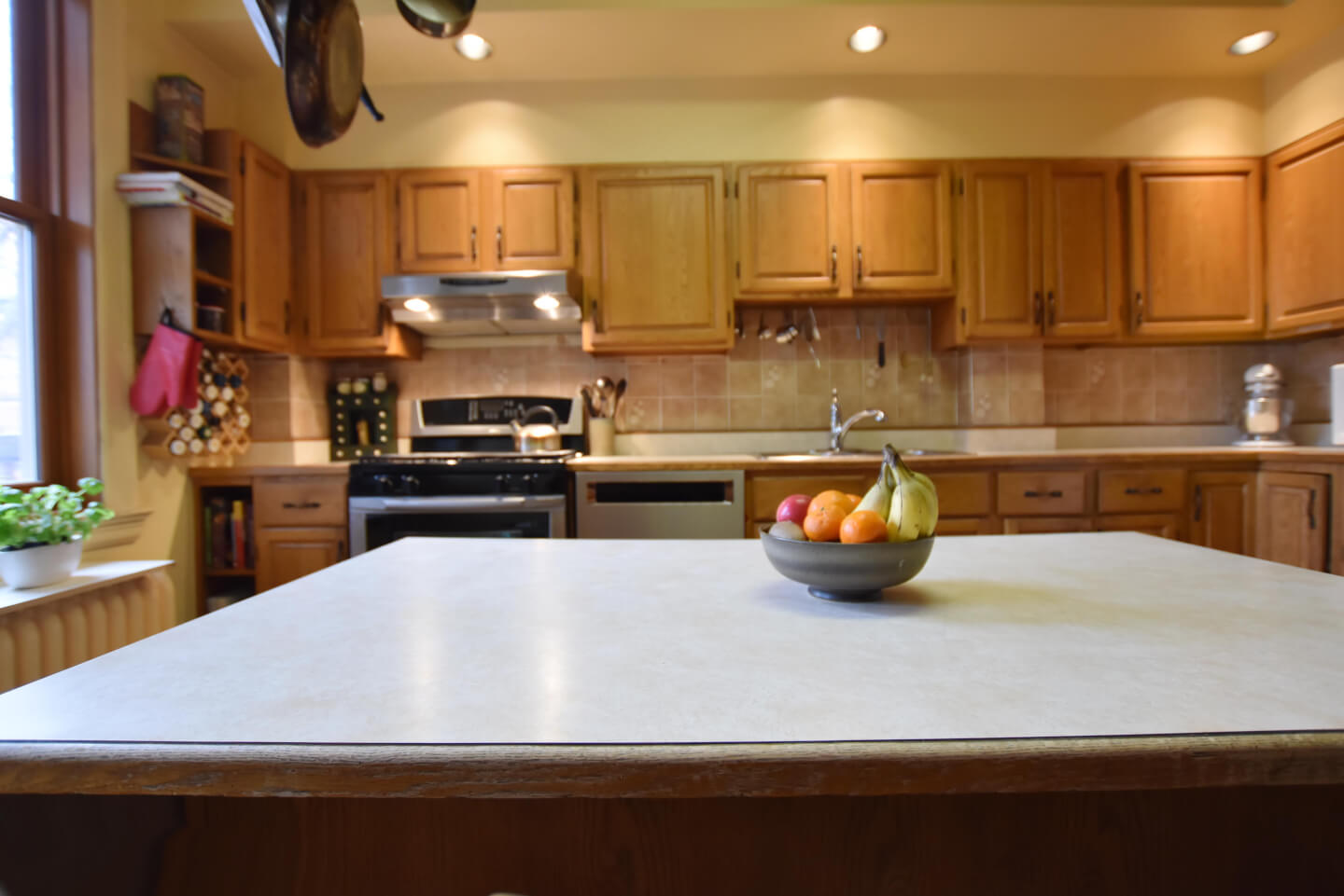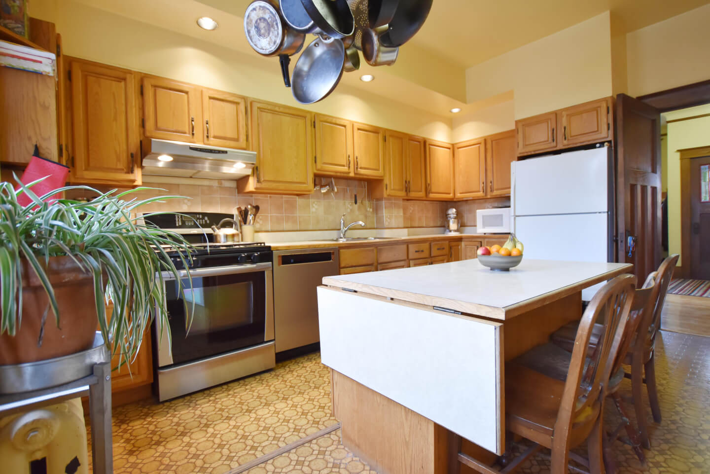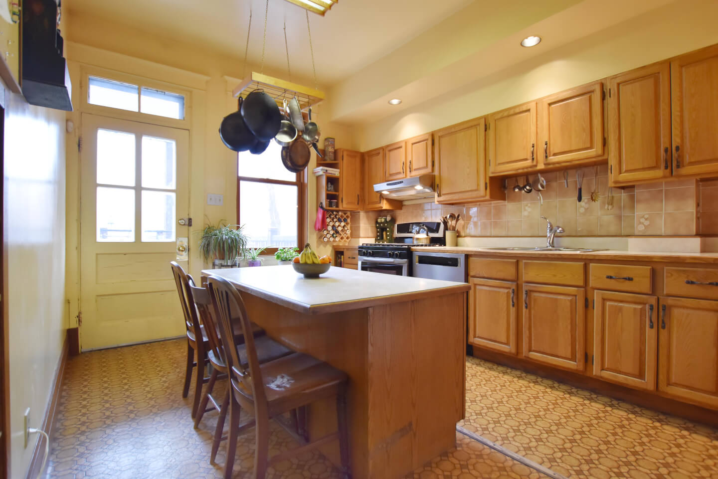 Cuisine modeste, armoires de chêne, plancher linoléum